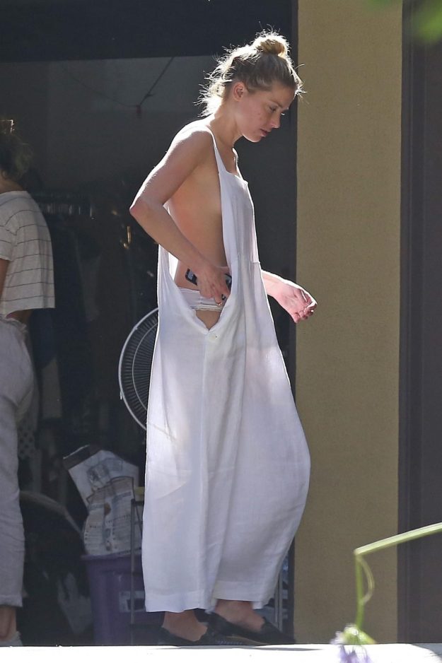 Actress Amber Heard was observed cleaning out her garage in LA, 07/29/2018. Amber who was sporting a white gown and no bra as she experienced a wardrobe malfunction and exposed her tits as she bent around. The lower slash dress showed off her white panties. Listened to seemed to be acquiring an acne breakouts breakout as she was wearing no make-up at her house.
