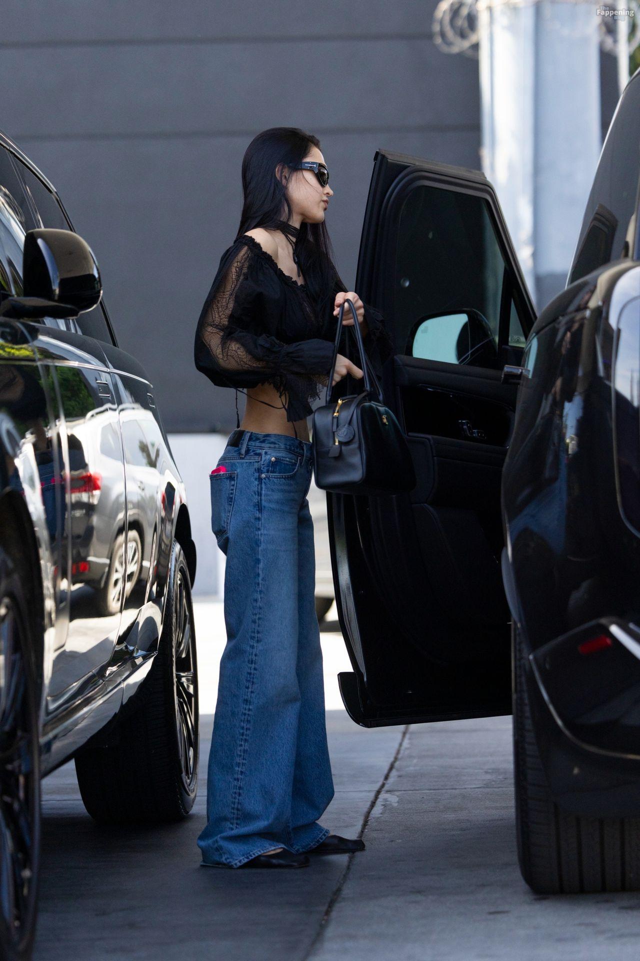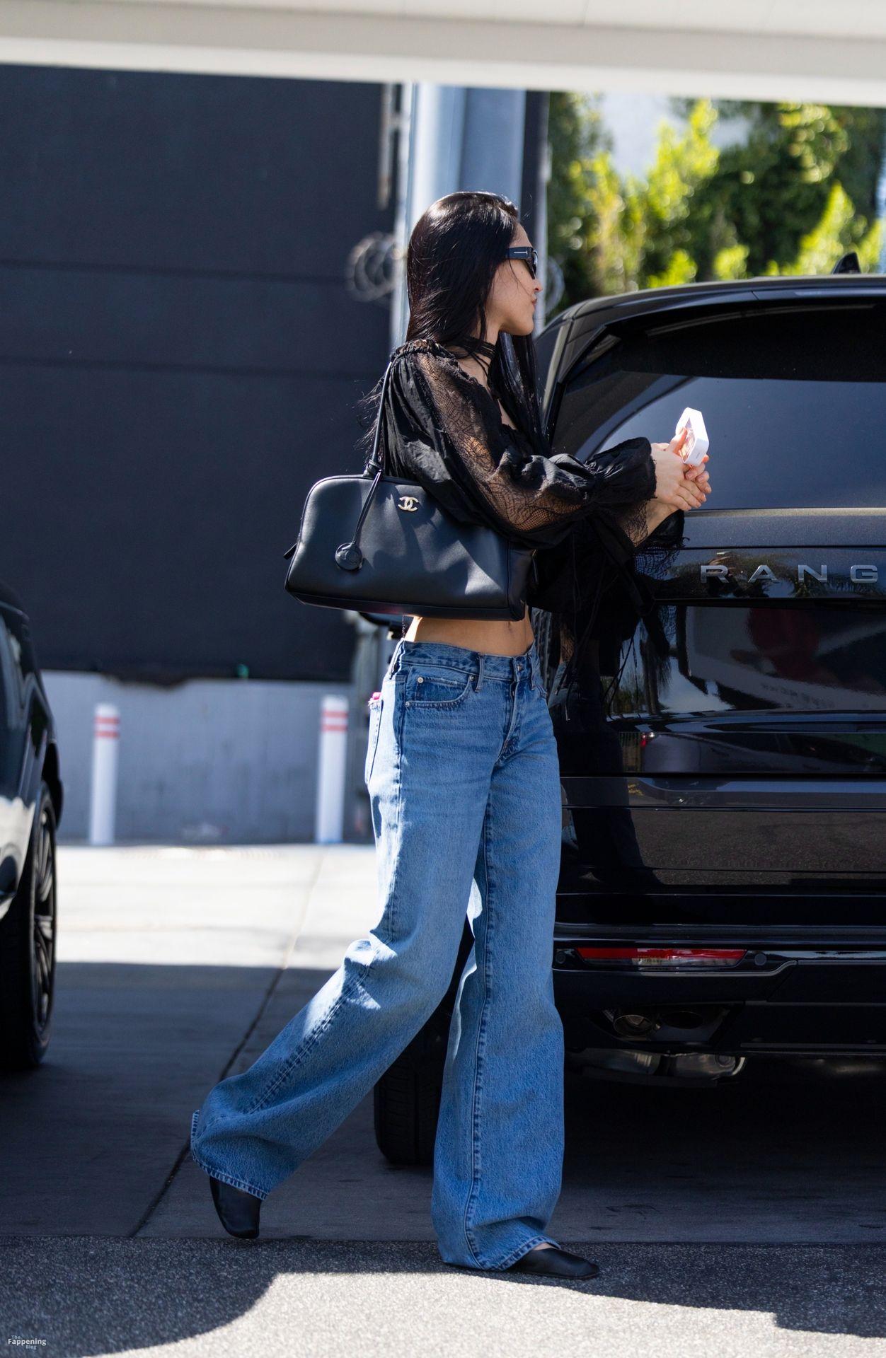 Amelia Gray Hamlin stepped out in a sheer lace top, flashing her tits and midriff and pairing it with low-slung denim and a striking cross necklace.