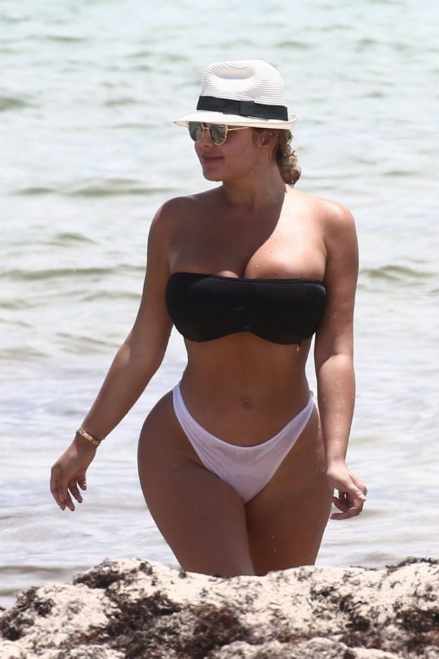 Anastasia (Anastasiya) Kvitko goes for a dip with a friend at Miami Seaside in advance of lounging in the sun, 08/12/2018. The 23-year-old Russian glamour model showed off her amazing curves in a skimpy bikini that barely contained her generous property.