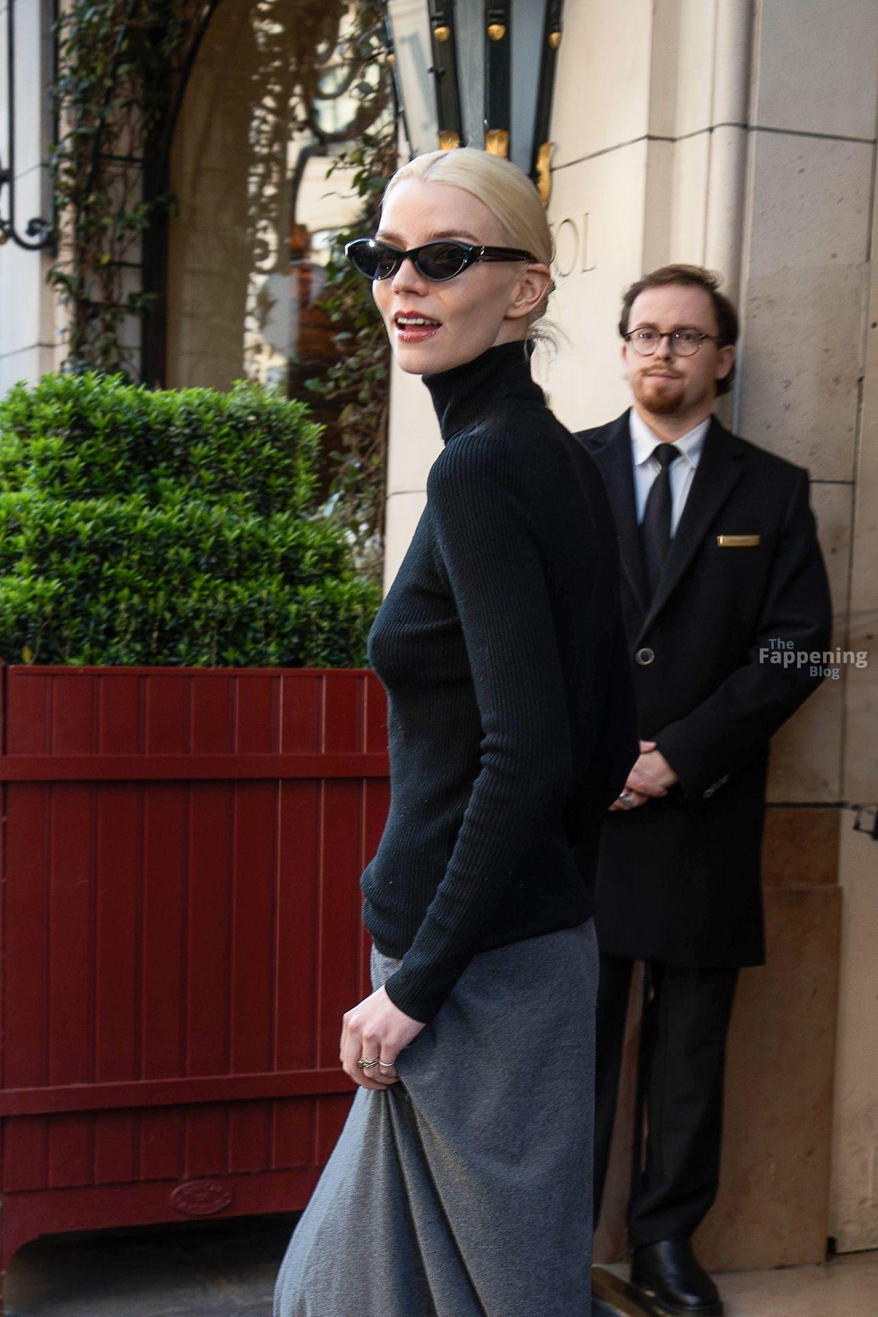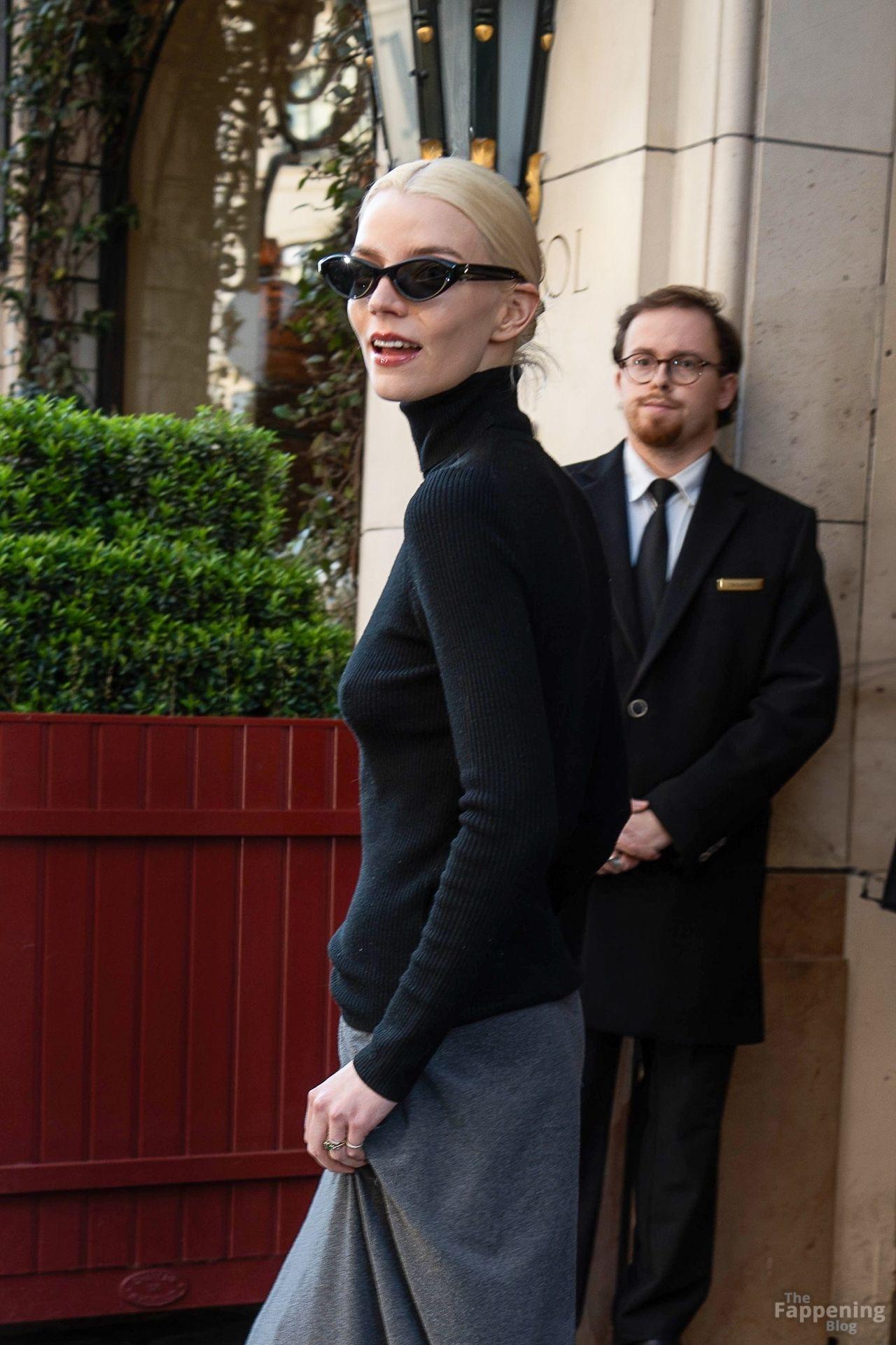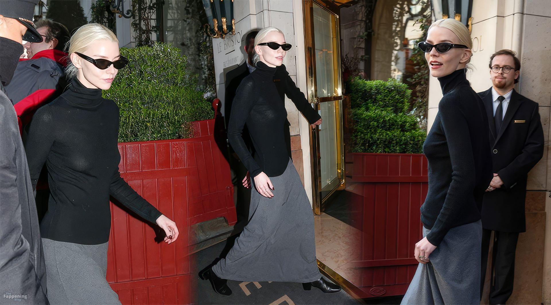 Anya Taylor-Joy looks elegant in a black turtle neck top, paired with a gray maxi skirt as she steps out of her hotel during Paris Fashion Week. Her style seems compare to Carolyn Bessette Kennedy style as the minimalist approach is making a comeback.