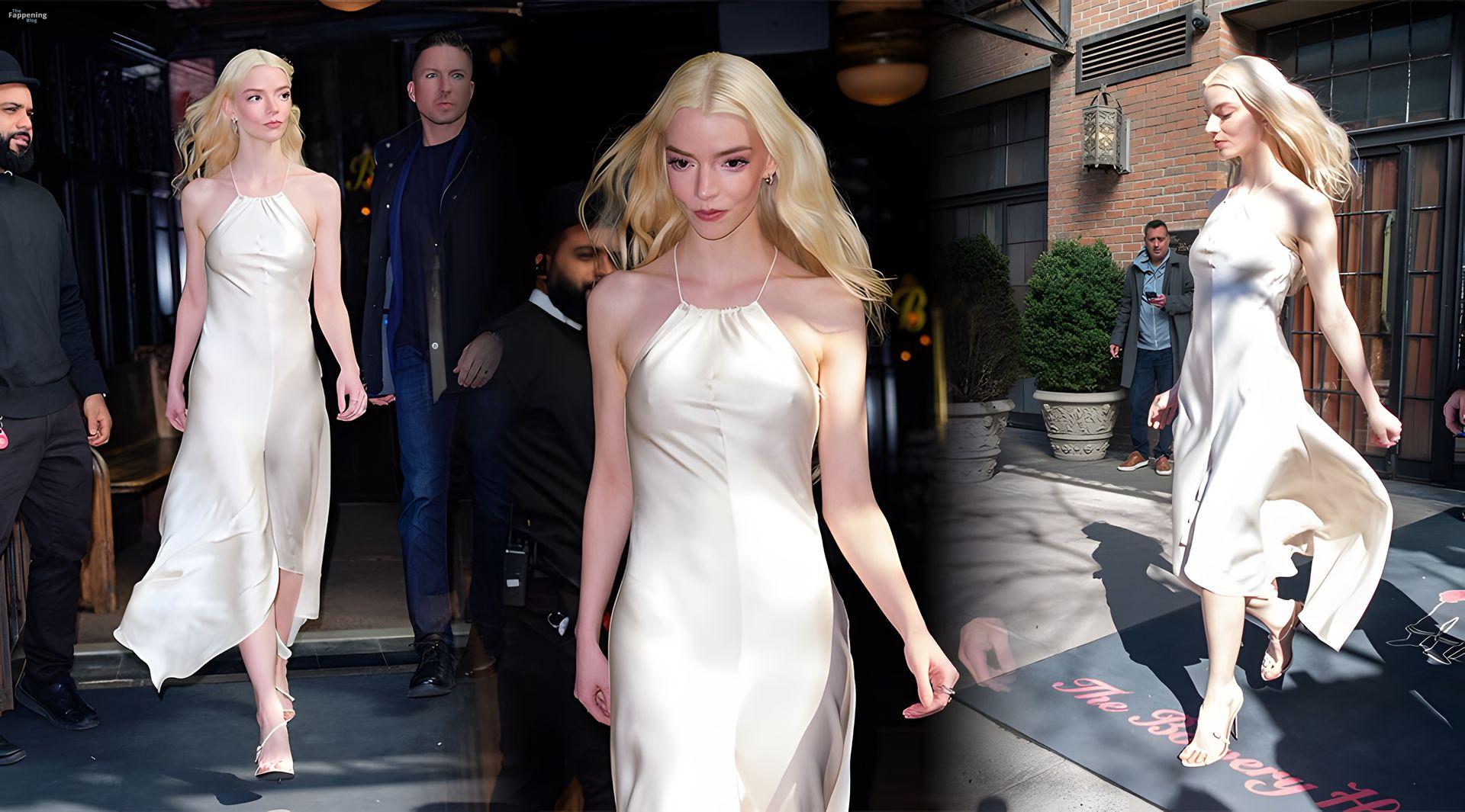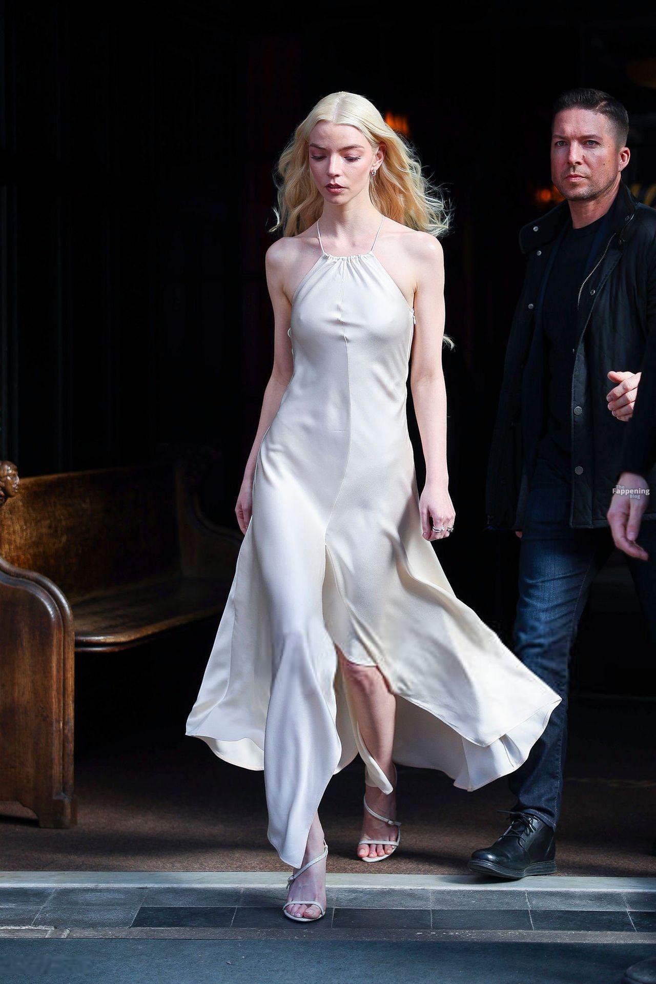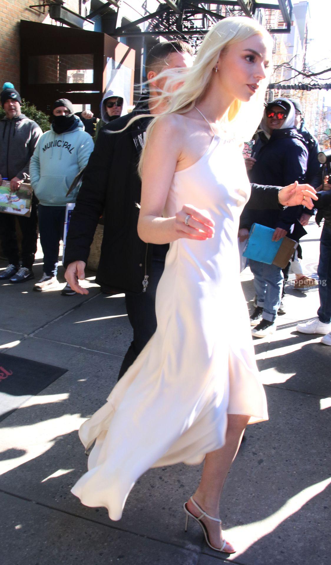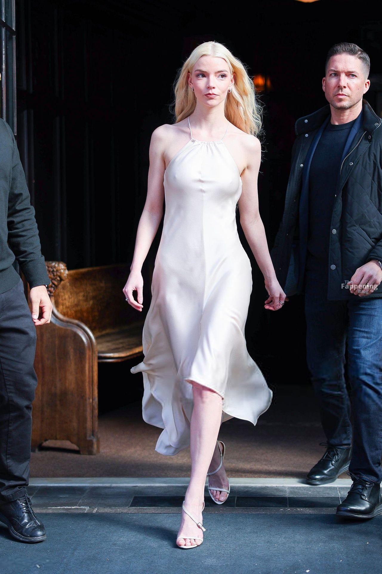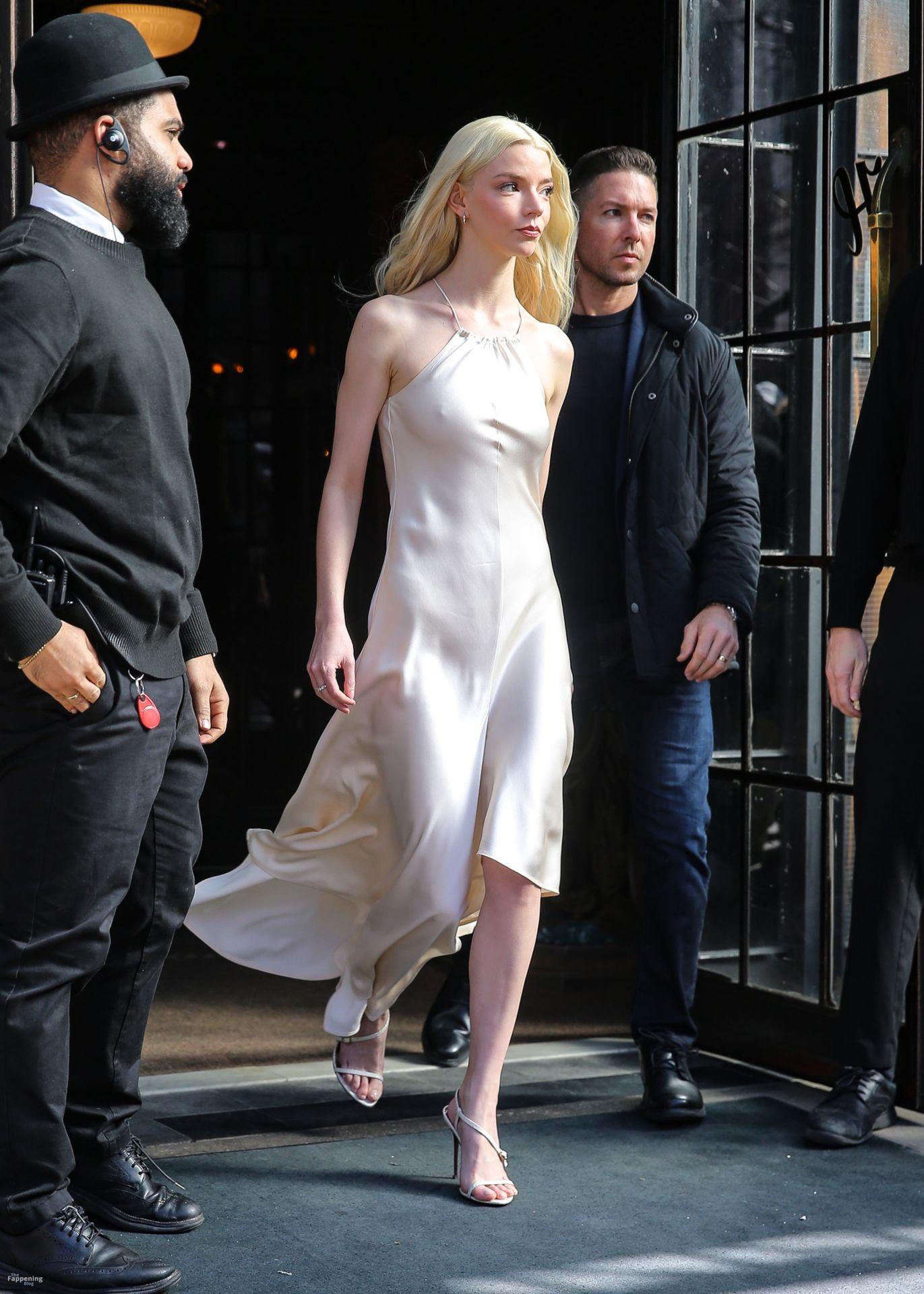 Braless Anya Taylor Joy looked gorgeous as she left The Bowery Hotel wearing a satin white Ralph Lauren dress paired with strappy heels.