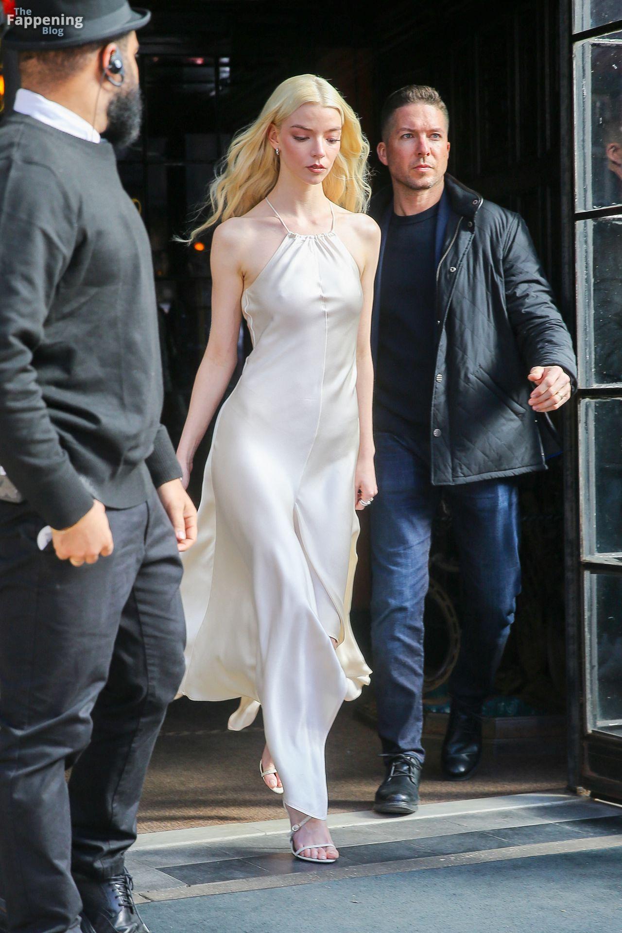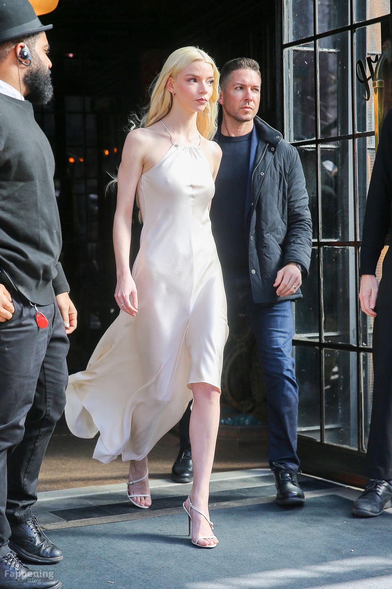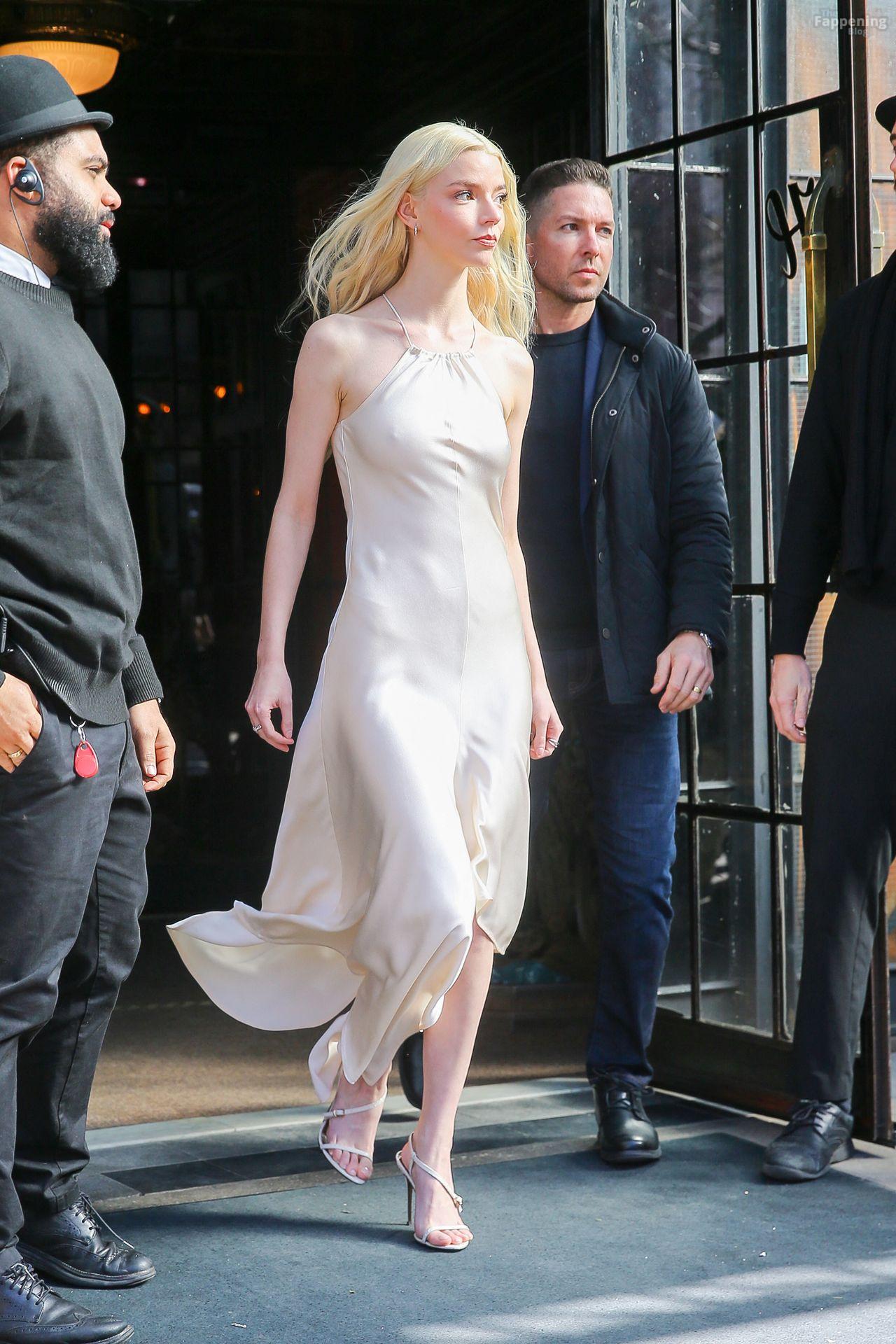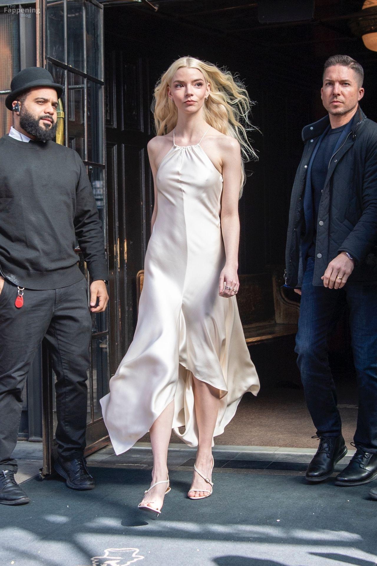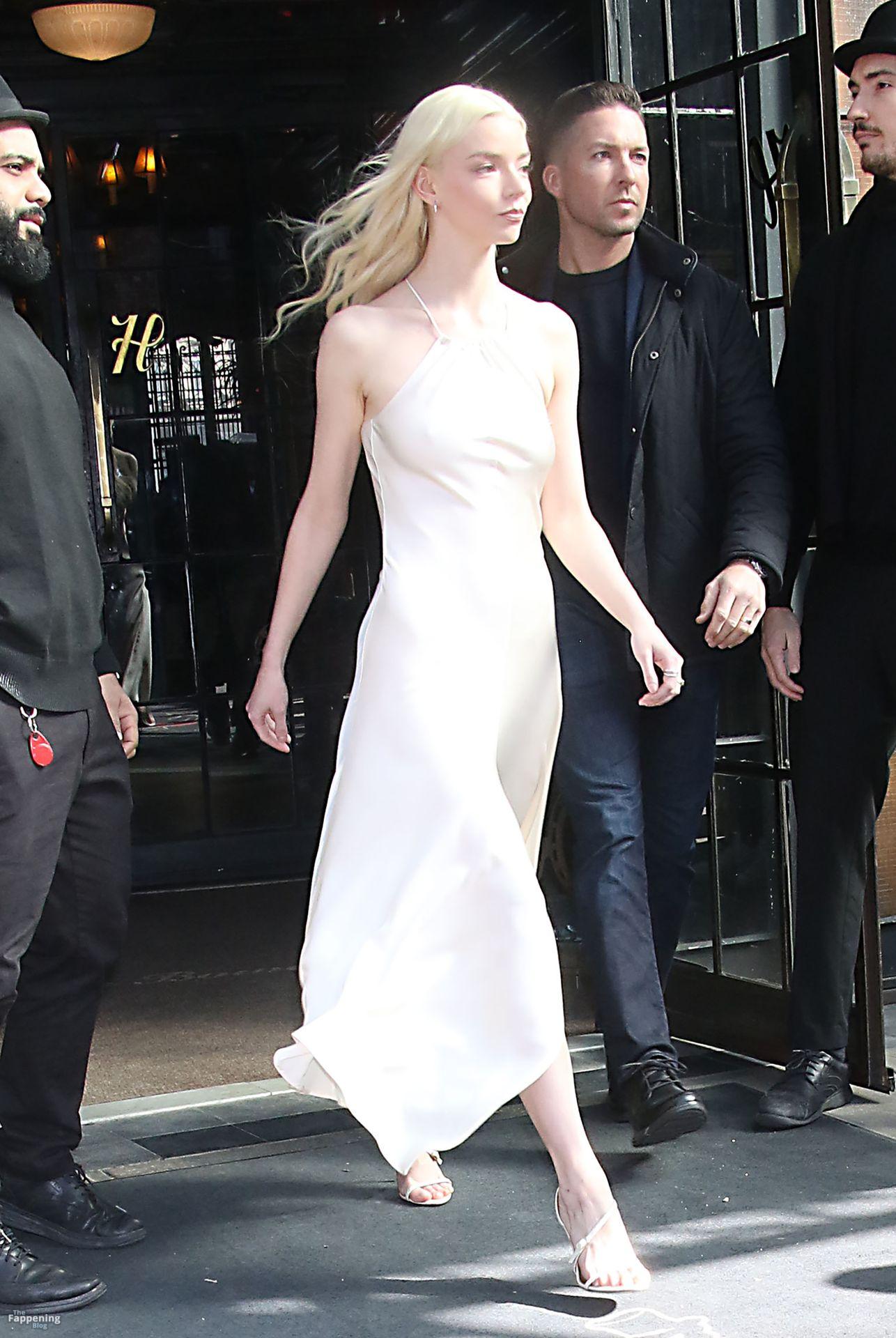 Braless Anya Taylor Joy looked gorgeous as she left The Bowery Hotel wearing a satin white Ralph Lauren dress paired with strappy heels.
