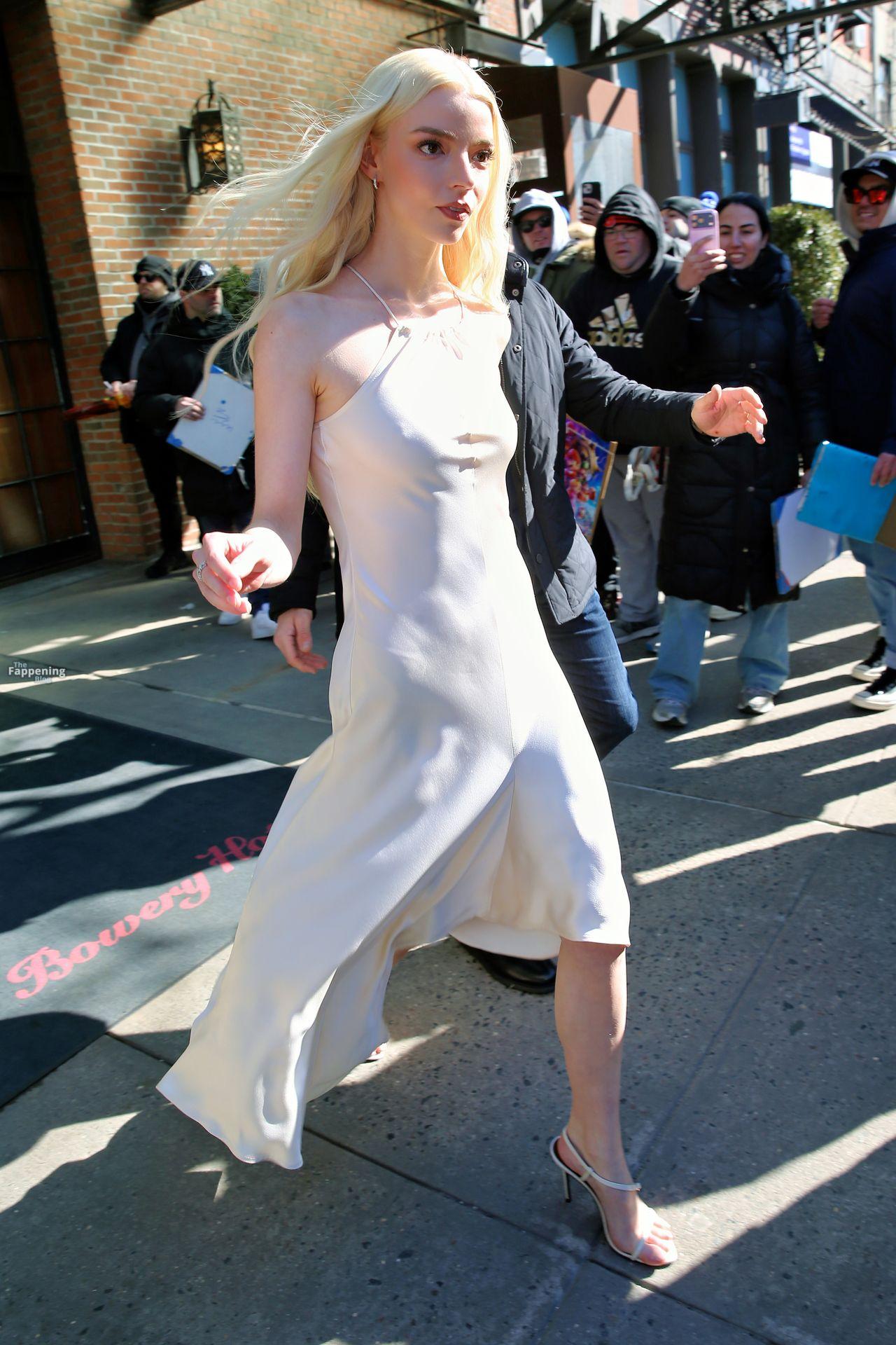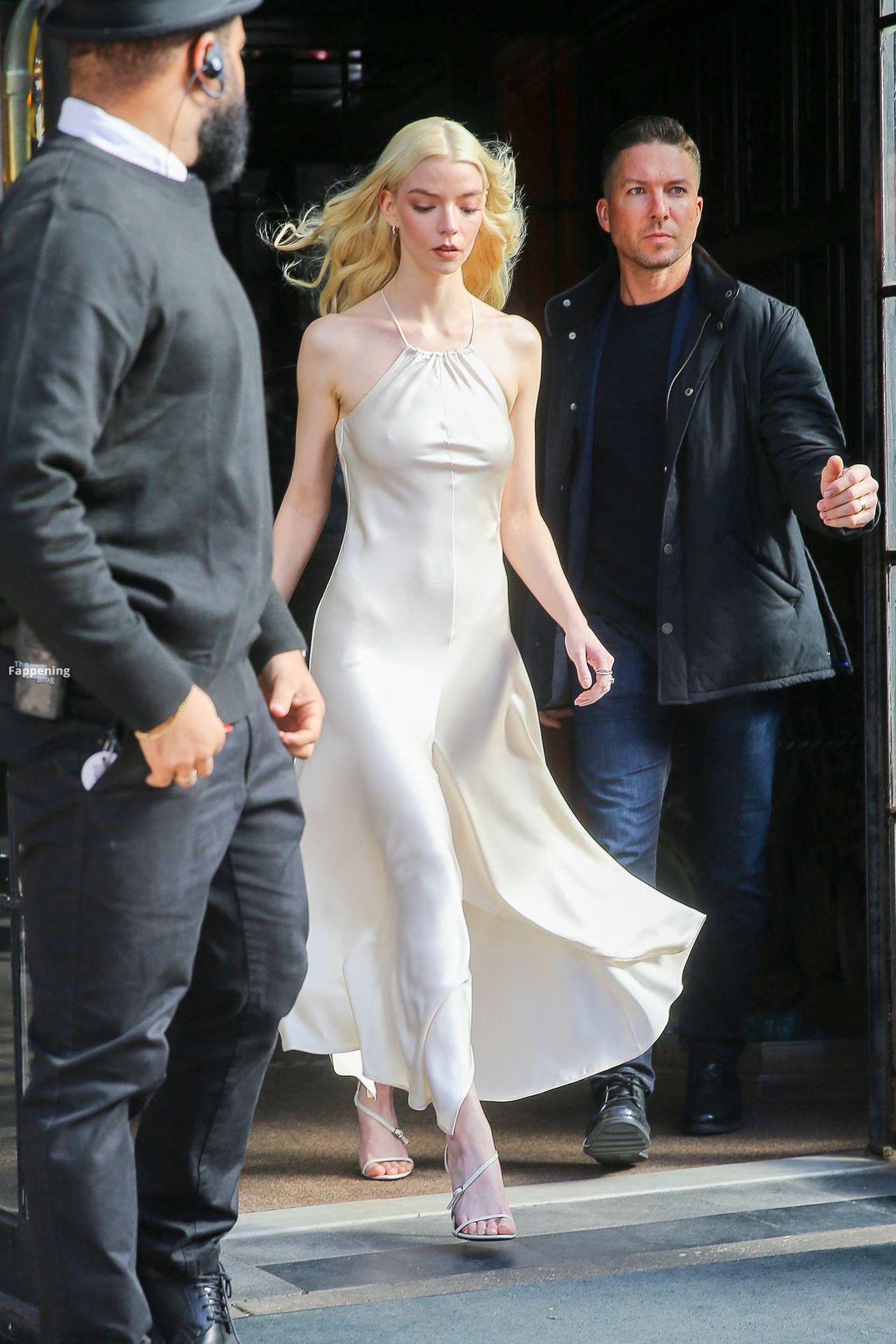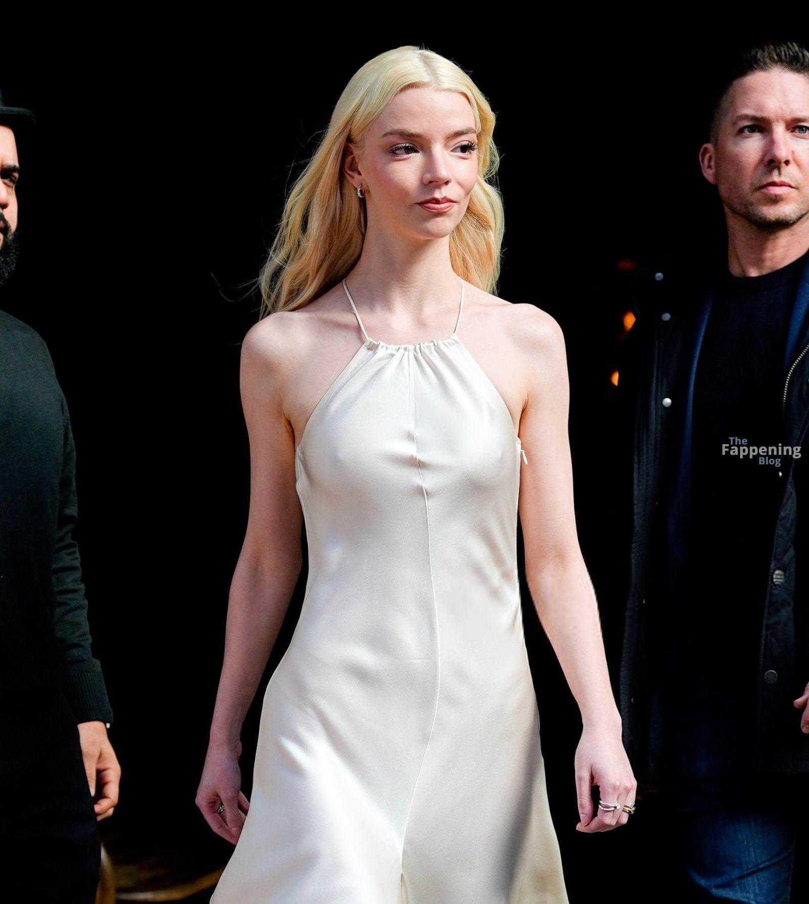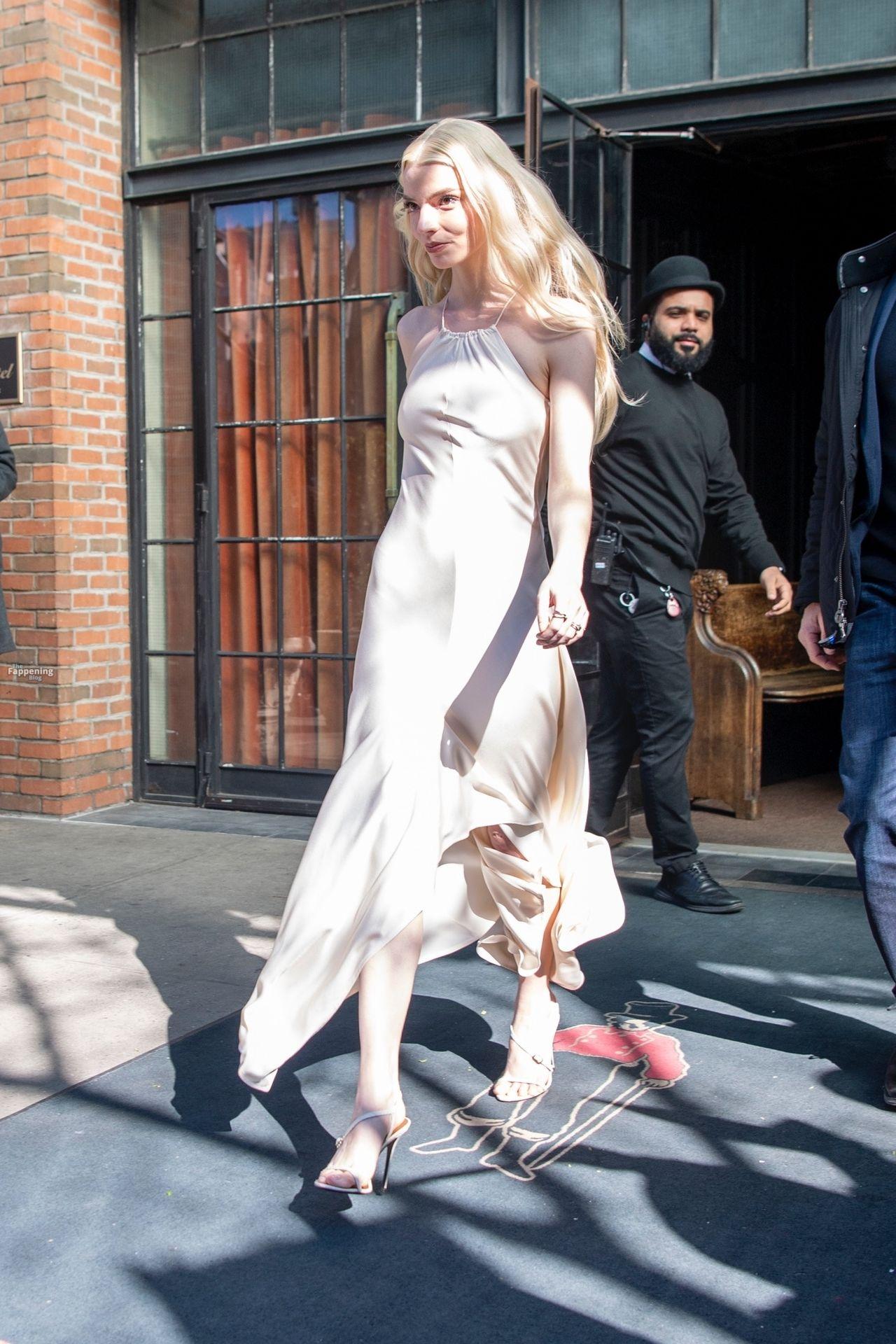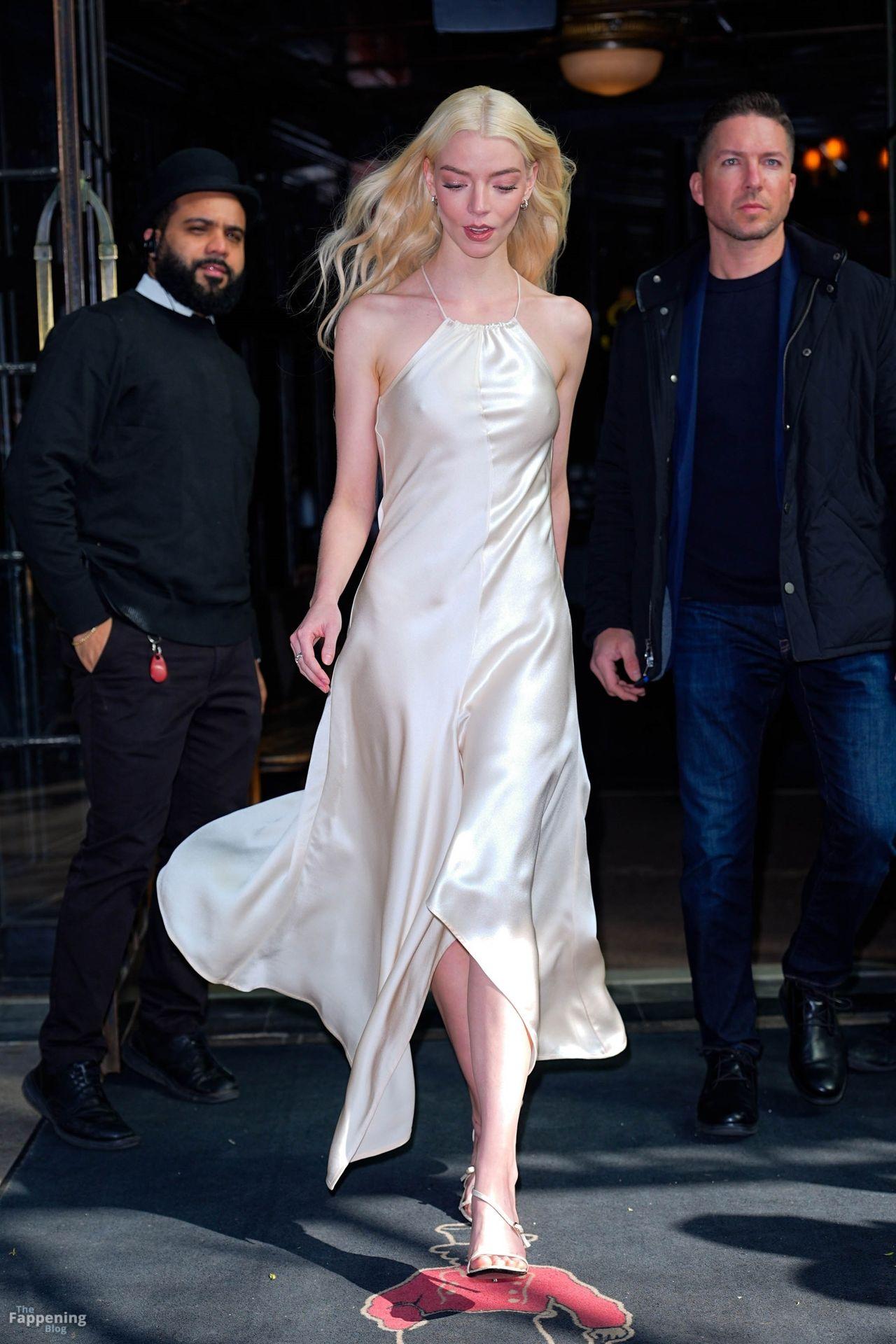 Braless Anya Taylor Joy looked gorgeous as she left The Bowery Hotel wearing a satin white Ralph Lauren dress paired with strappy heels.