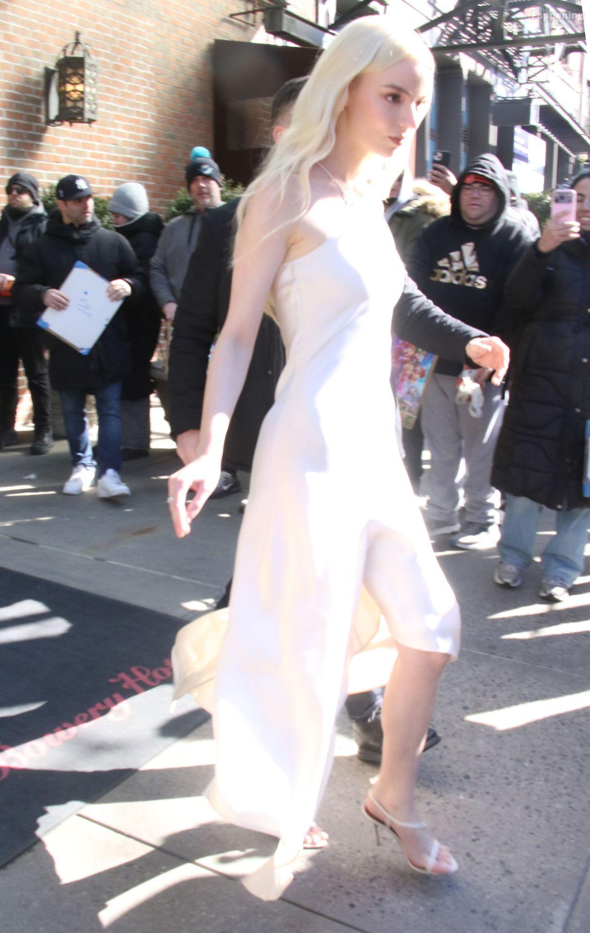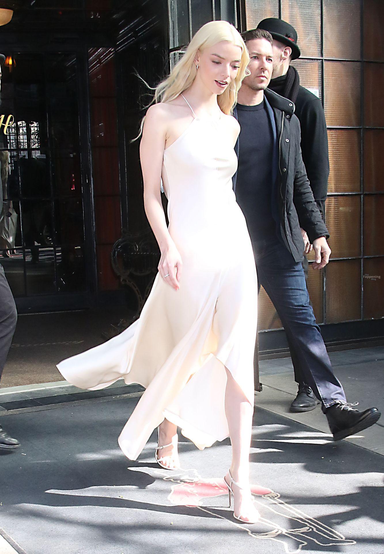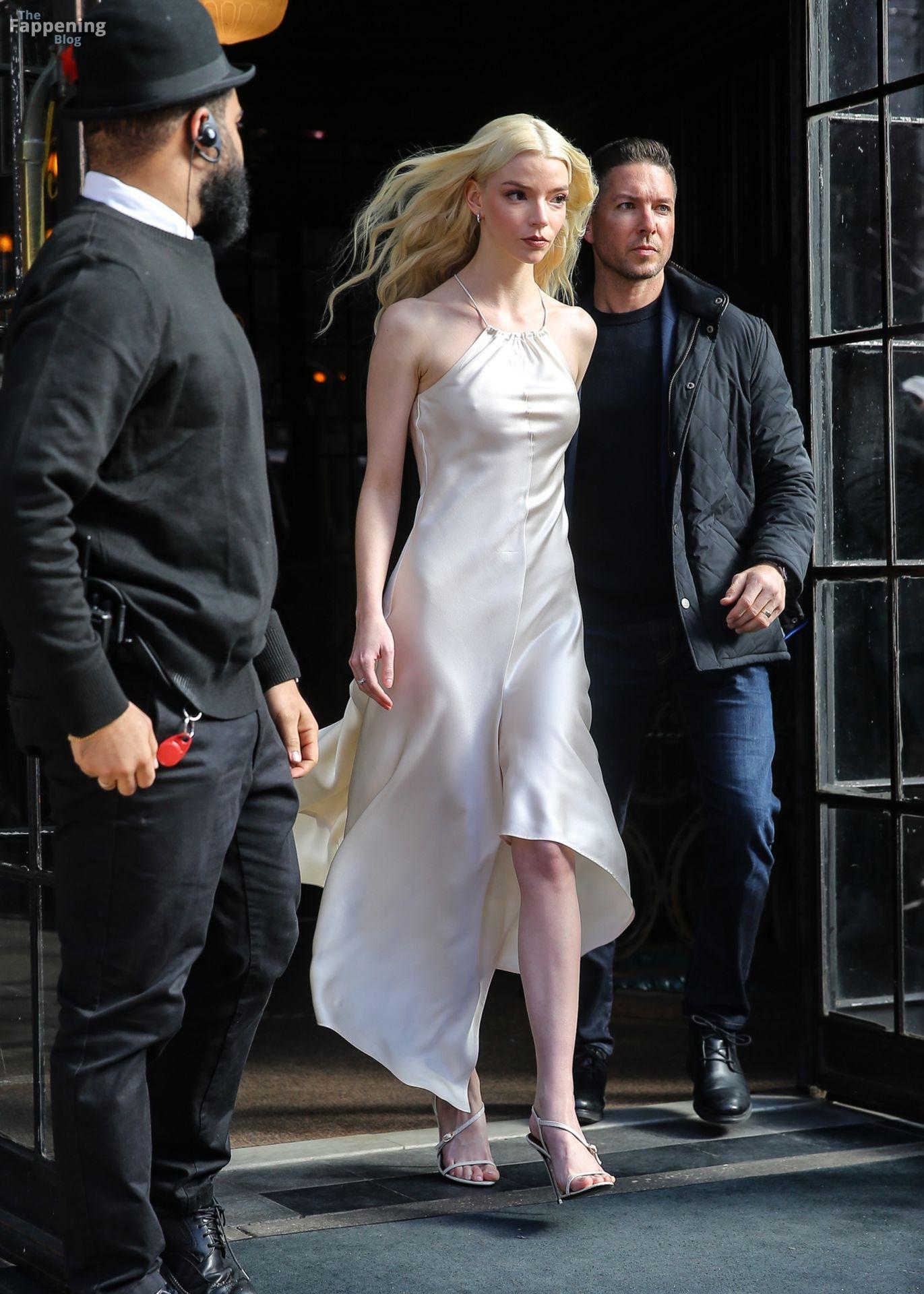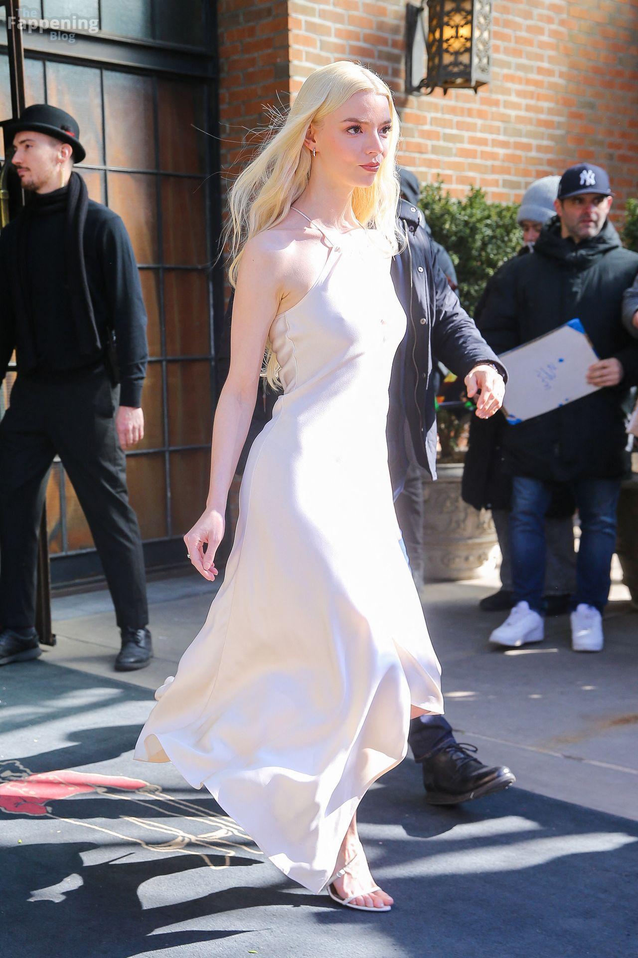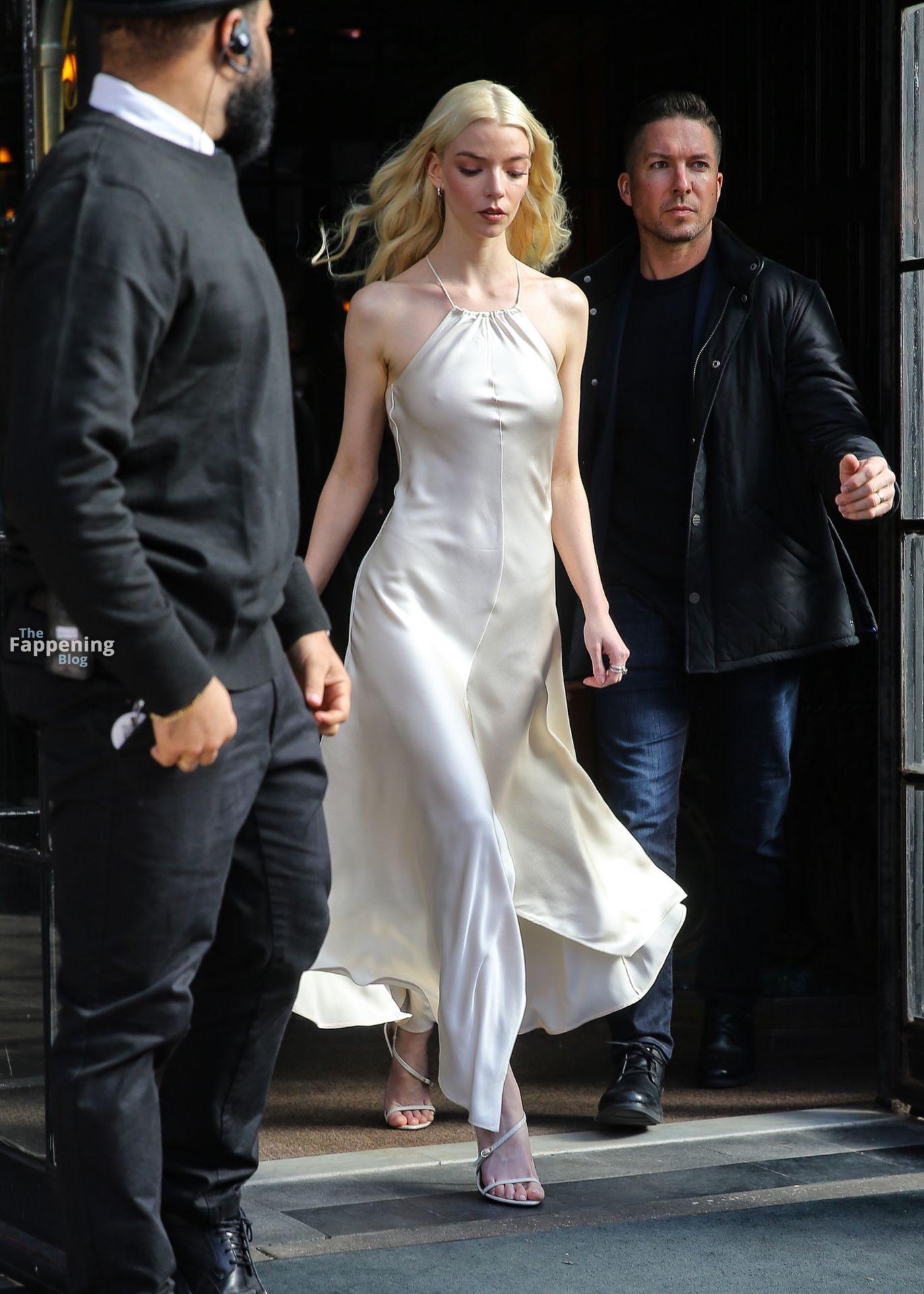 Braless Anya Taylor Joy looked gorgeous as she left The Bowery Hotel wearing a satin white Ralph Lauren dress paired with strappy heels.