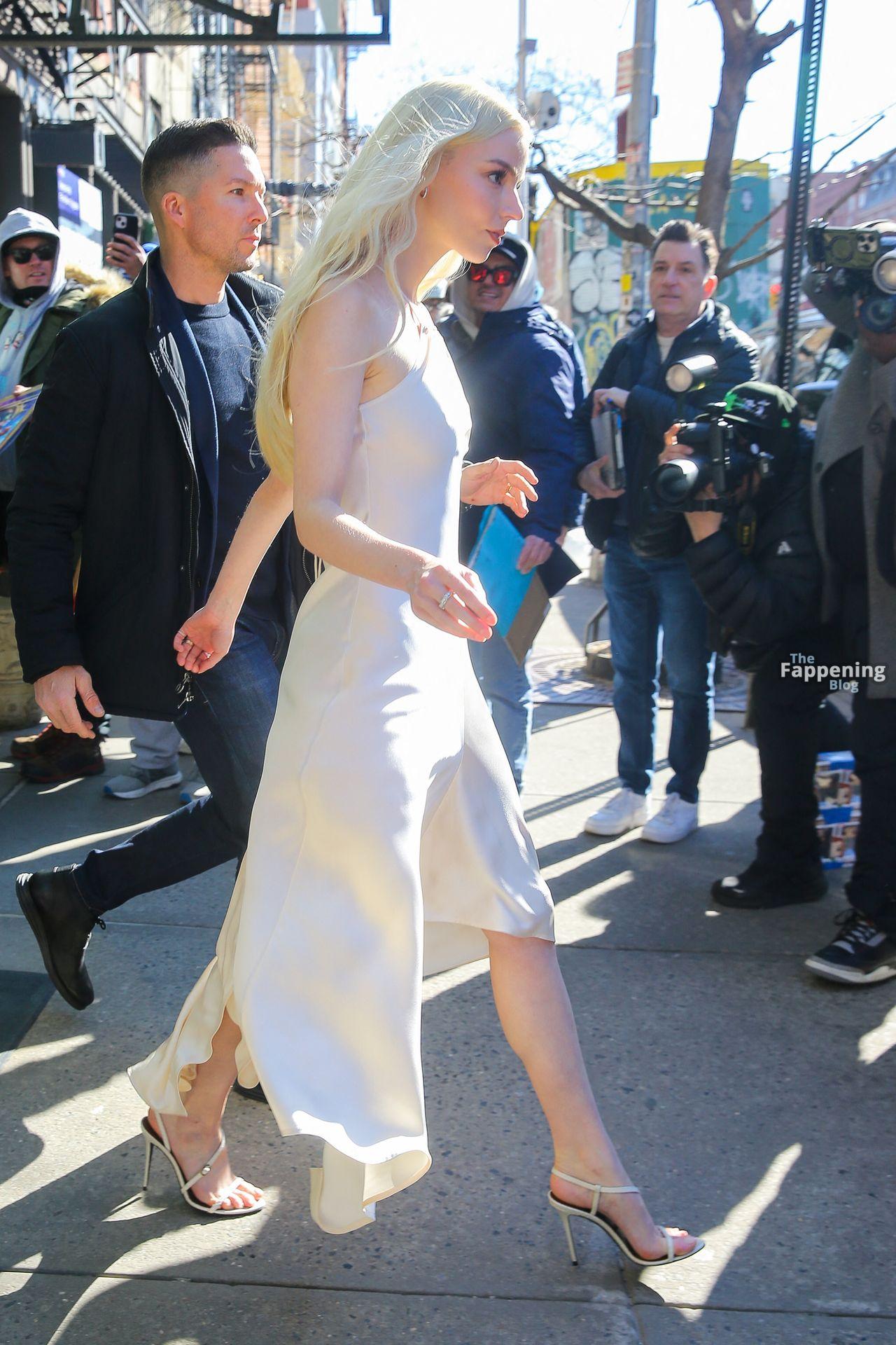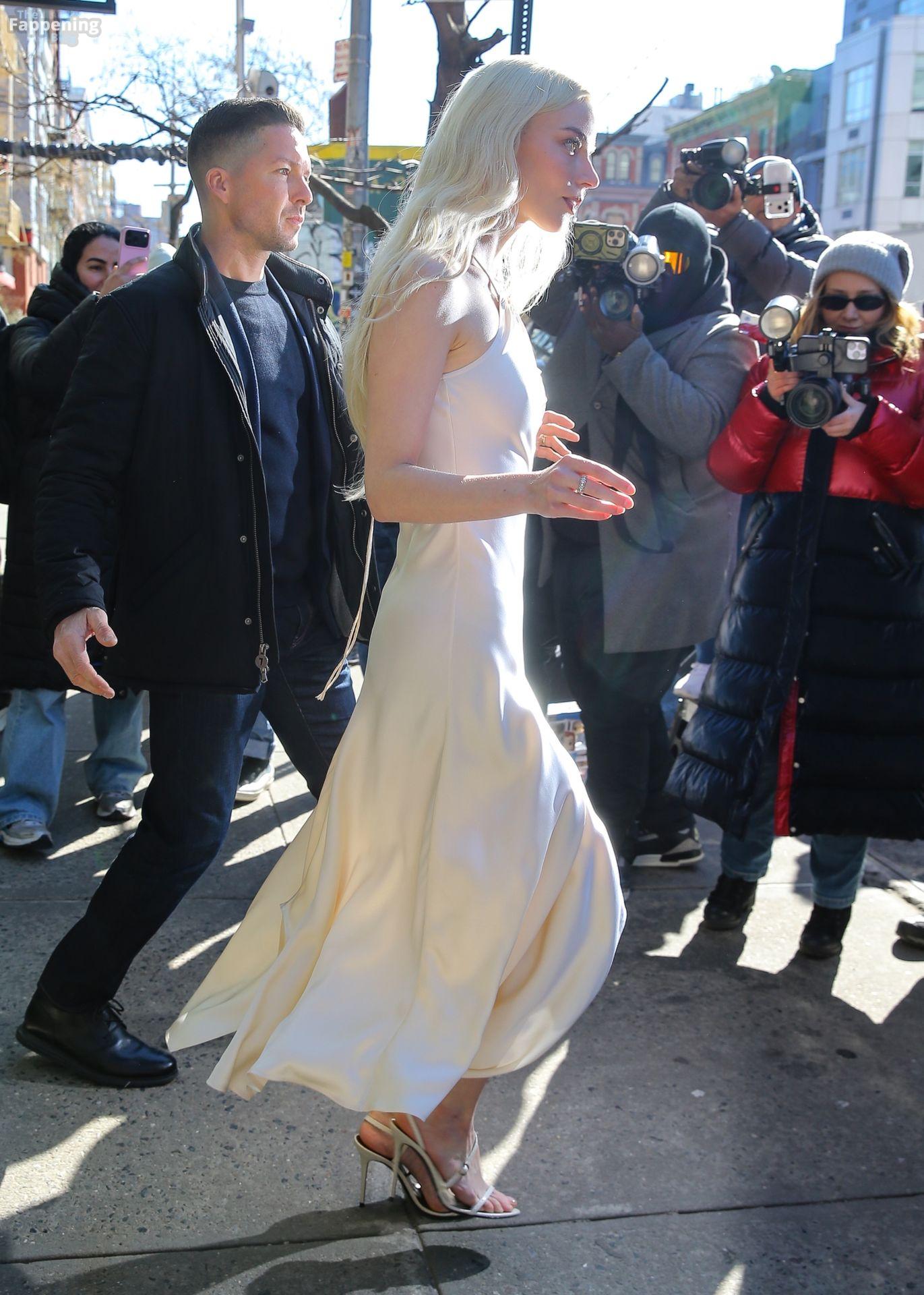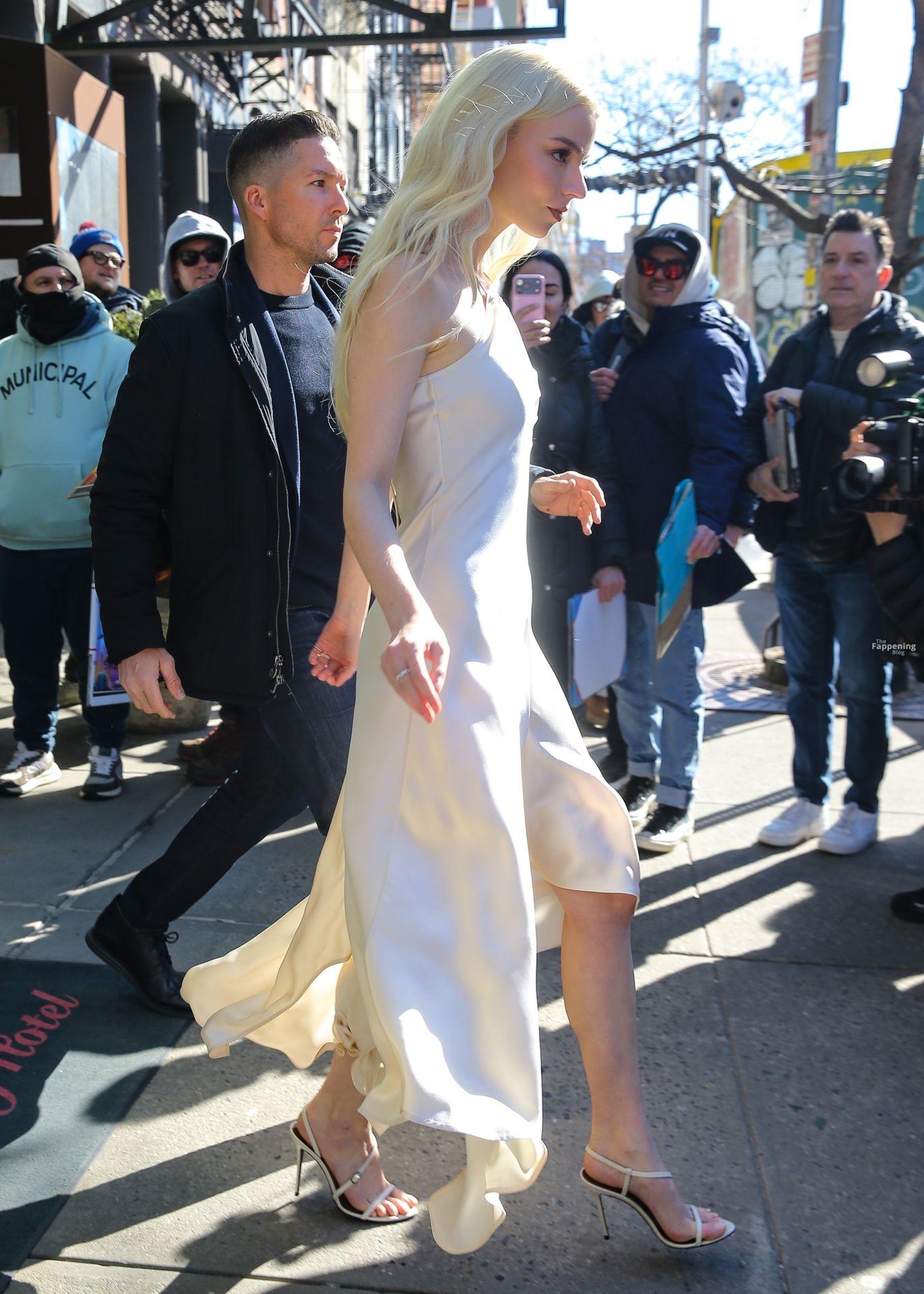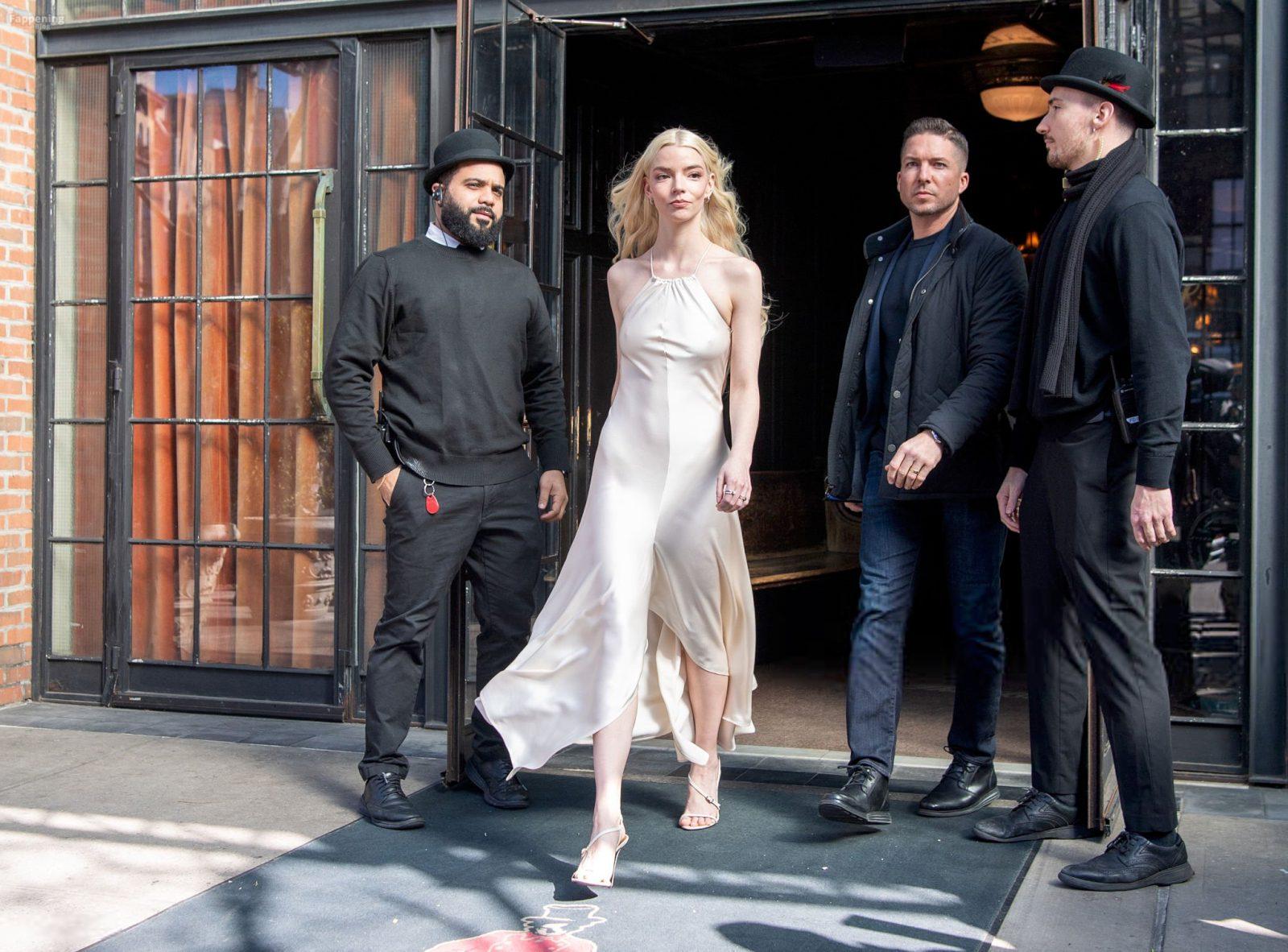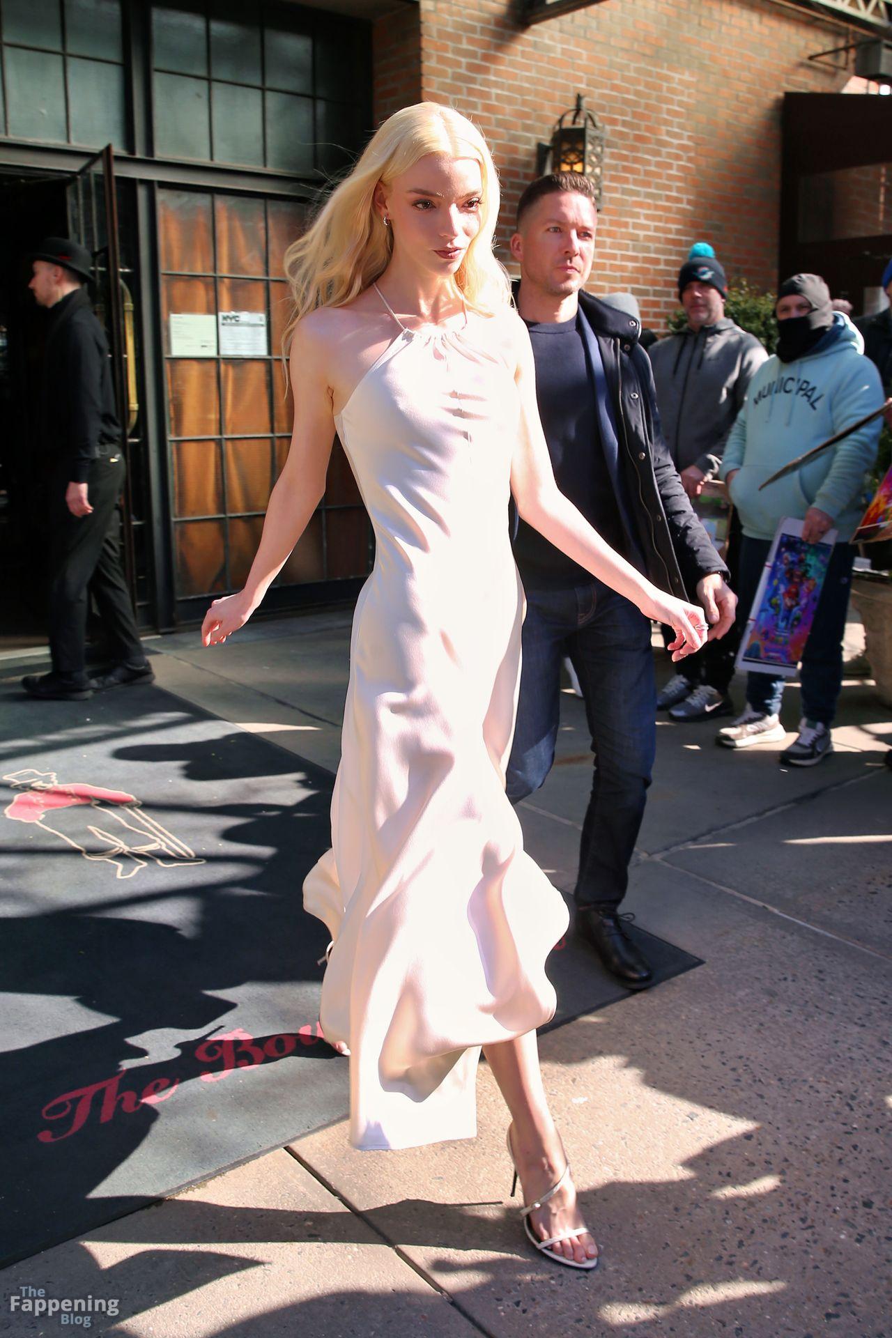 Braless Anya Taylor Joy looked gorgeous as she left The Bowery Hotel wearing a satin white Ralph Lauren dress paired with strappy heels.