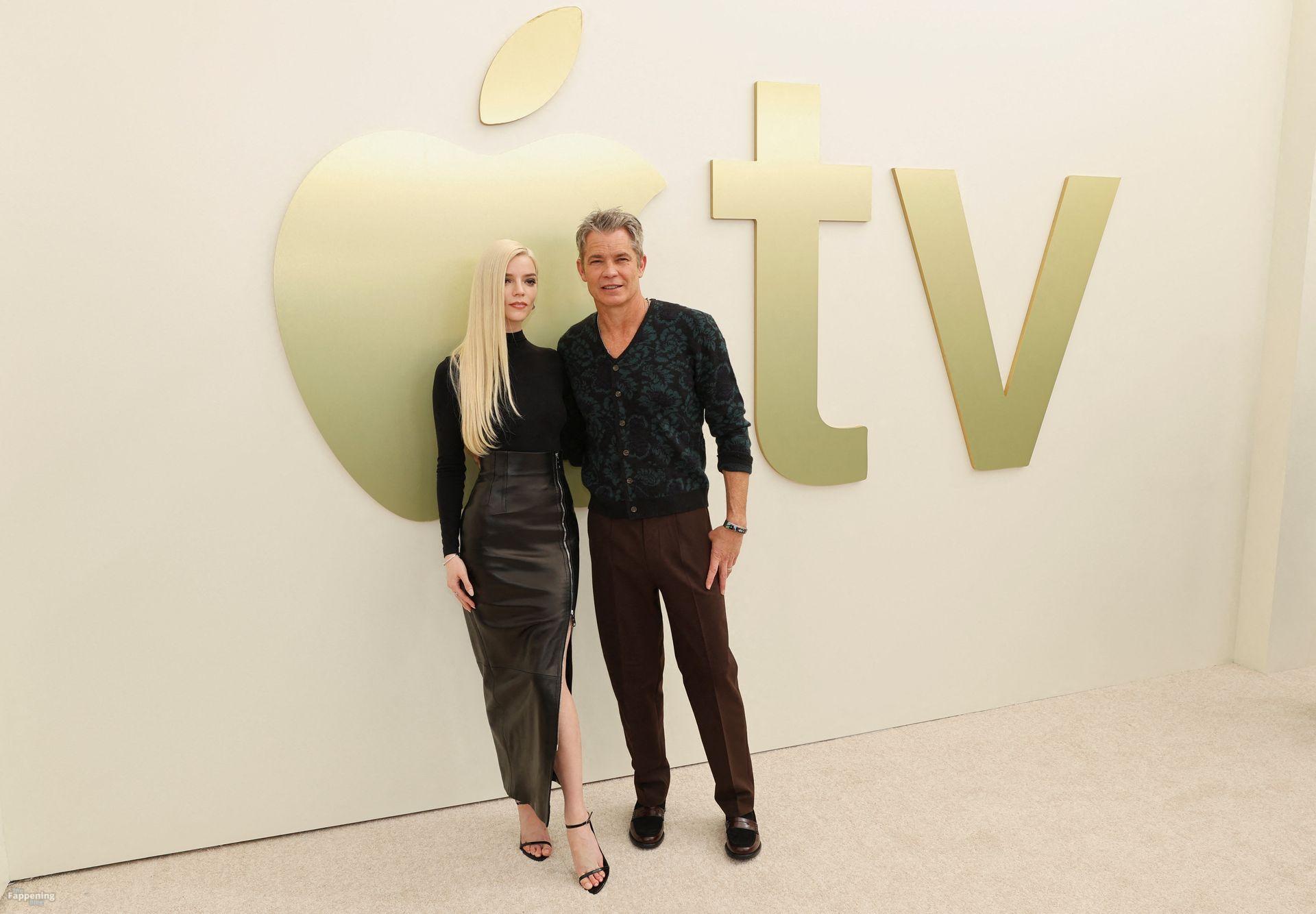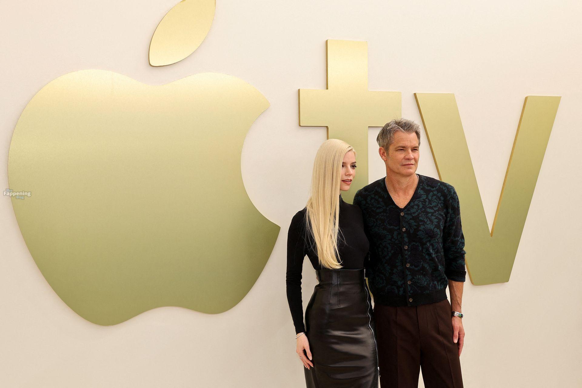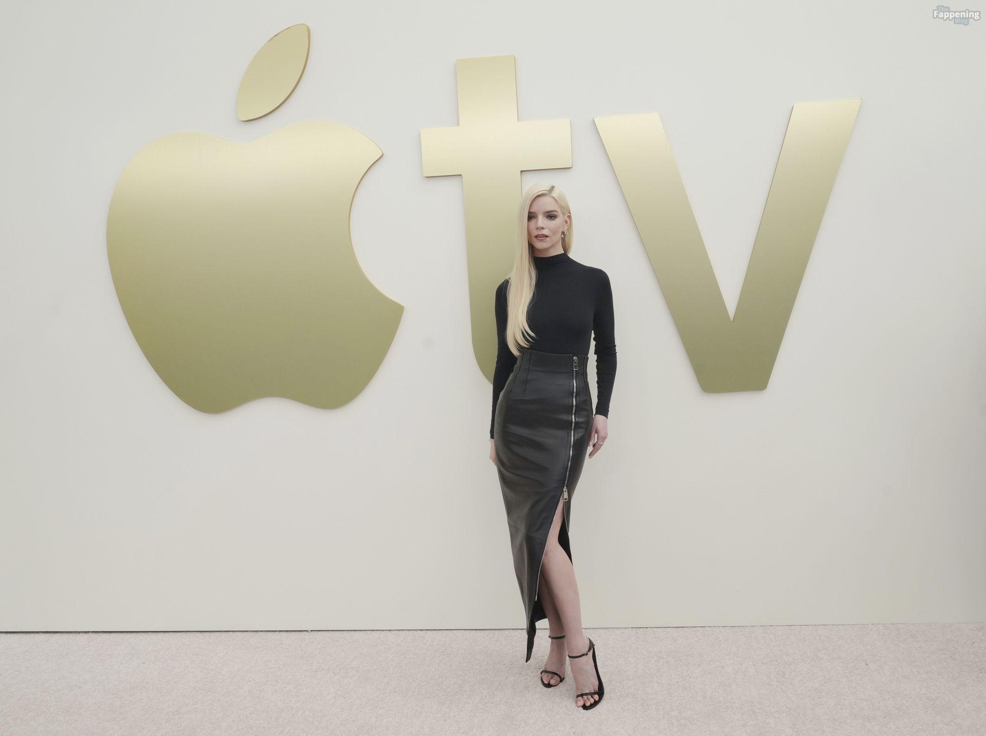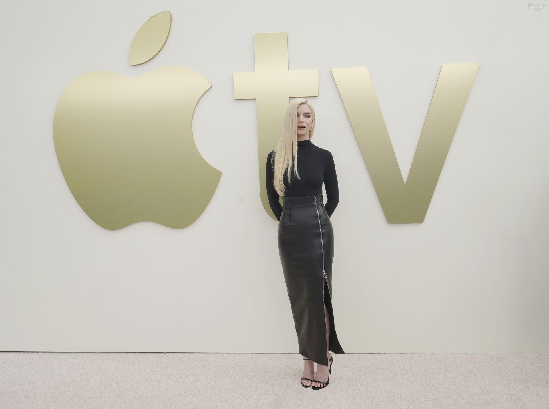 Anya Taylor-Joy attends the Apple TV Press Day held at Barker Hangar in Los Angeles. The actress stuns on the red carpet, wearin’ a black bodysuit and zipper leather skirt.