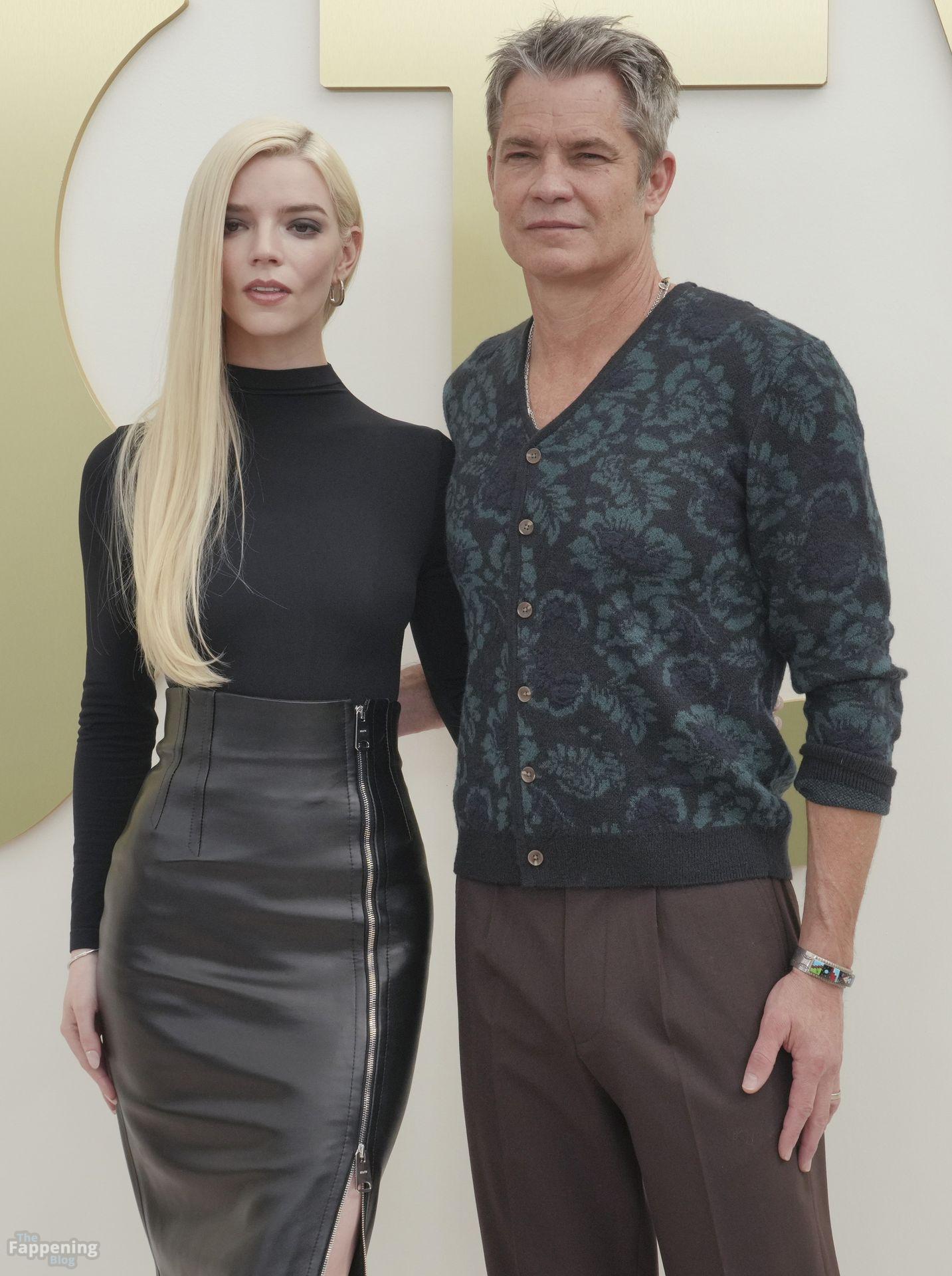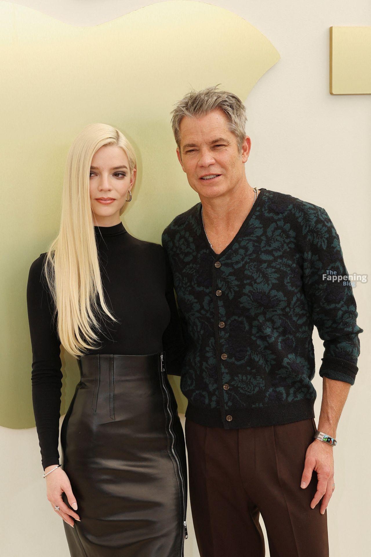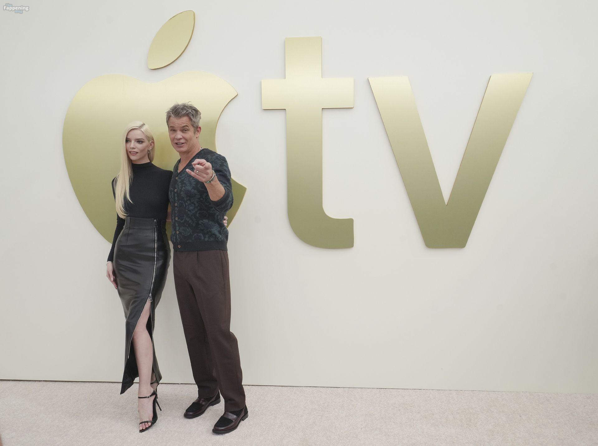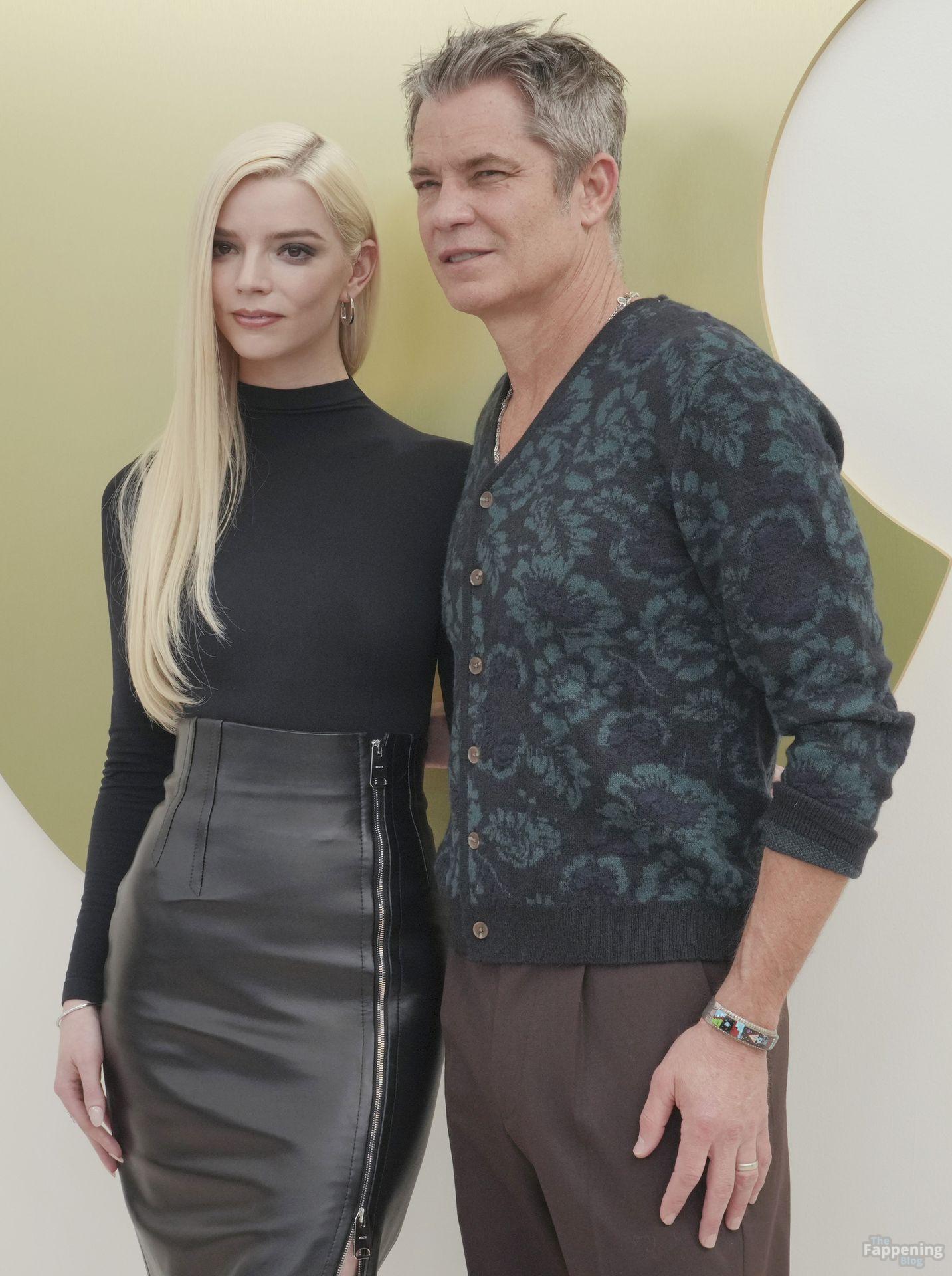 Anya Taylor-Joy attends the Apple TV Press Day held at Barker Hangar in Los Angeles. The actress stuns on the red carpet, wearin’ a black bodysuit and zipper leather skirt.