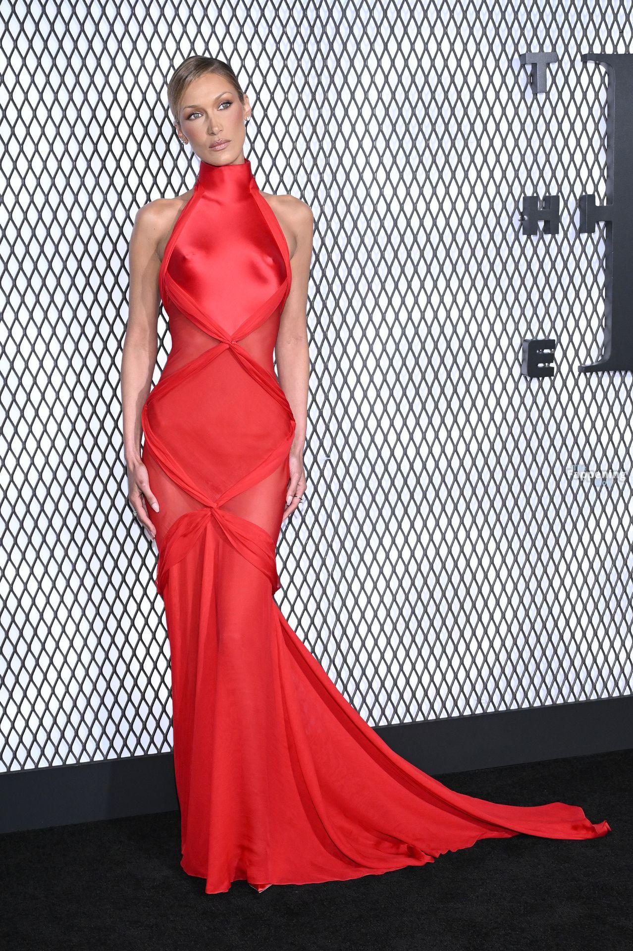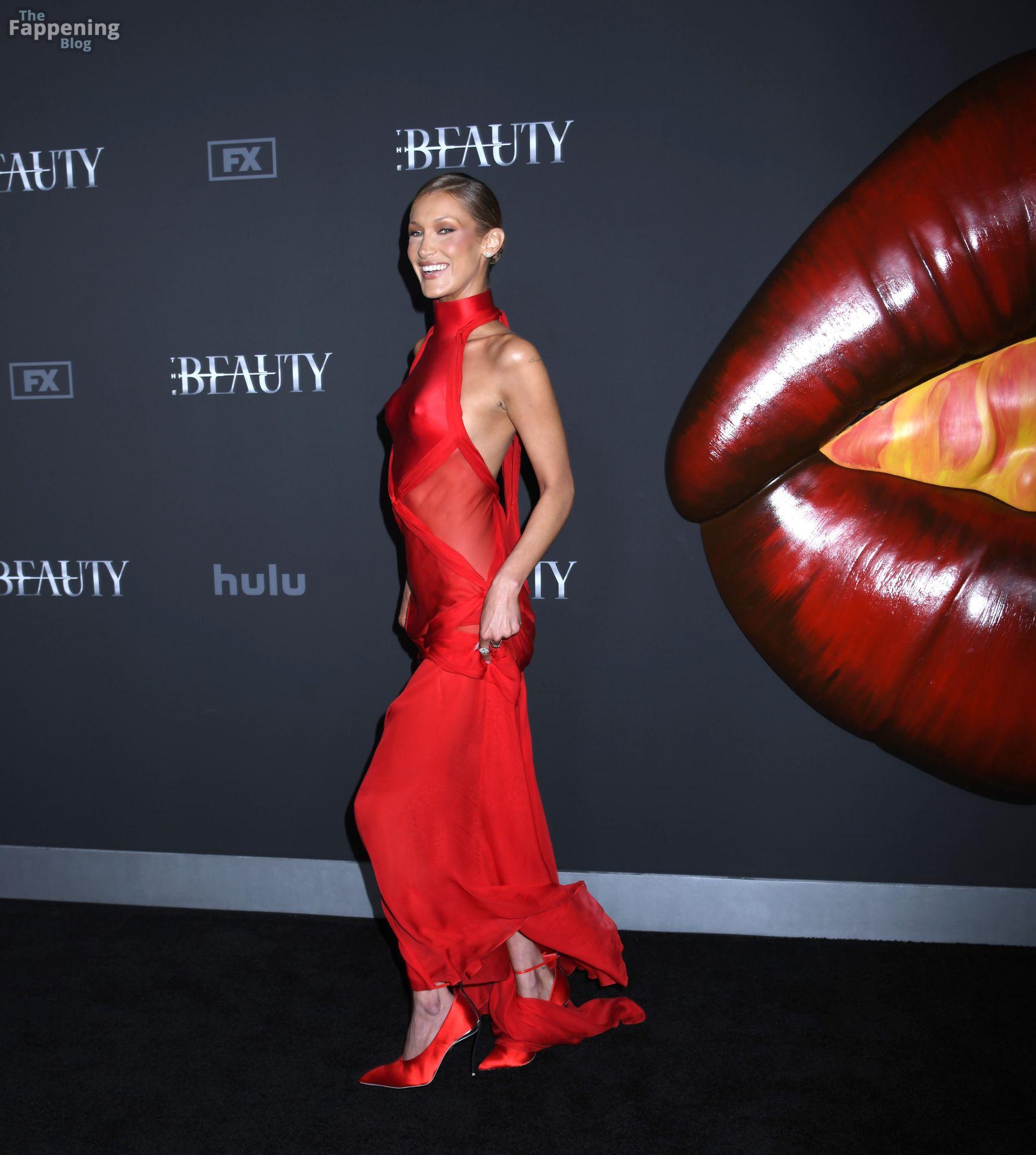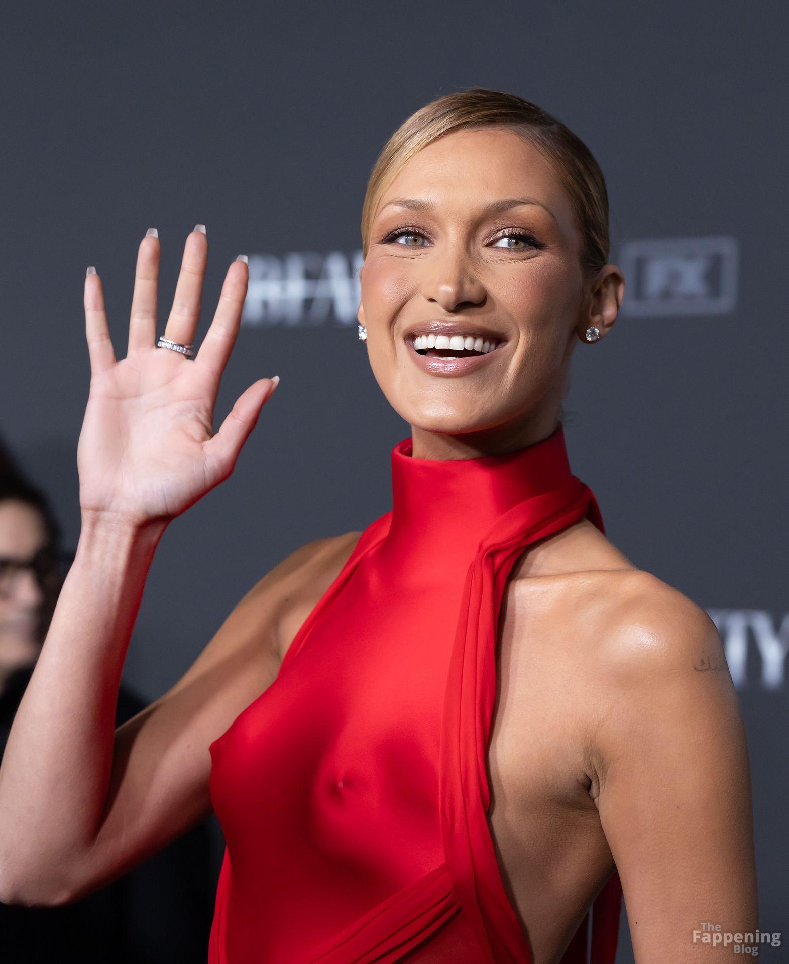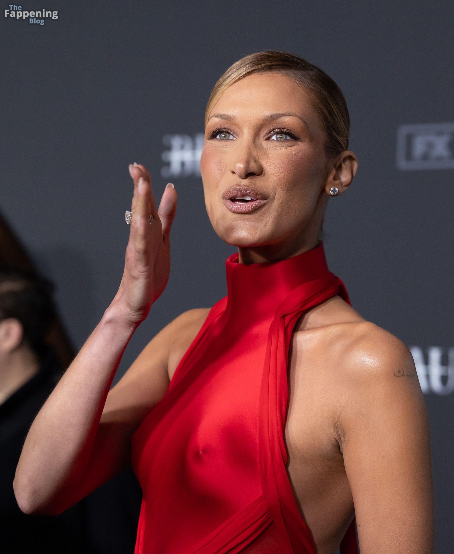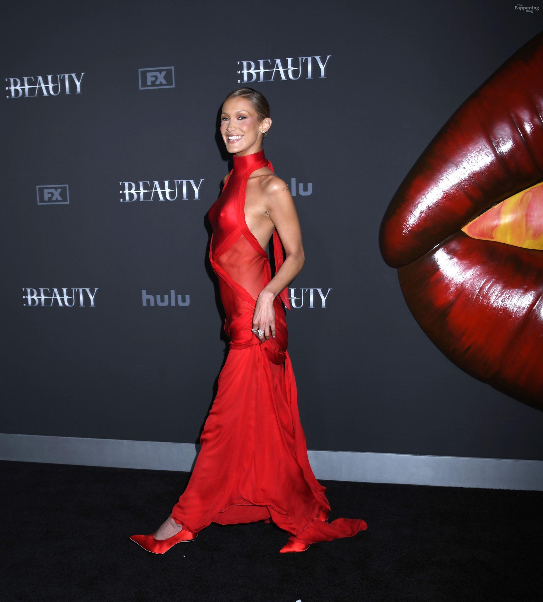 Bella Hadid shows off her pokies in a red dress as she attends FX’s “The Beauty” red carpet premiere. Held at MoMA The Museum of Modern Art in New York.
