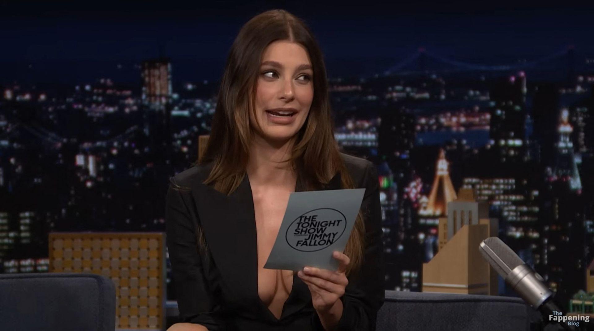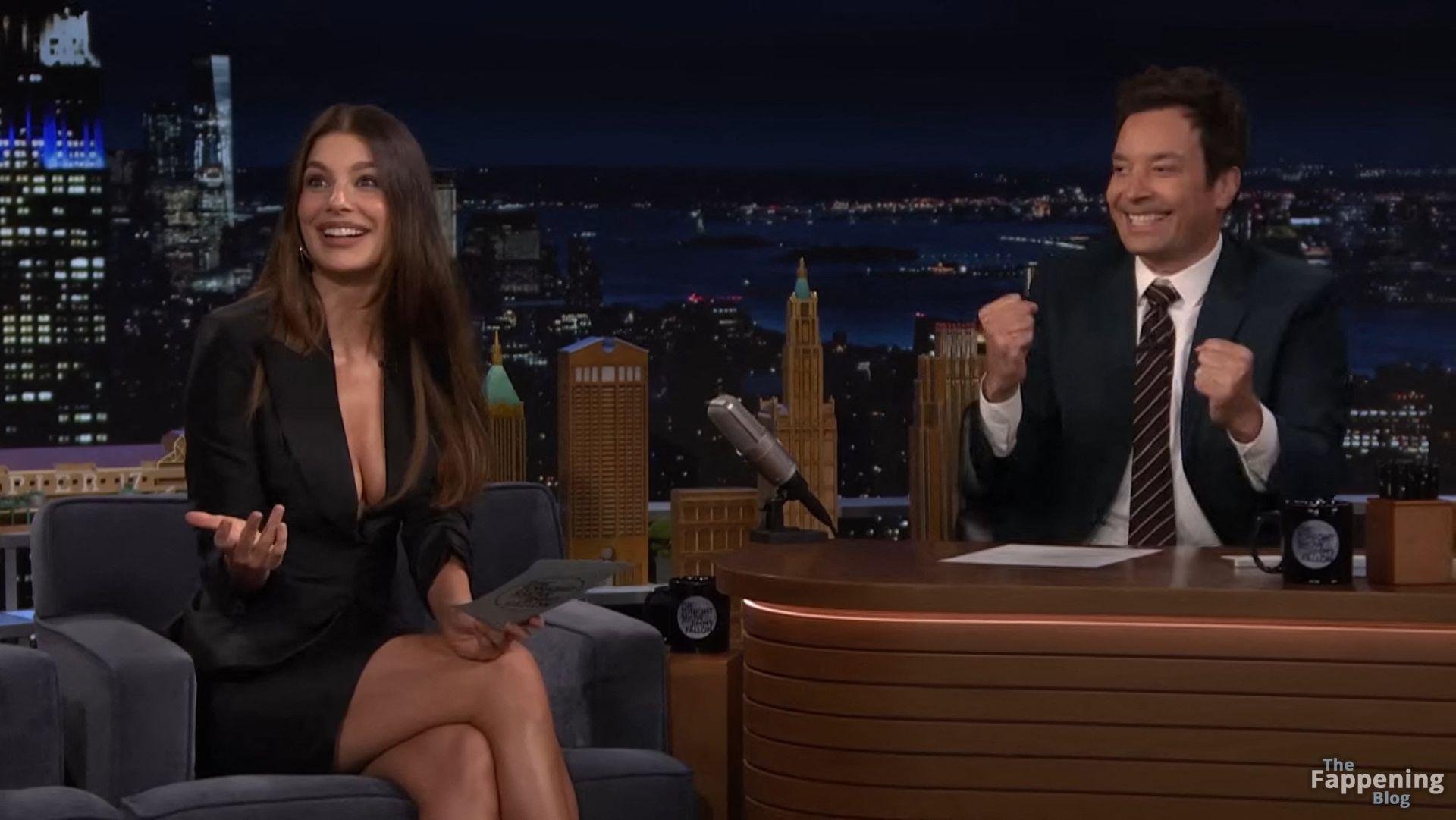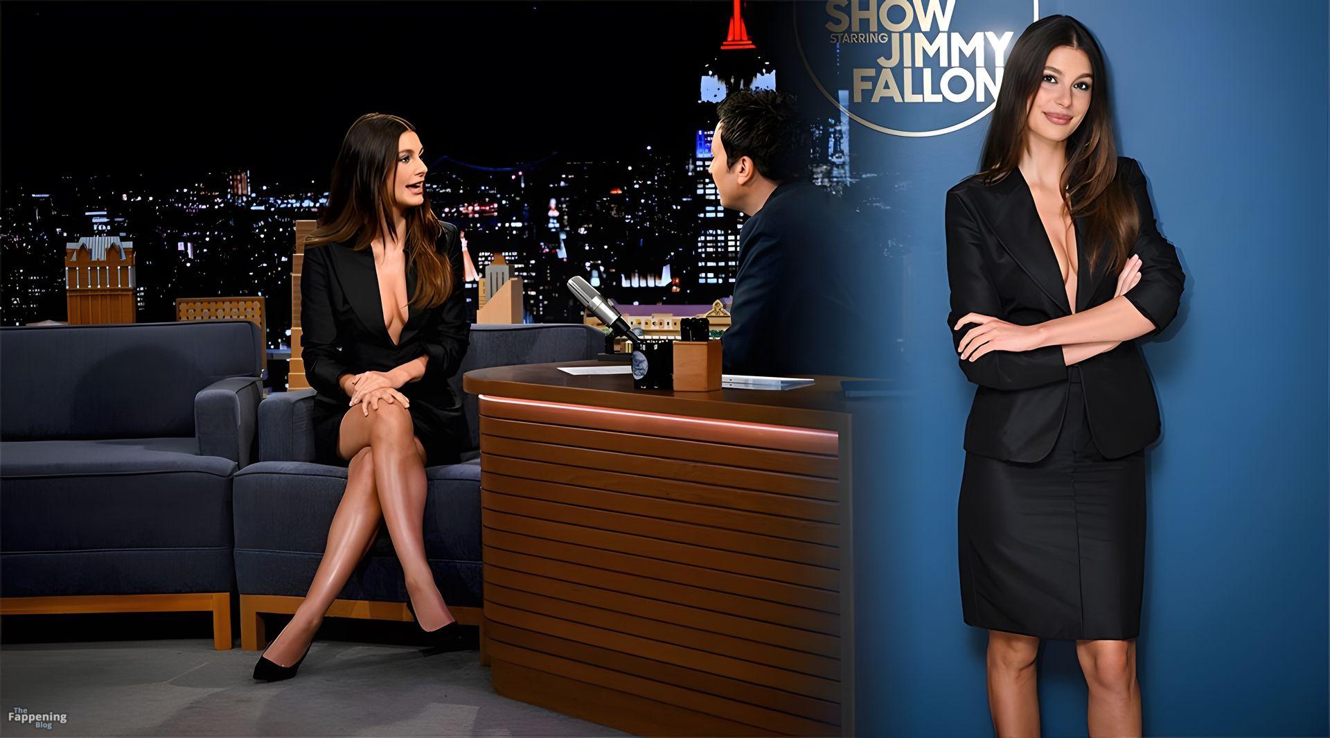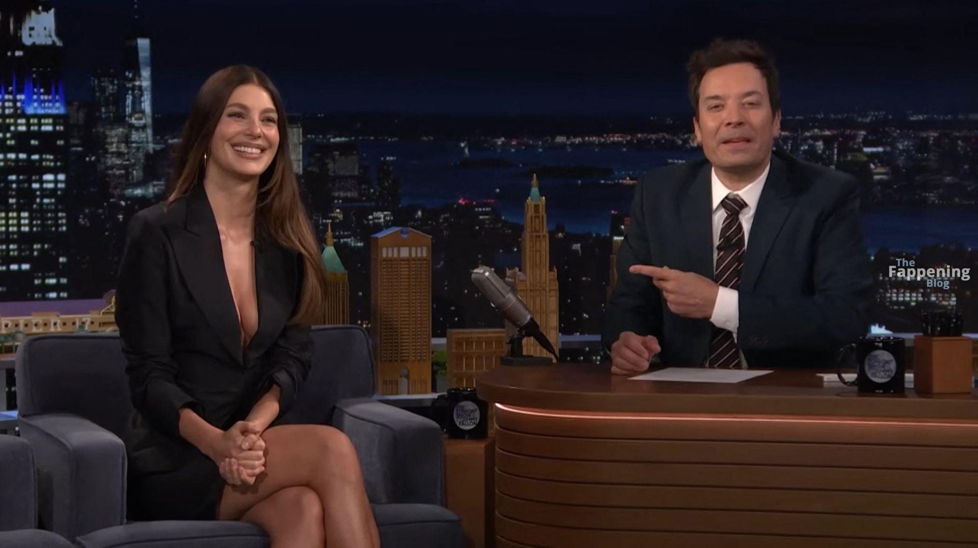 NBC model turned actress Camila Morrone risked a costume malfunction when she appeared on the Jimmy Fallon US chat show.