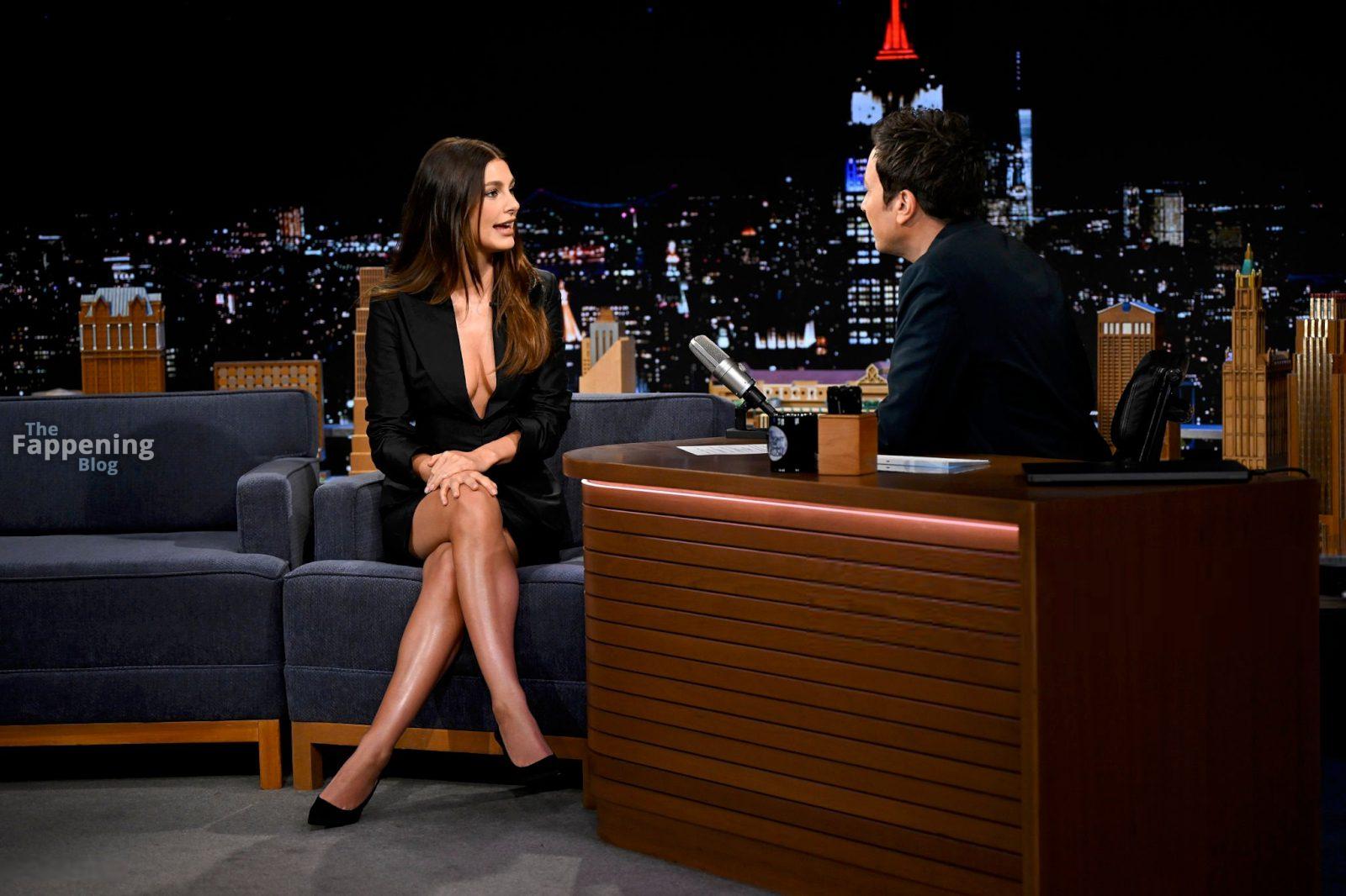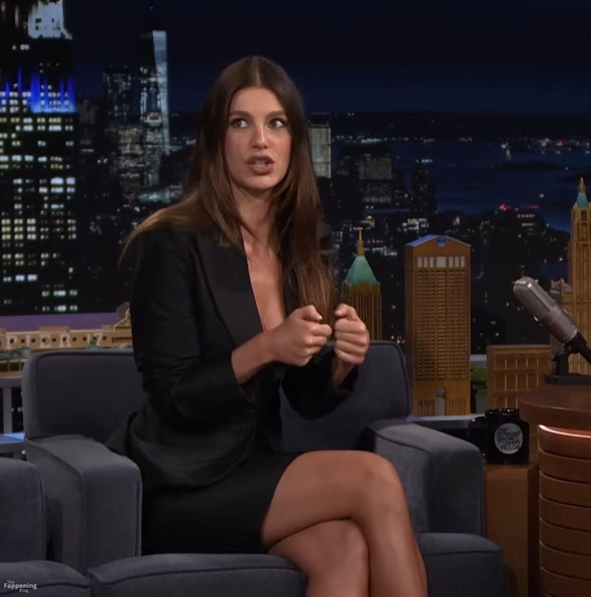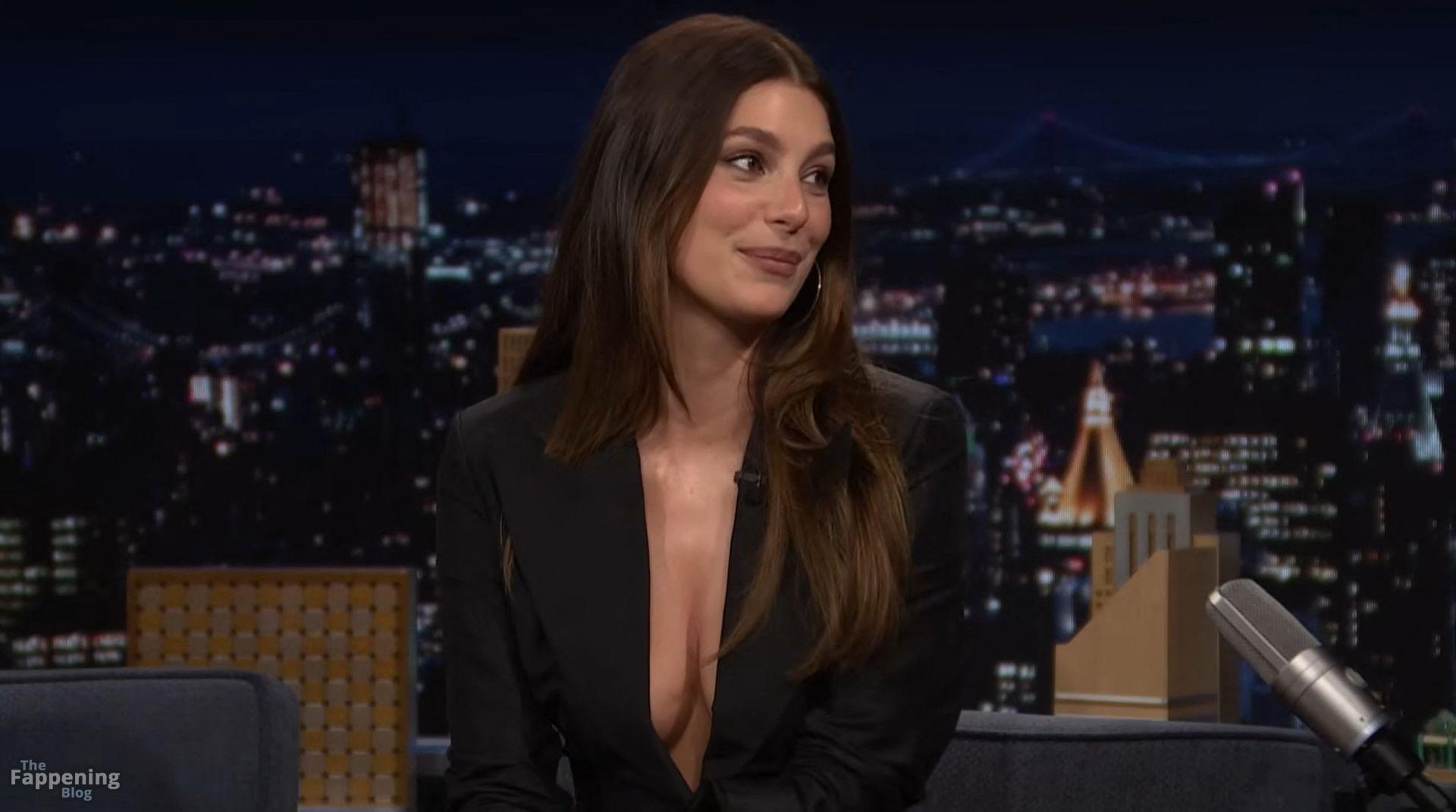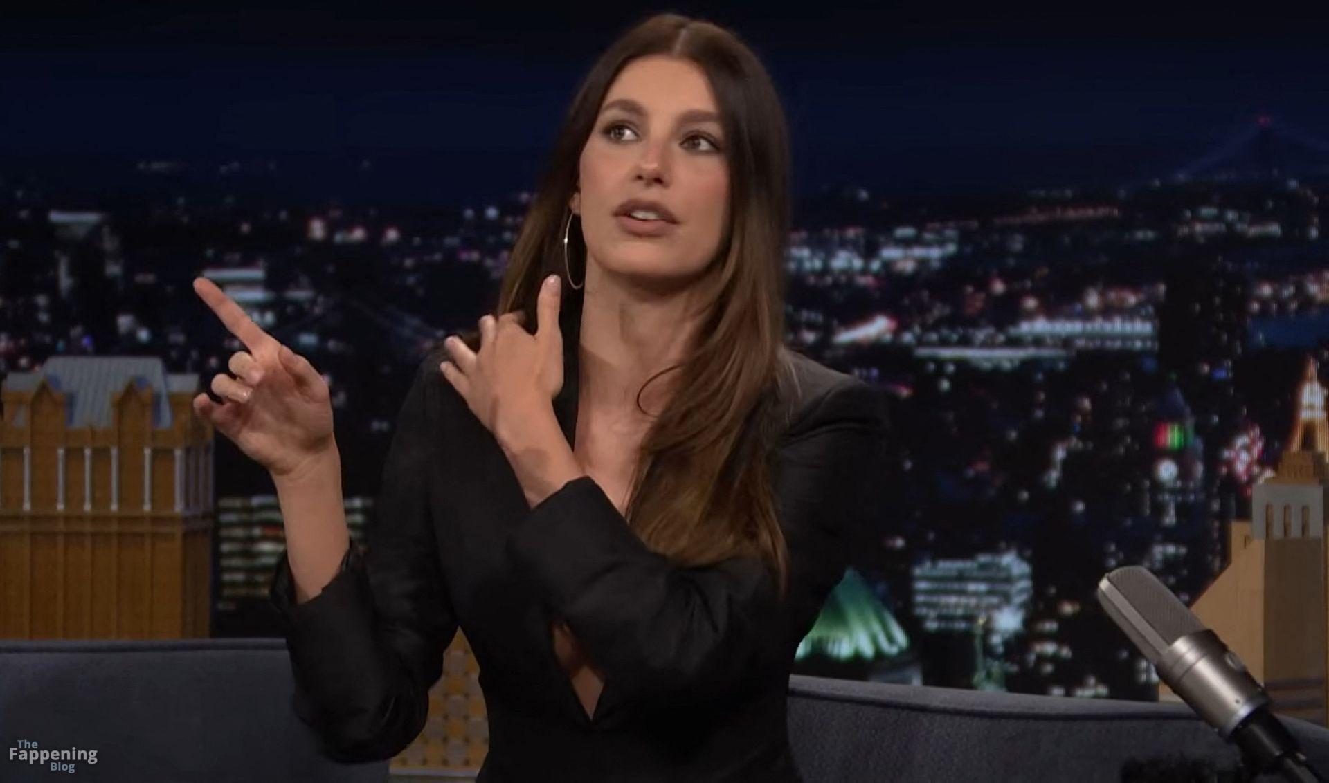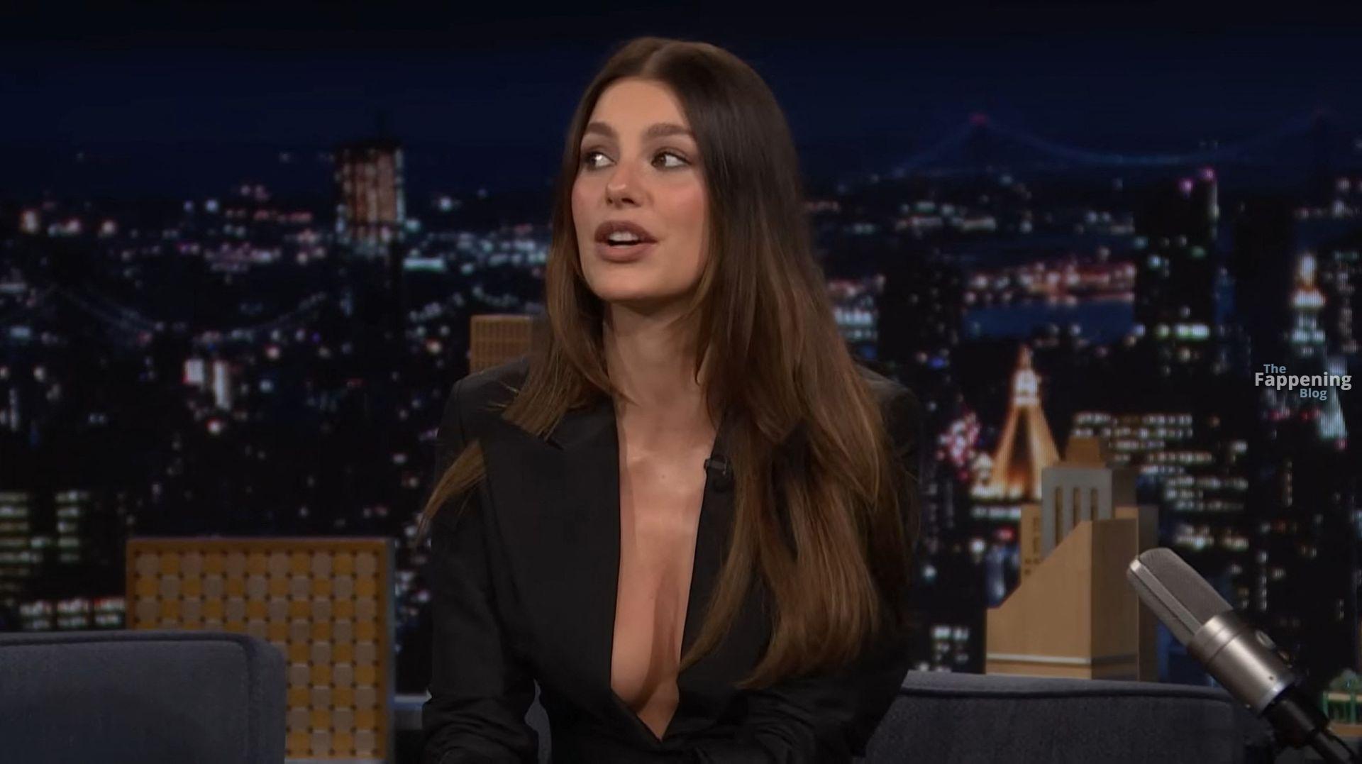 NBC model turned actress Camila Morrone risked a costume malfunction when she appeared on the Jimmy Fallon US chat show.