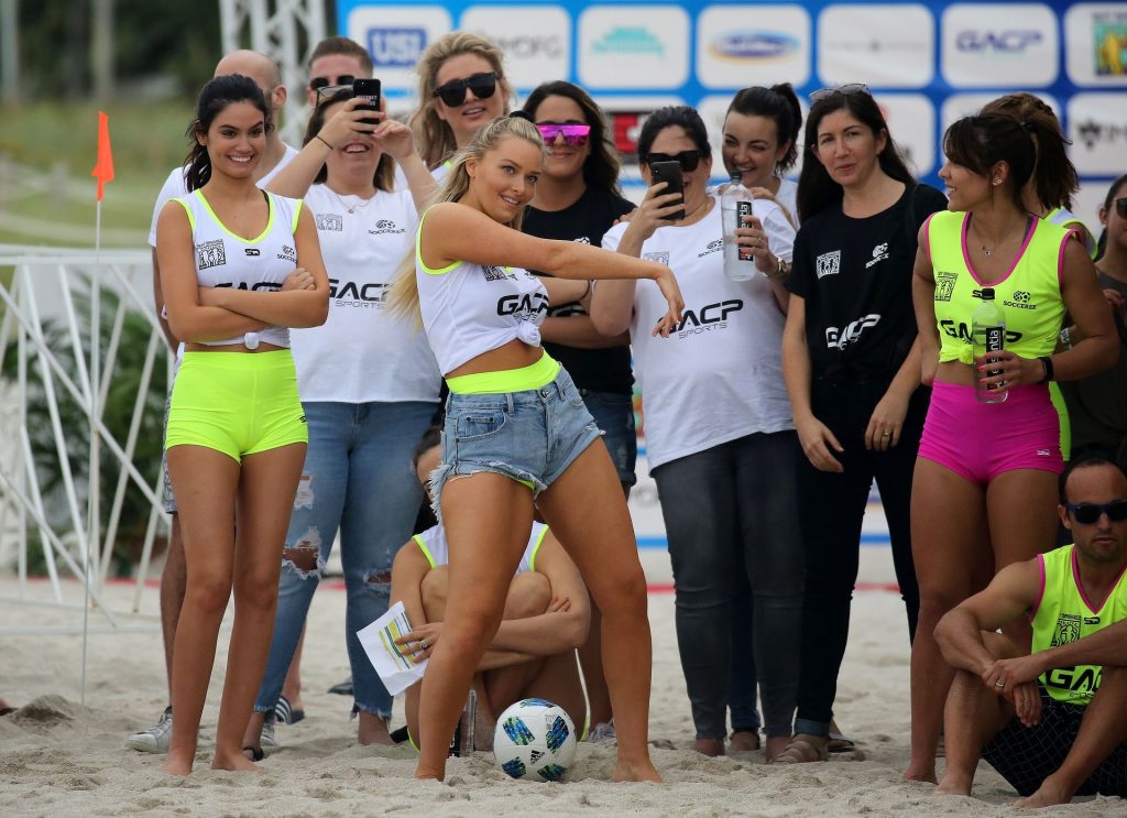 Athletics Illustrated design Camille Kostek (26) commands attention as she exhibits off her dance moves and flirts with actor Ryan Phillippe throughout a charity soccer match on Miami Beach front, 11/17/2018.