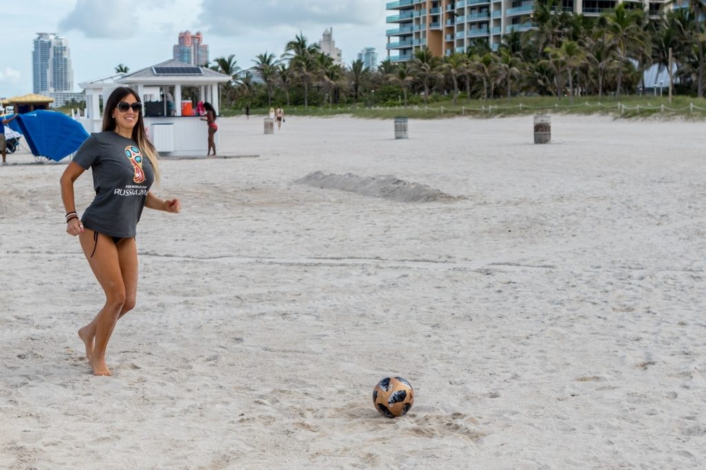 Italian referee, model, reality Television set star and soccer supporter Claudia Romani (36) on South Seaside celebrating the begin of the Planet Cup, 06/13/2018. She came out putting on the official Russian 2018 jersey and her common further compact thong. Italy isn’t in this time, but Claudia is prepared.