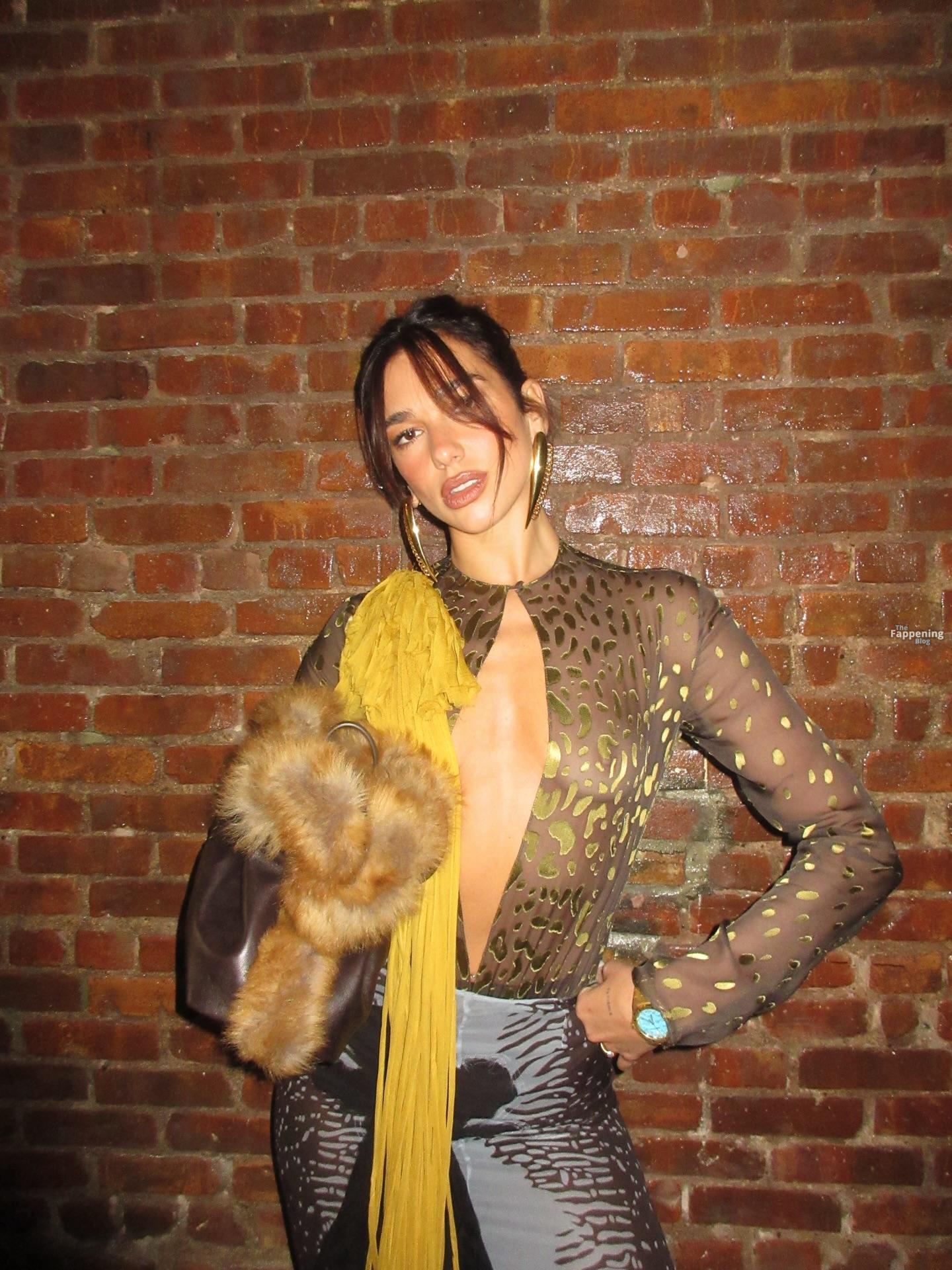 Singer Dua Lipa goes full braless in a sheer top that hides nothing – tits out, hard nipples completely visible.