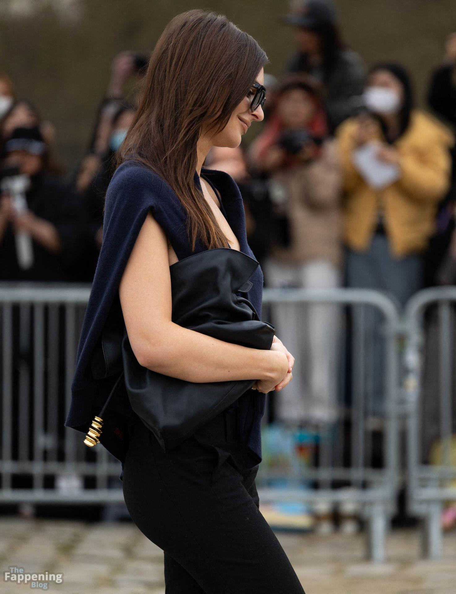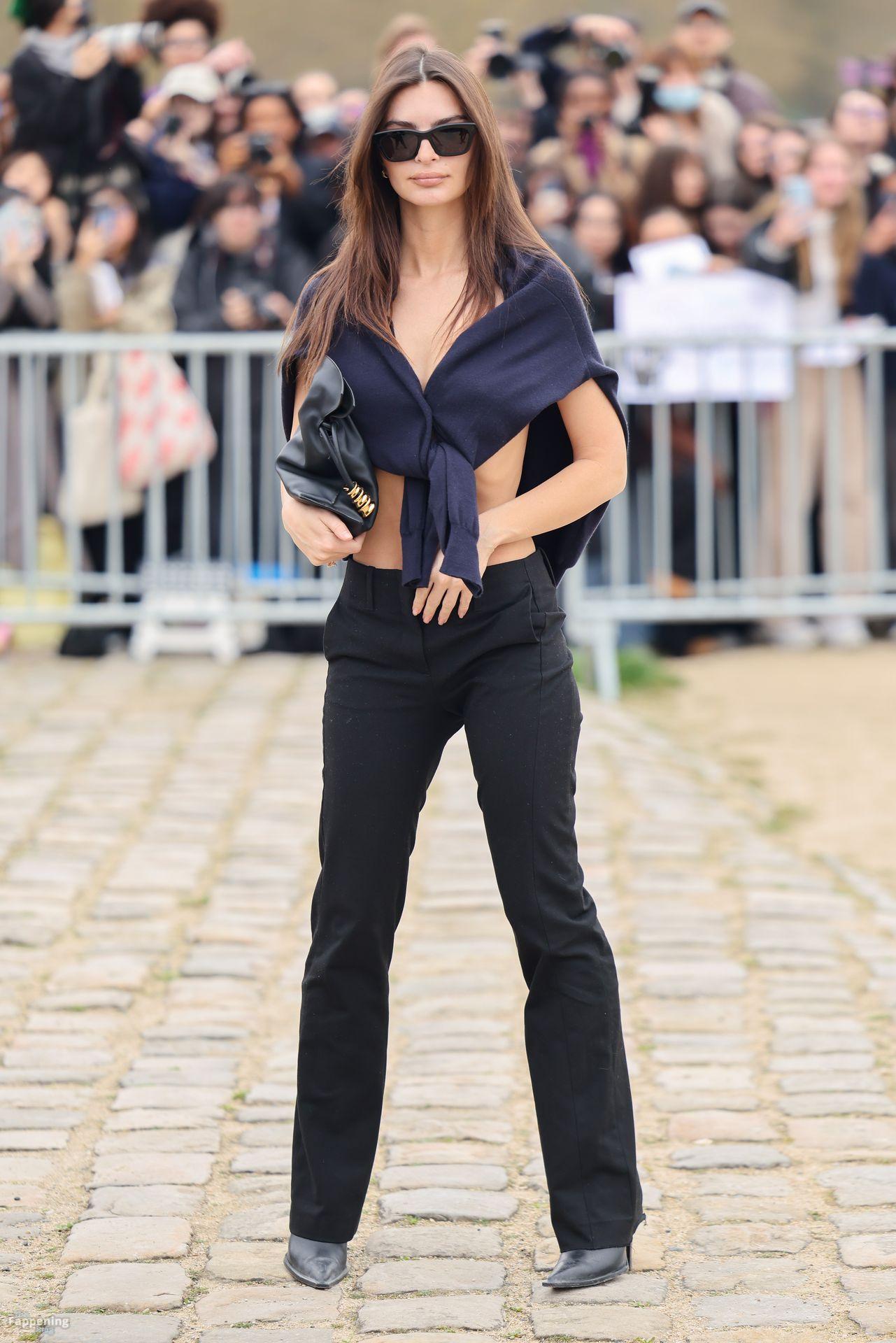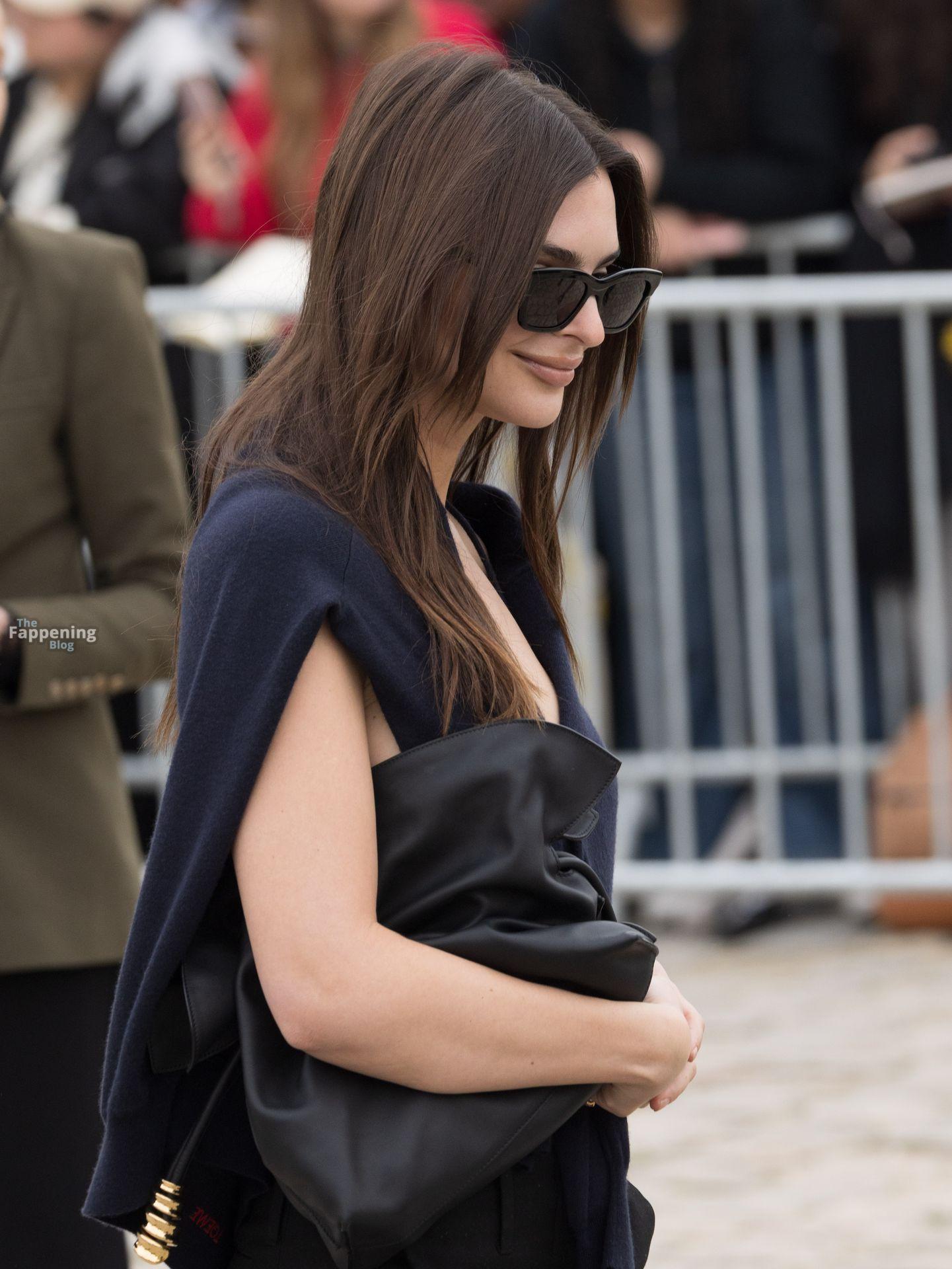 Emily Ratajkowski goes braless, flauntin’ her underboob while arrivin’ at the Loewe show during Fashion Week in Paris, France.