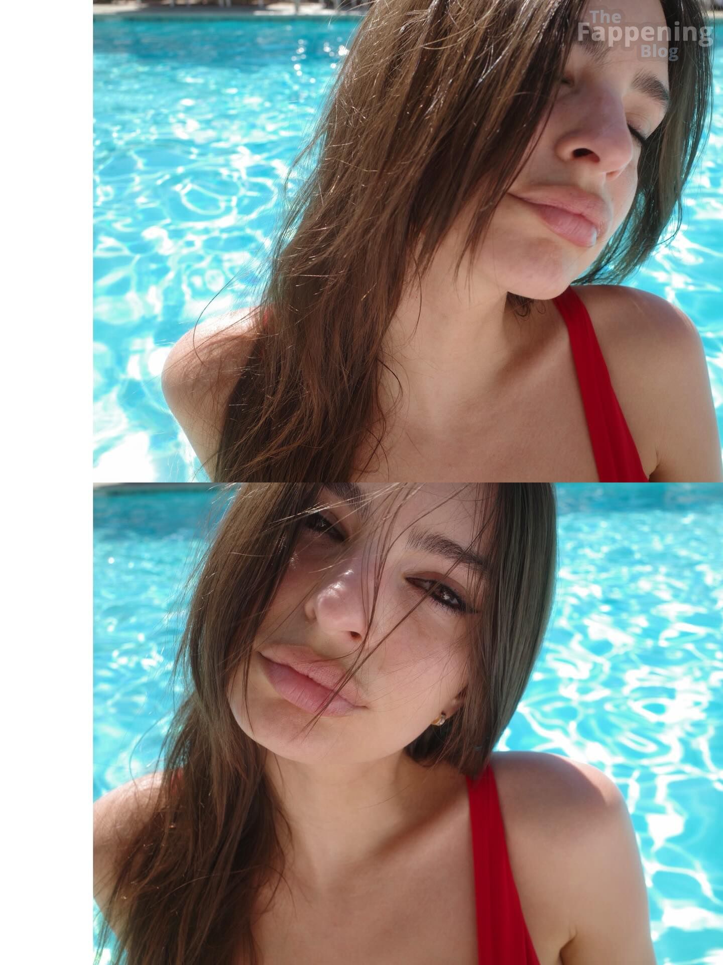 The Fappening Star Emily Ratajkowski shows off her sexy body, wearing a red swimsuit as she enjoys a day poolside.