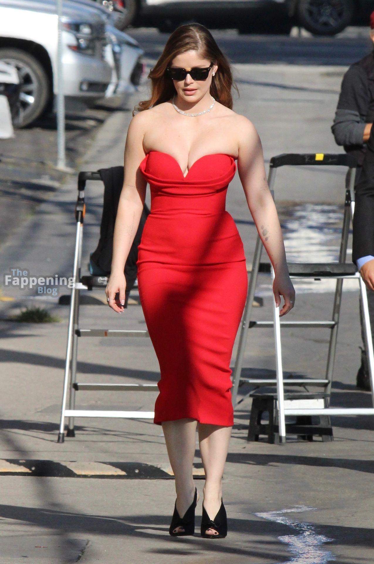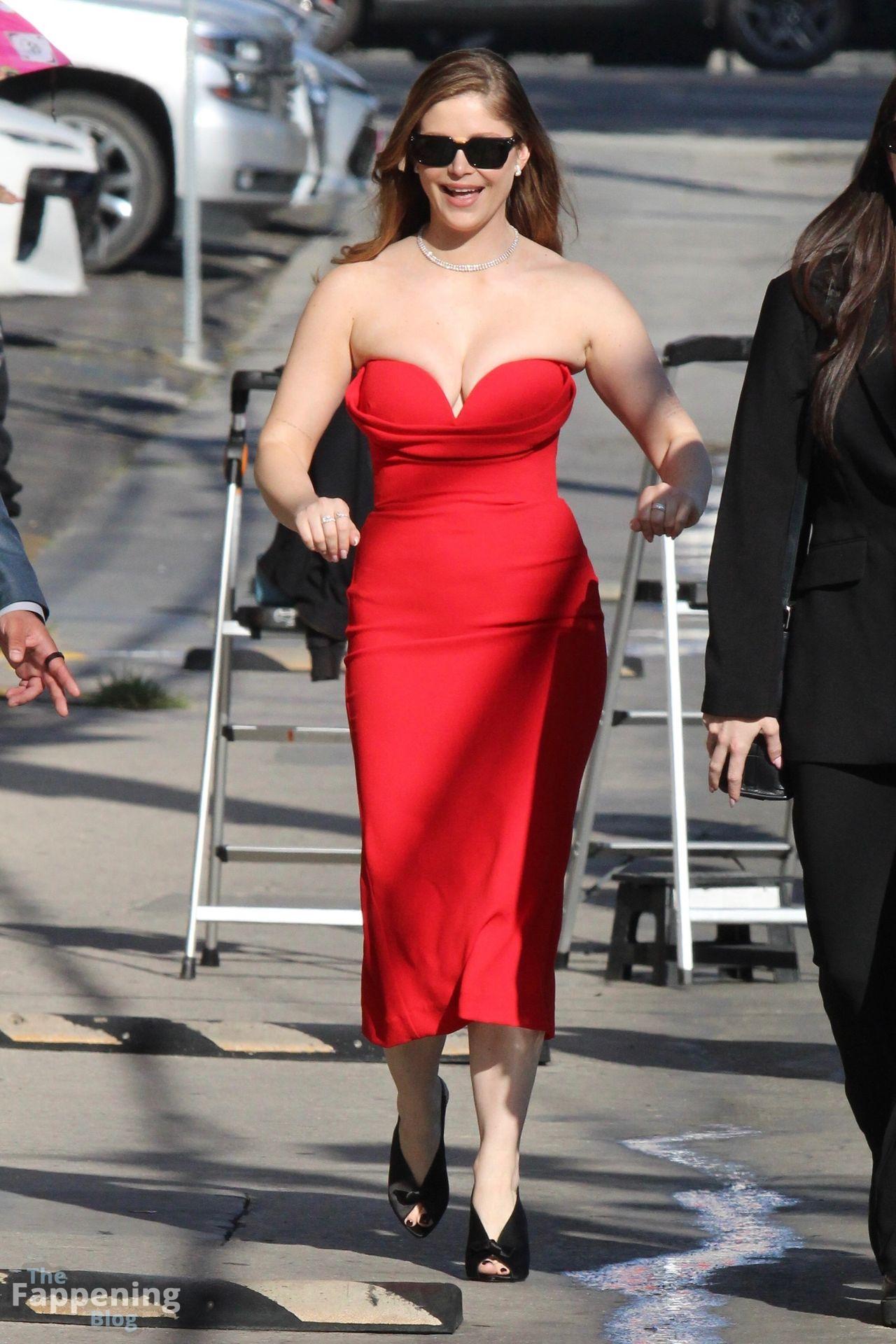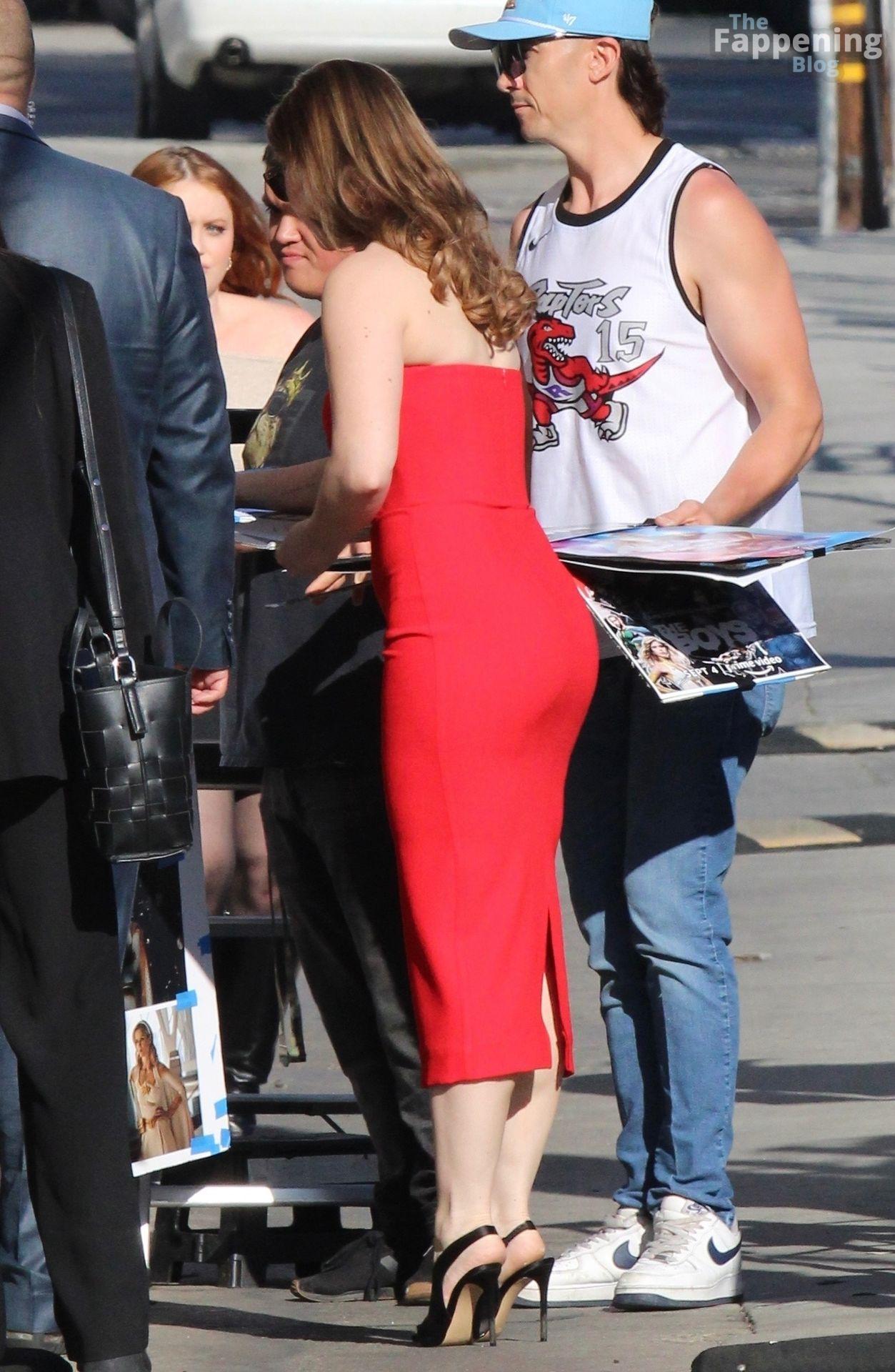 Erin Moriarty made a bold arrival at Jimmy Kimmel Live! in Hollywood, stunning in a curve-hugging red strapless dress and black heels. “The Boys” star waved to fans with a smile, bringing classic glam energy to her late-night appearance.