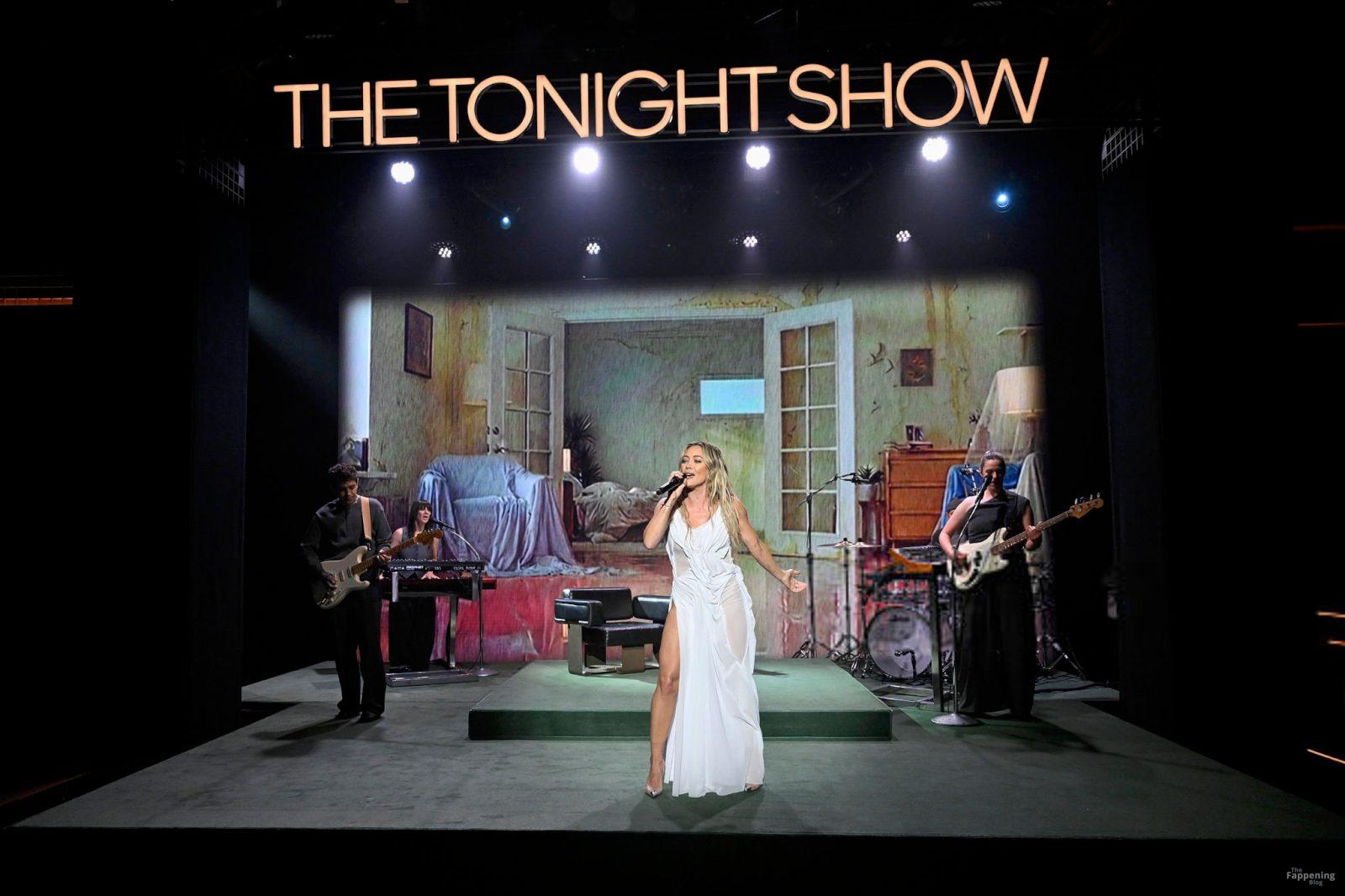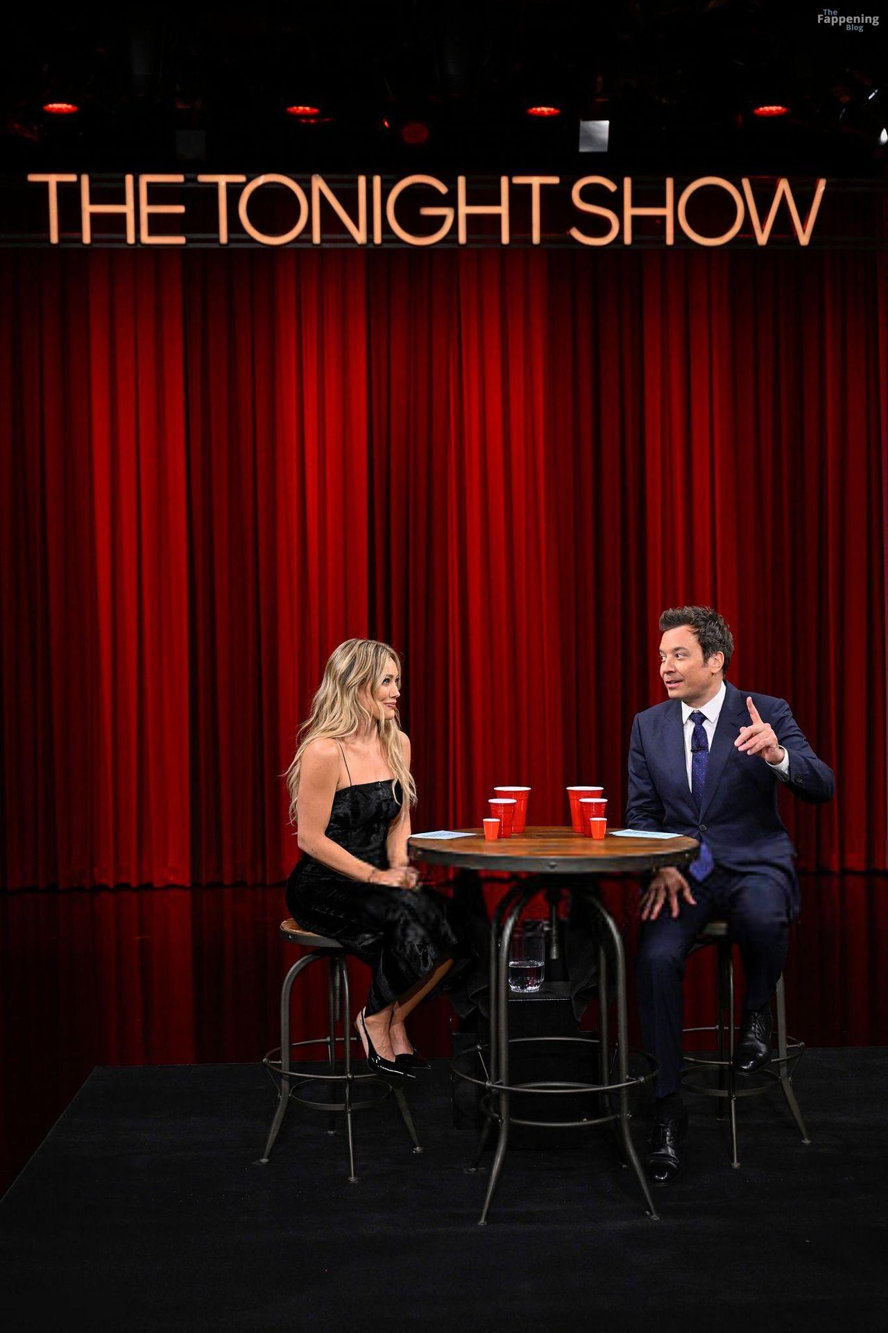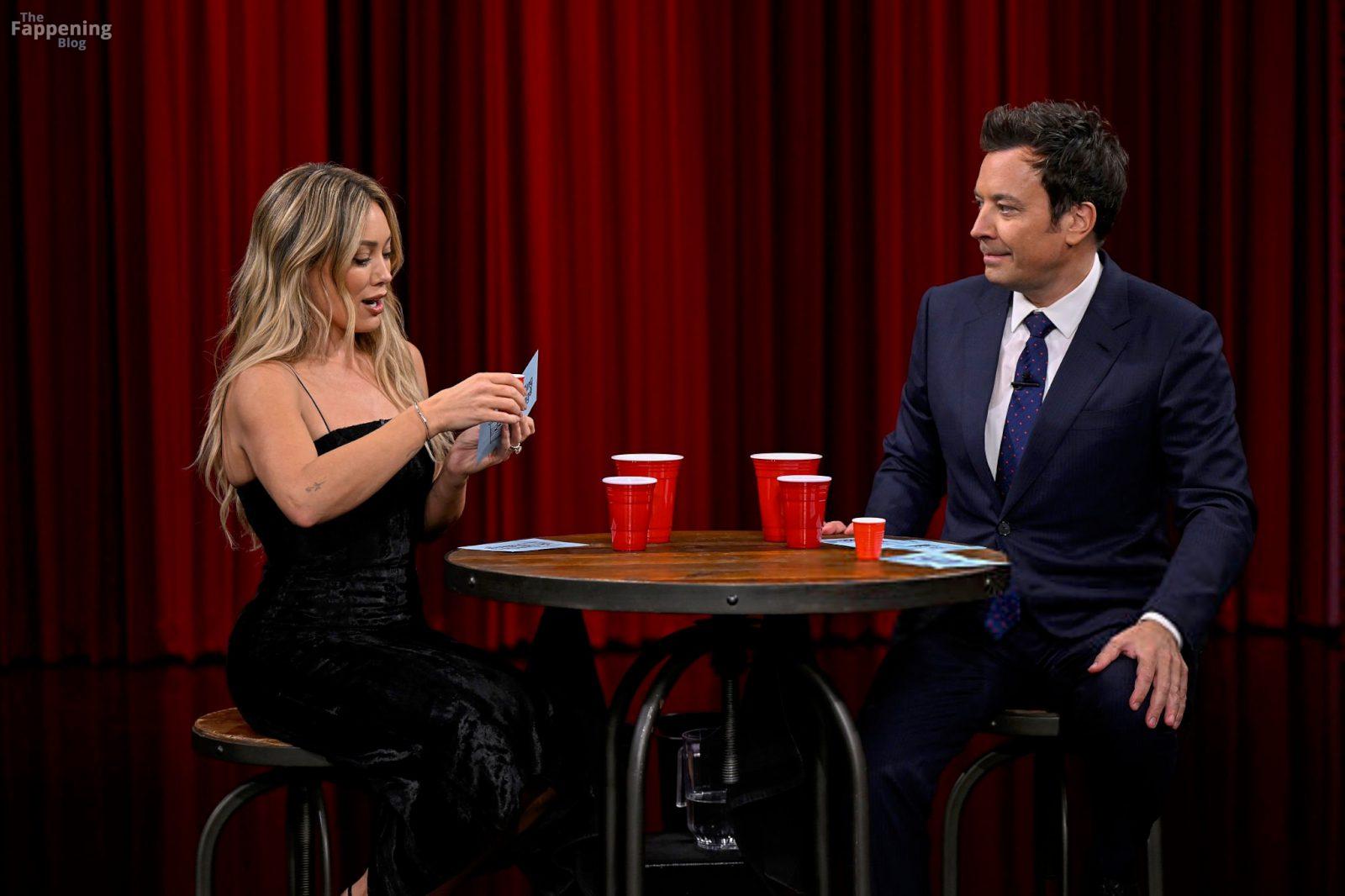 Actress/singer Hilary Duff looks sexy, wearing a black dress at The Tonight Show Starring Jimmy Fallon. She performs in a white “wet” dress.