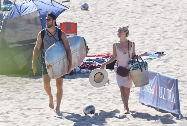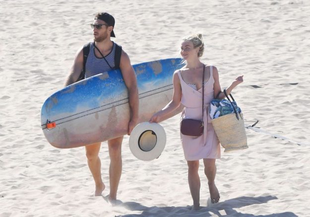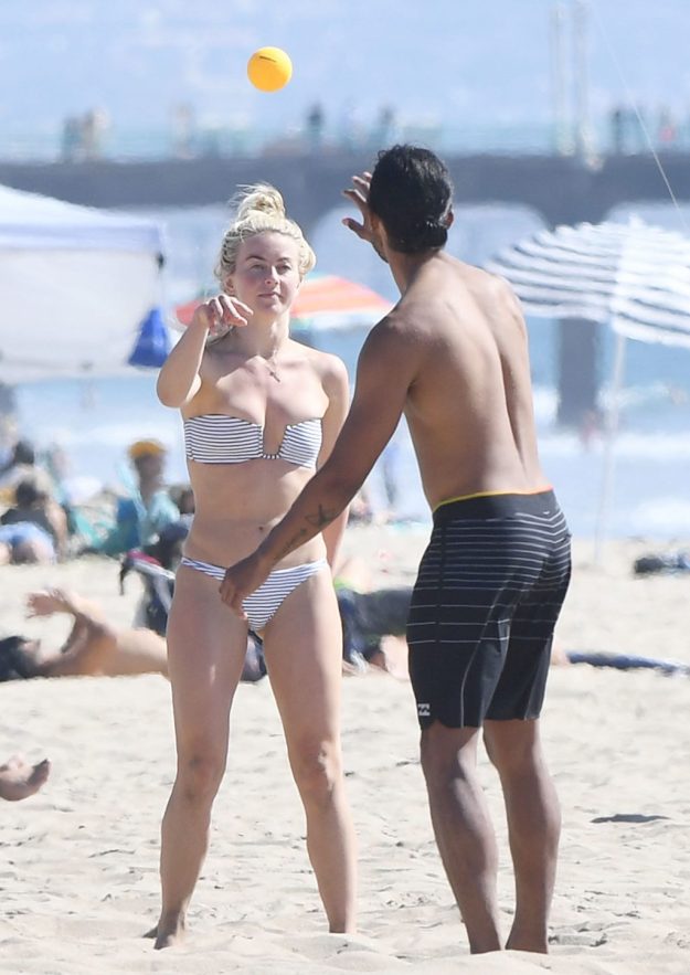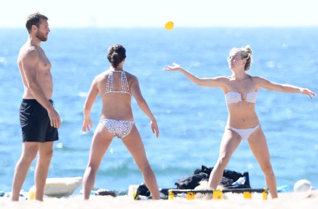 Dancer/singer/actress Julianne Hough (30) and her spouse perform Spike Ball with good friends at the beach front in Newport Beach, California, 09/23/2018. Brooks and Julianne joined two close friends for a sporty working day at the beach front in which the foursome surfed and played a seashore video game named Spike Ball together.