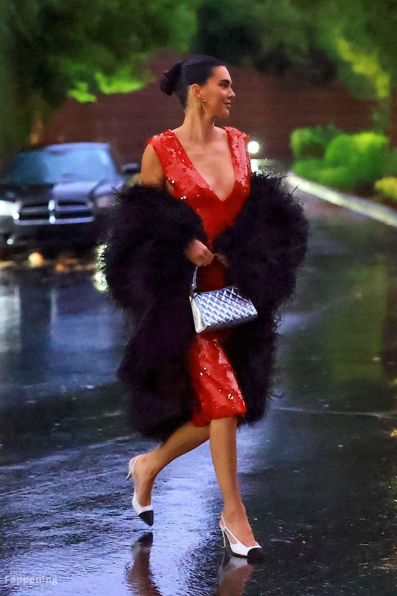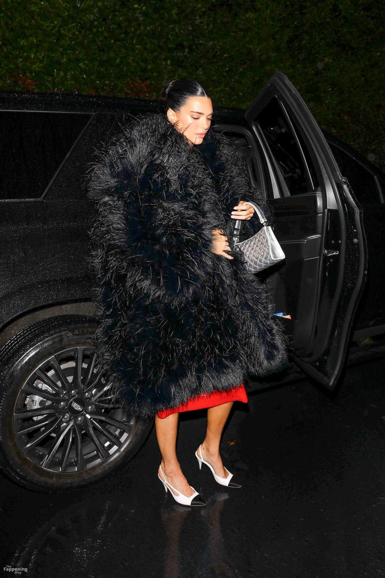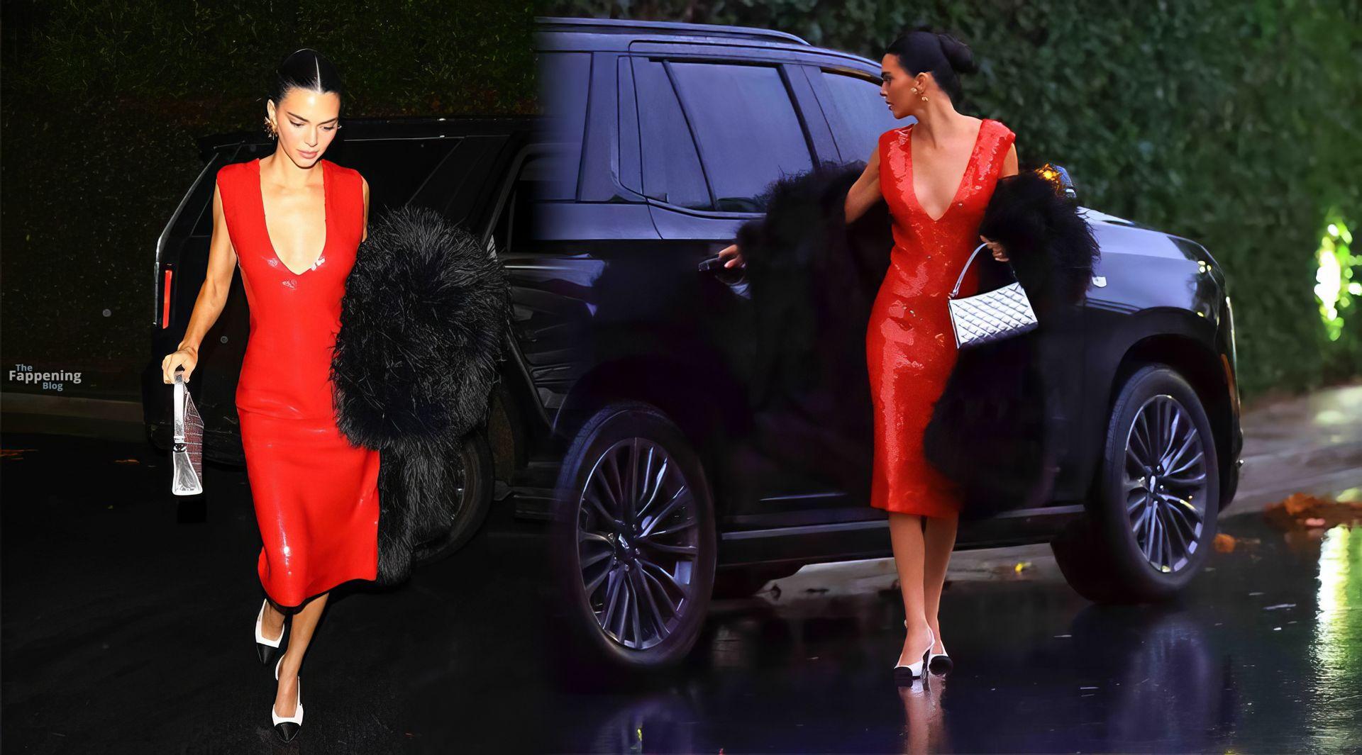Kendall Jenner is spotted arrivin’ for an evening out, stepping out of a black SUV in a striking red dress paired with a black fur coat. The model completed the look with white heels and a silver handbag, keepin’ things sleek and glamorous as she made her way inside.