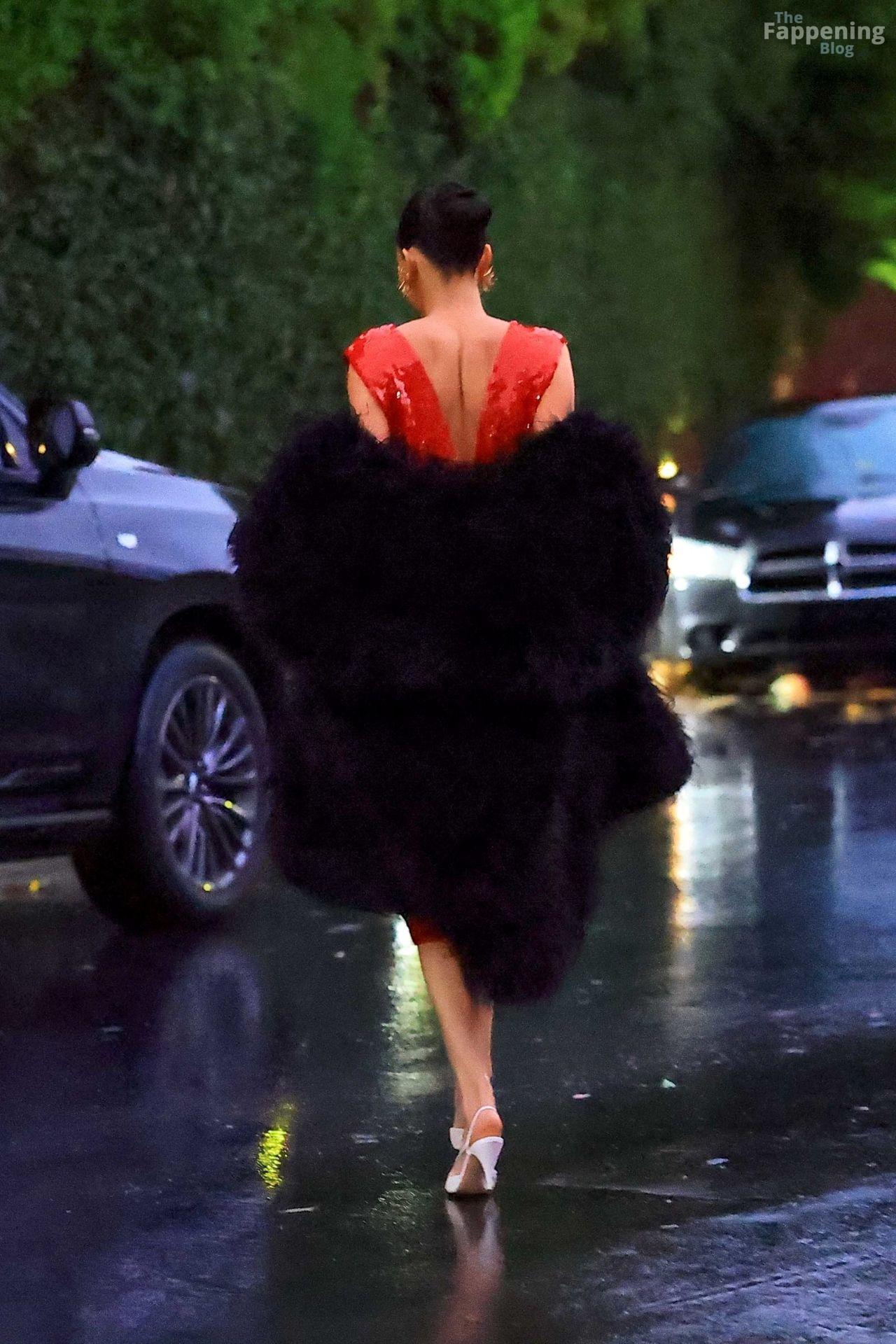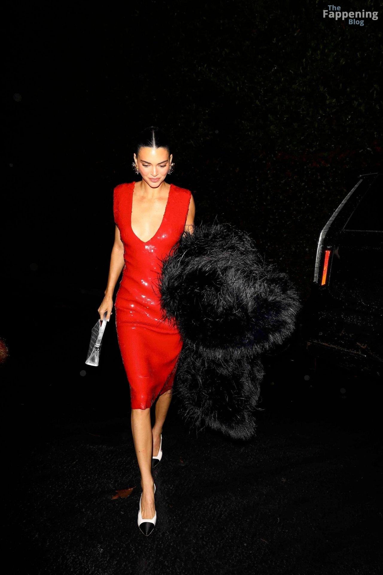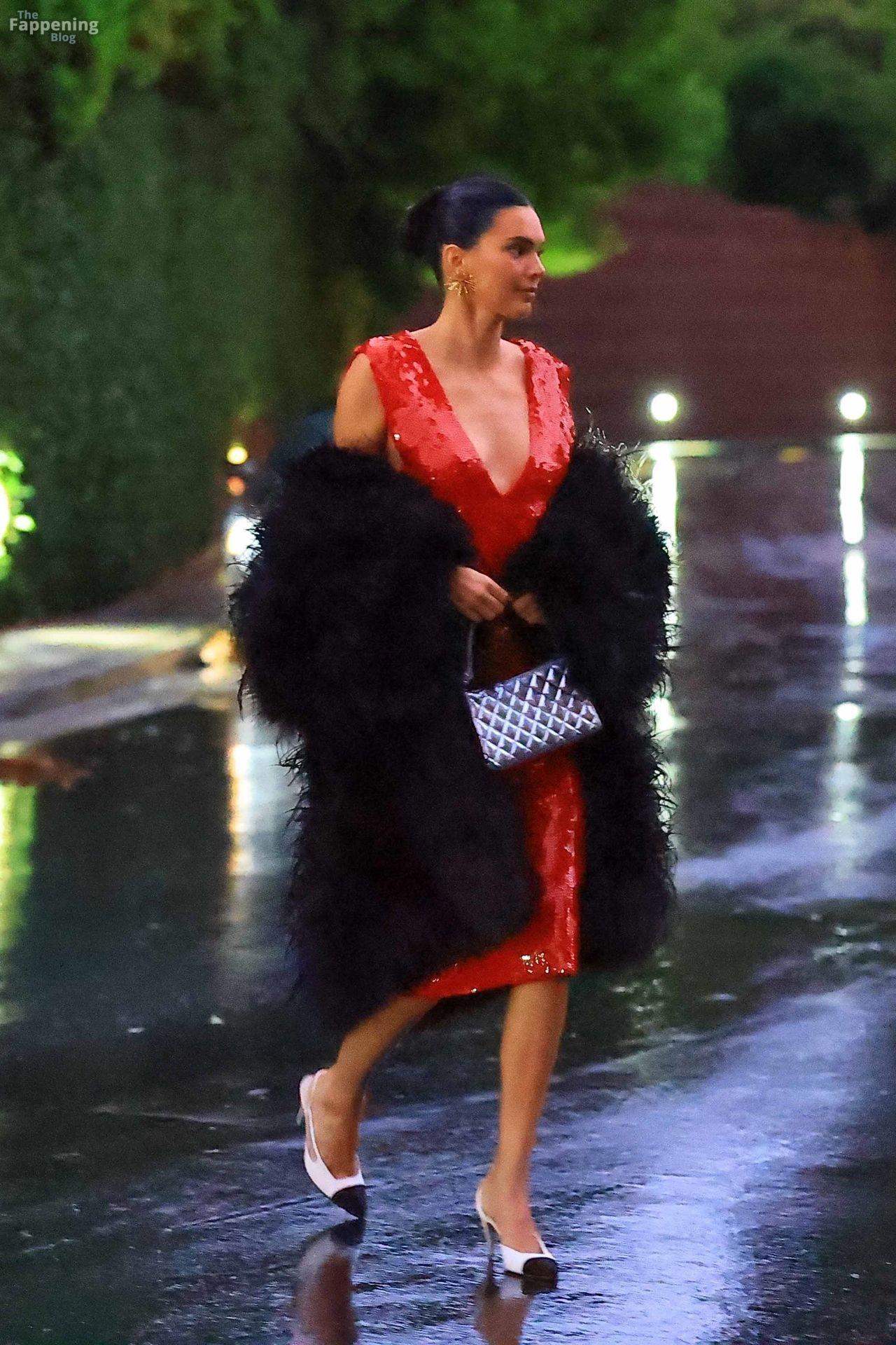 Kendall Jenner is spotted arrivin’ for an evening out, stepping out of a black SUV in a striking red dress paired with a black fur coat. The model completed the look with white heels and a silver handbag, keepin’ things sleek and glamorous as she made her way inside.