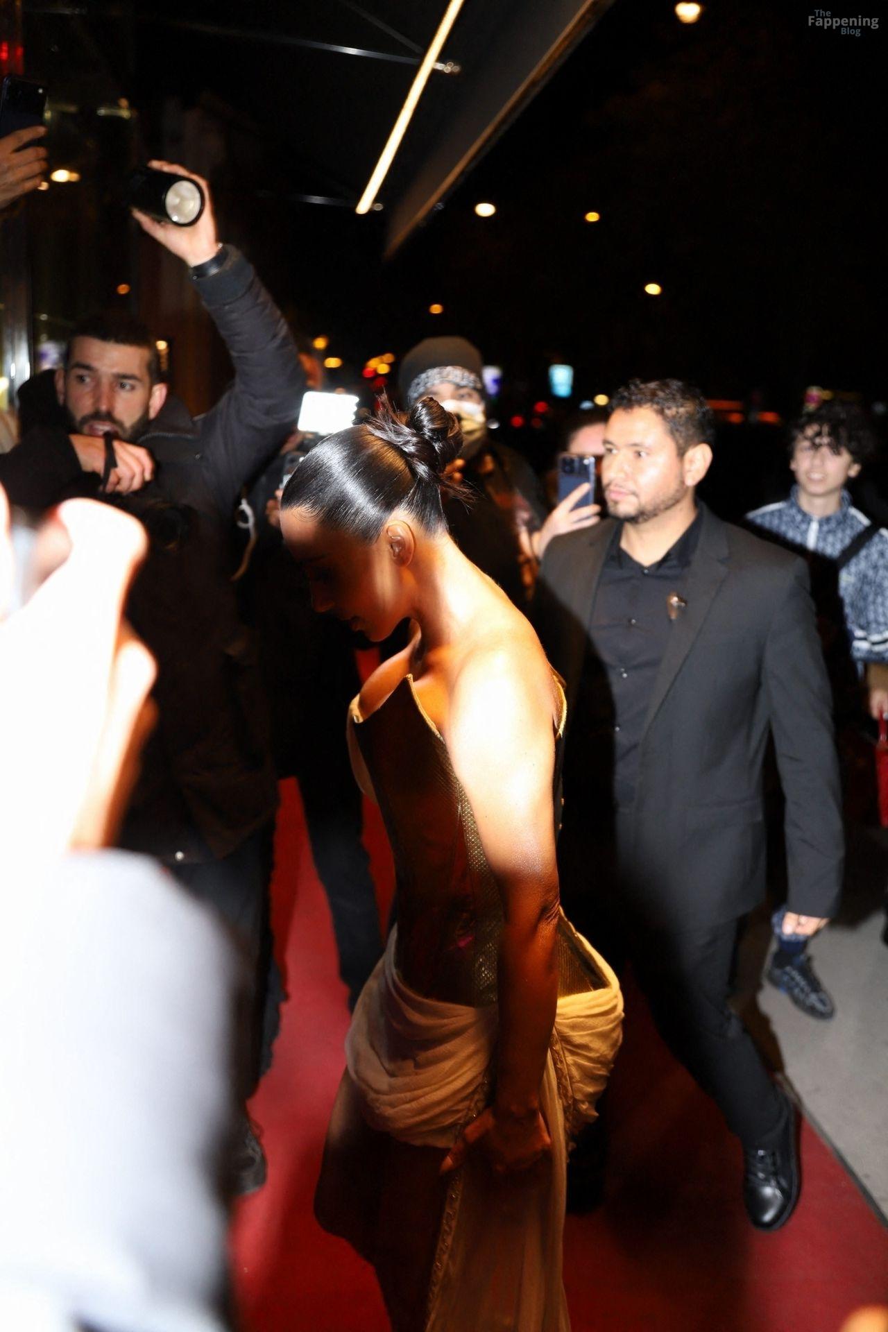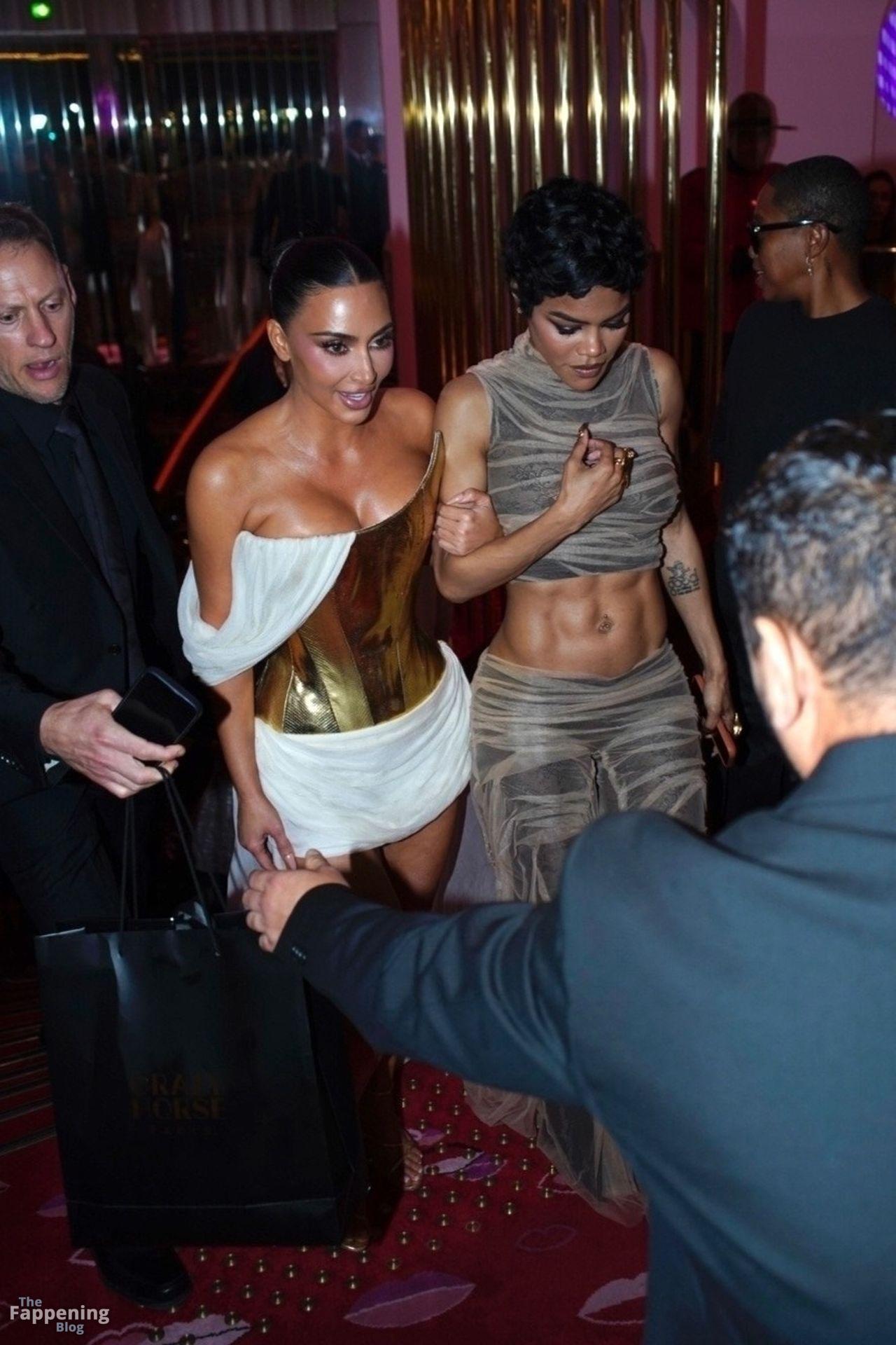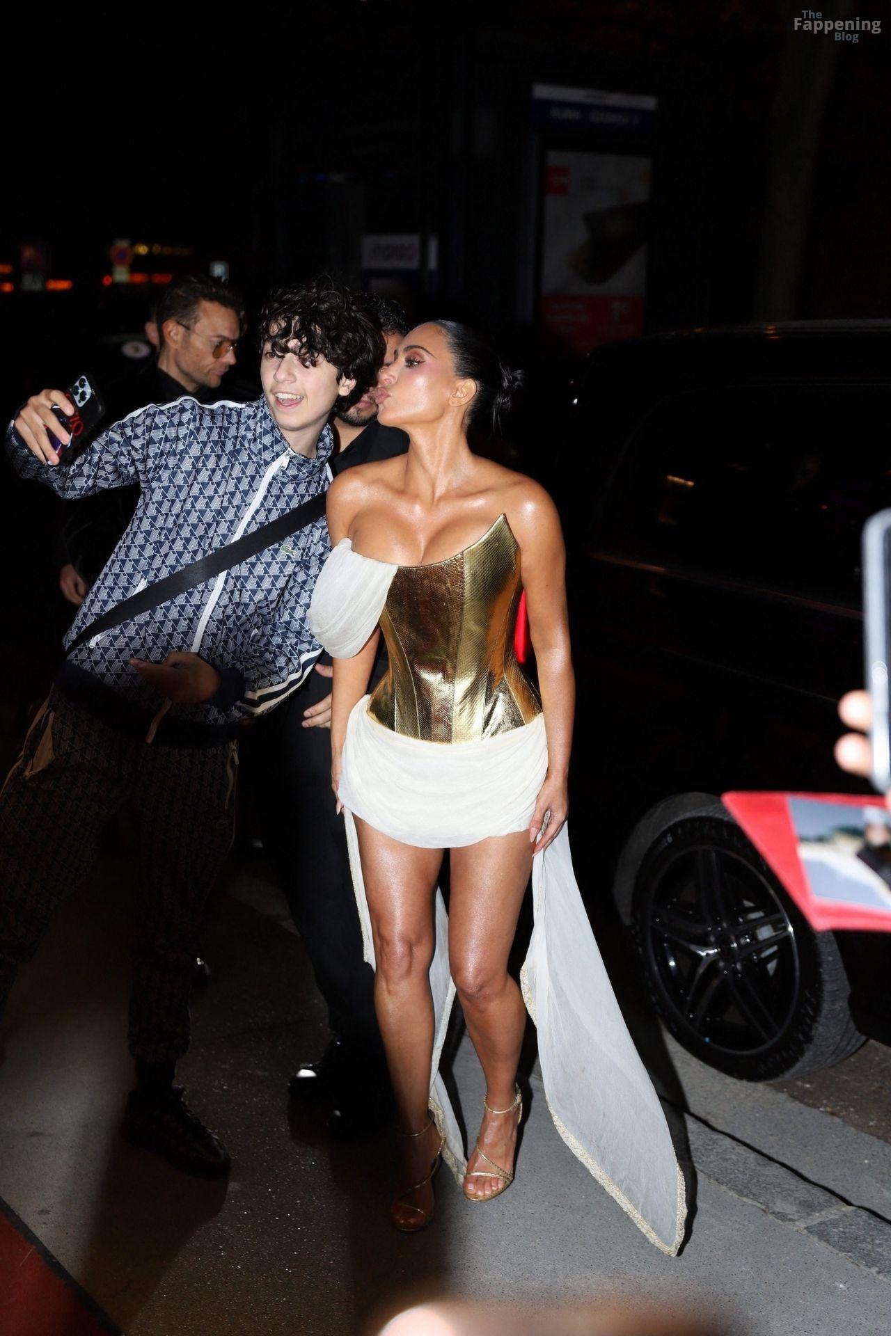 Kim Kardashian rocked up to Crazy Horse in Paris for her 45th birthday bash after the premiere of her Disney+ series All’s Fair. She slipped into a gold corset dress that had her massive boobs spillin’ out with insane cleavage, paired with a high-slit skirt that flashed her body and legs.