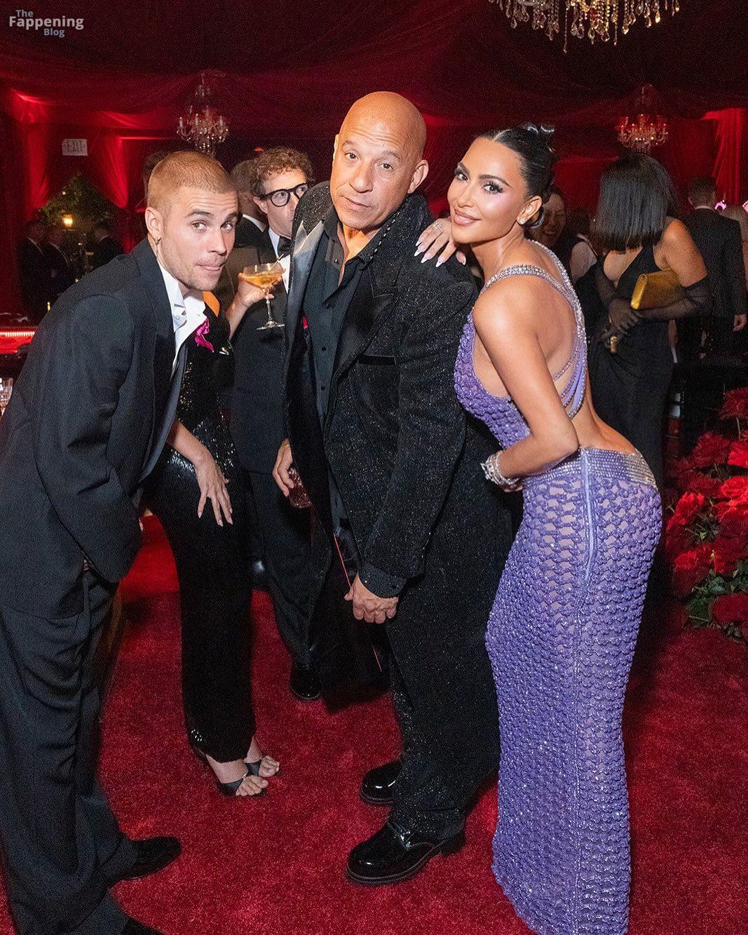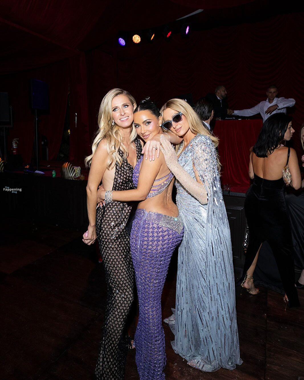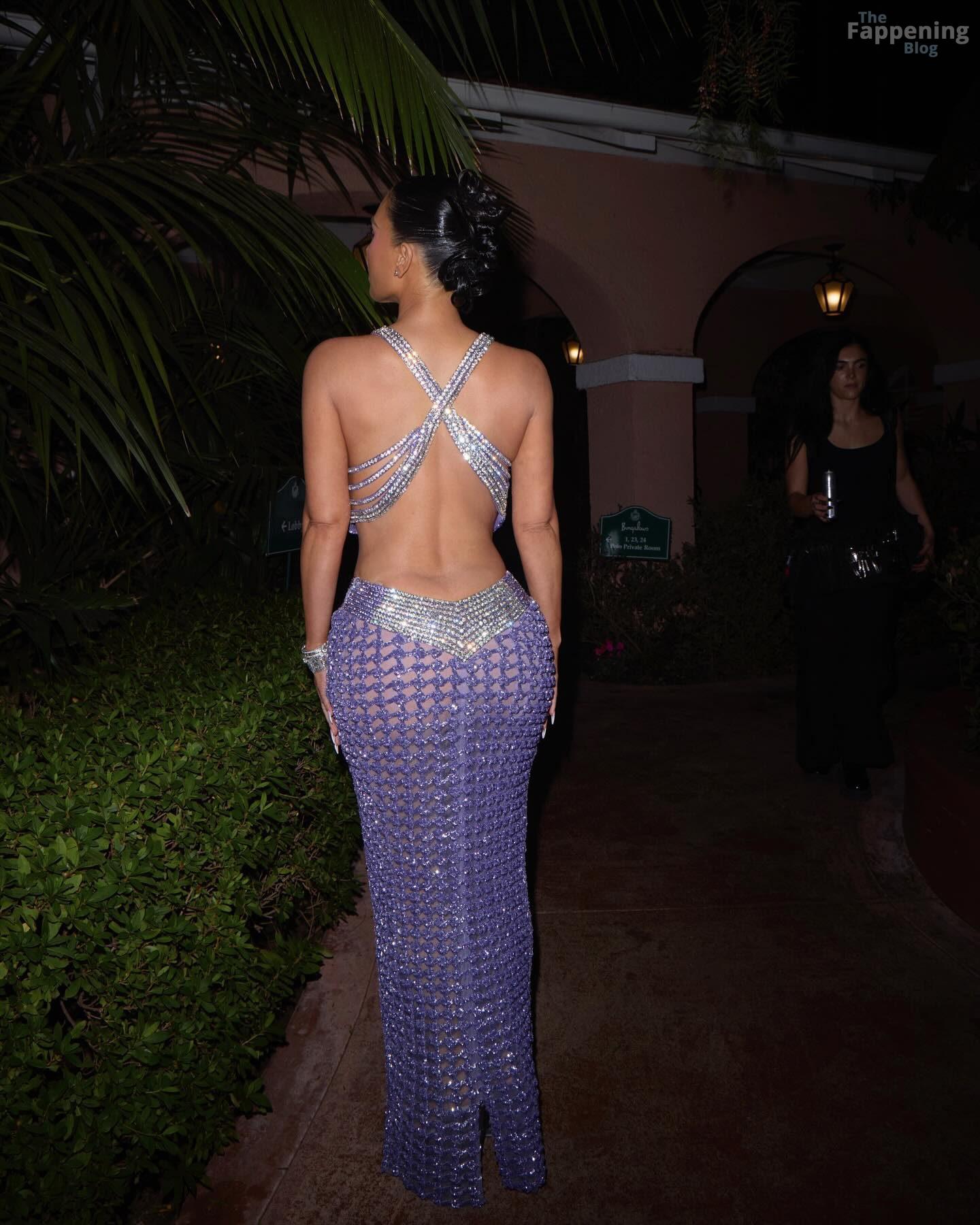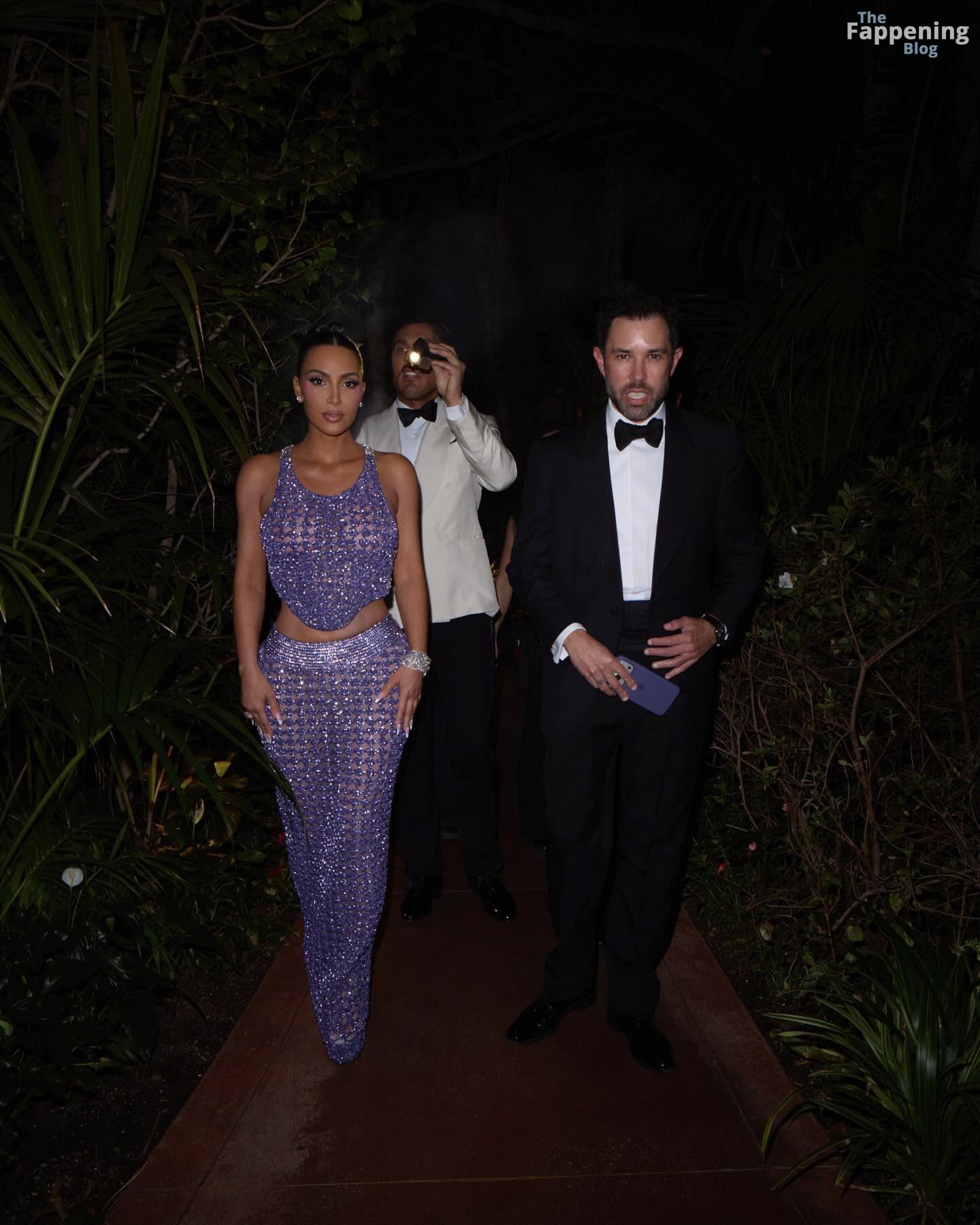 Kim Kardashian rocks a see-through purple mesh dress, showin’ her ass and boobs at a packed celeb party.