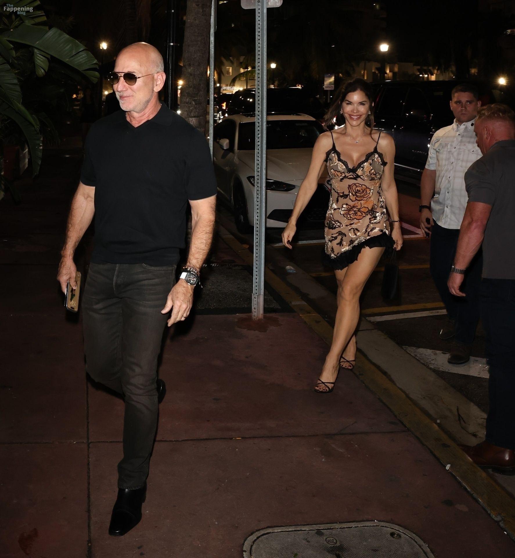 A rainy night in Miami Beach was waitin’ for Jeff Bezos and Lauren Sanchez to roll up for a romantic dinner at Carbone. Lauren showed up lookin’ sharp as always, rockin’ a skimpy black lace mini dress with floral embroidery and a ruffled hem that showed off her toned legs.