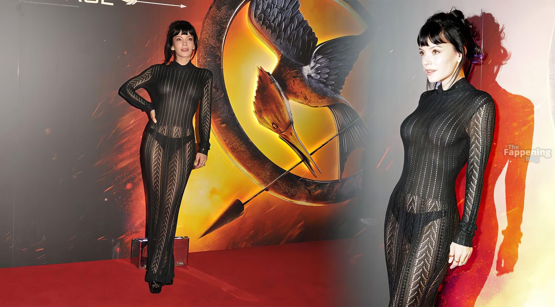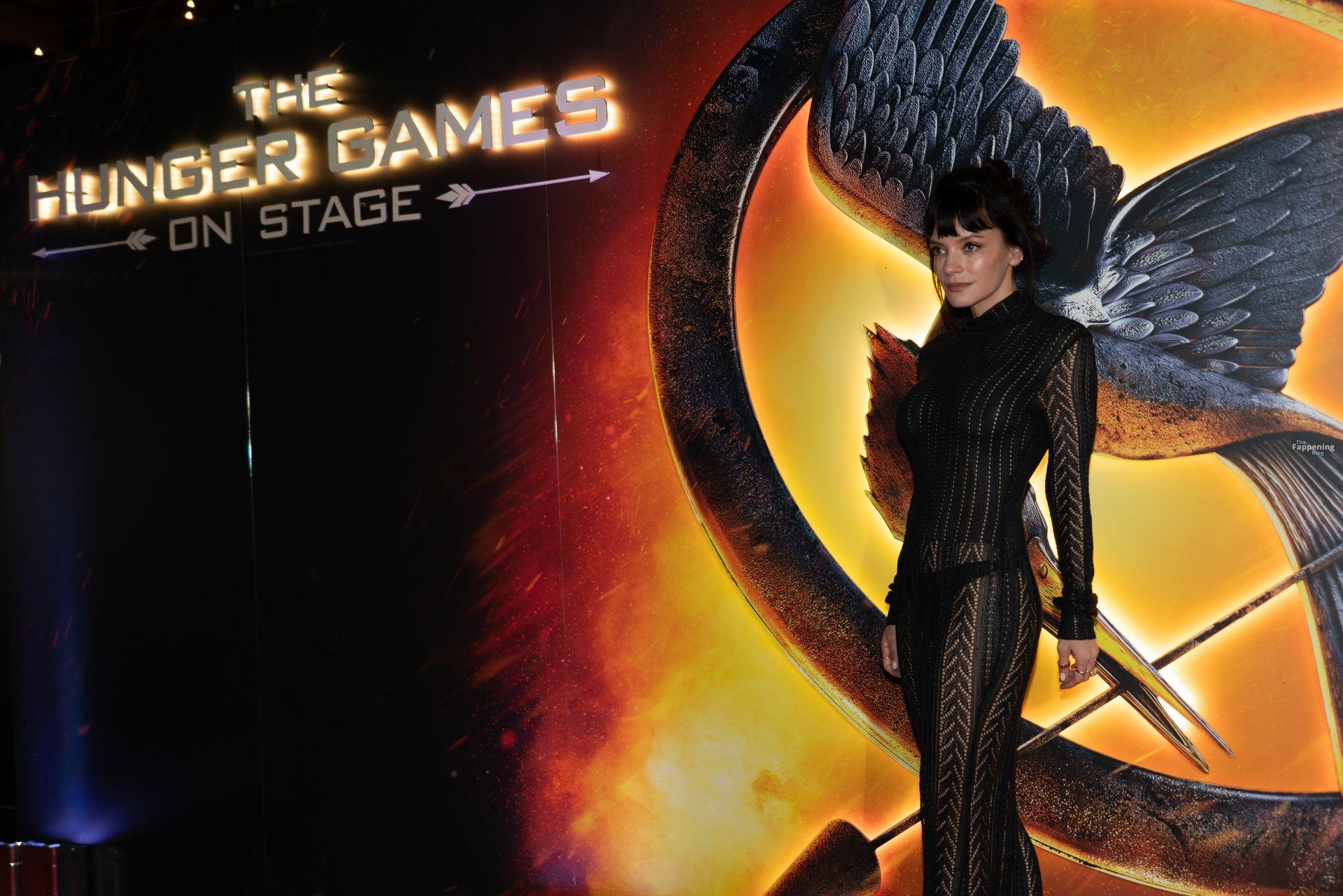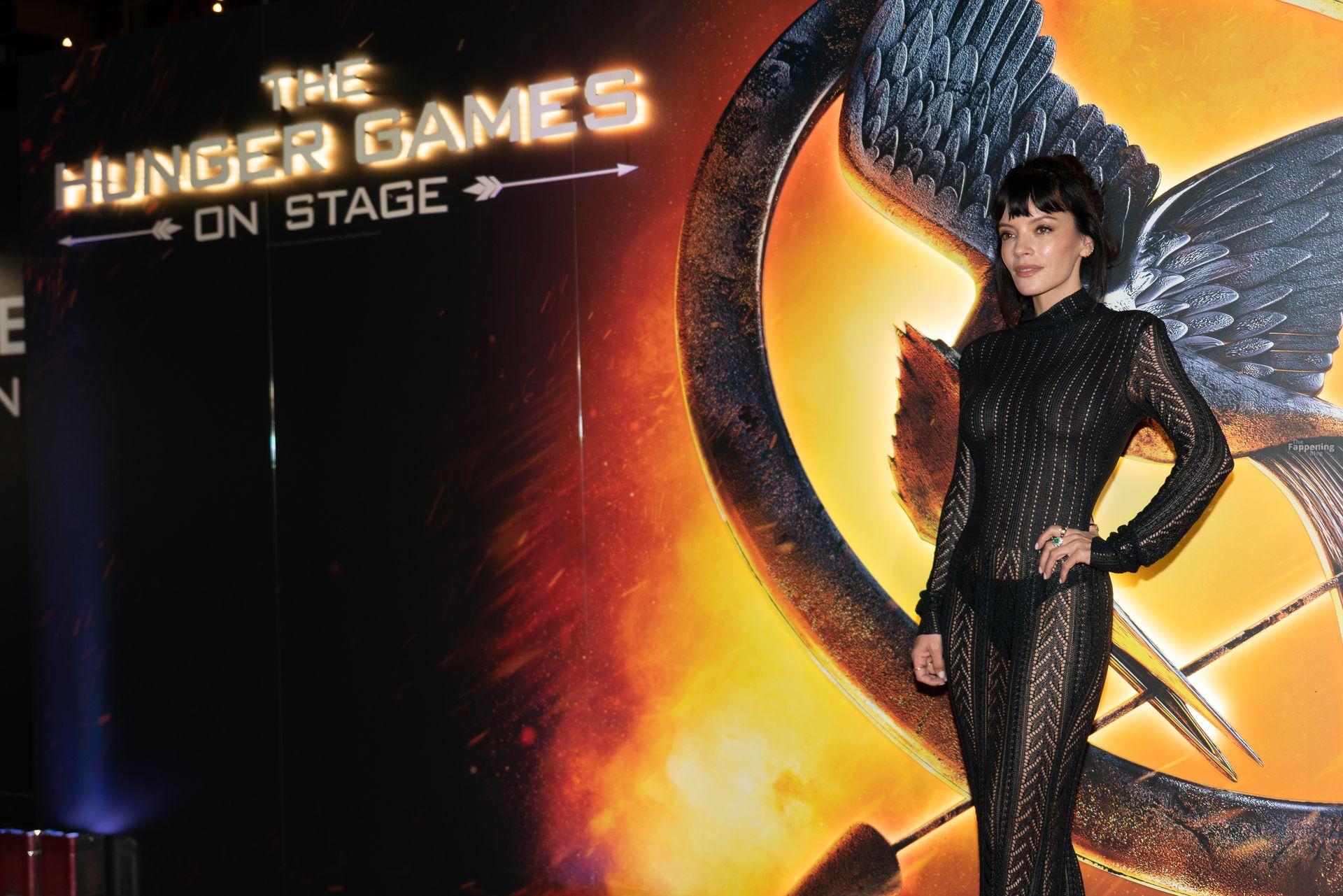 Lily Allen flashes her nipples and a thong in a see-through dress at “The Hunger Games: On Stage” premiere at Troubadour Canary Wharf Theatre in London.