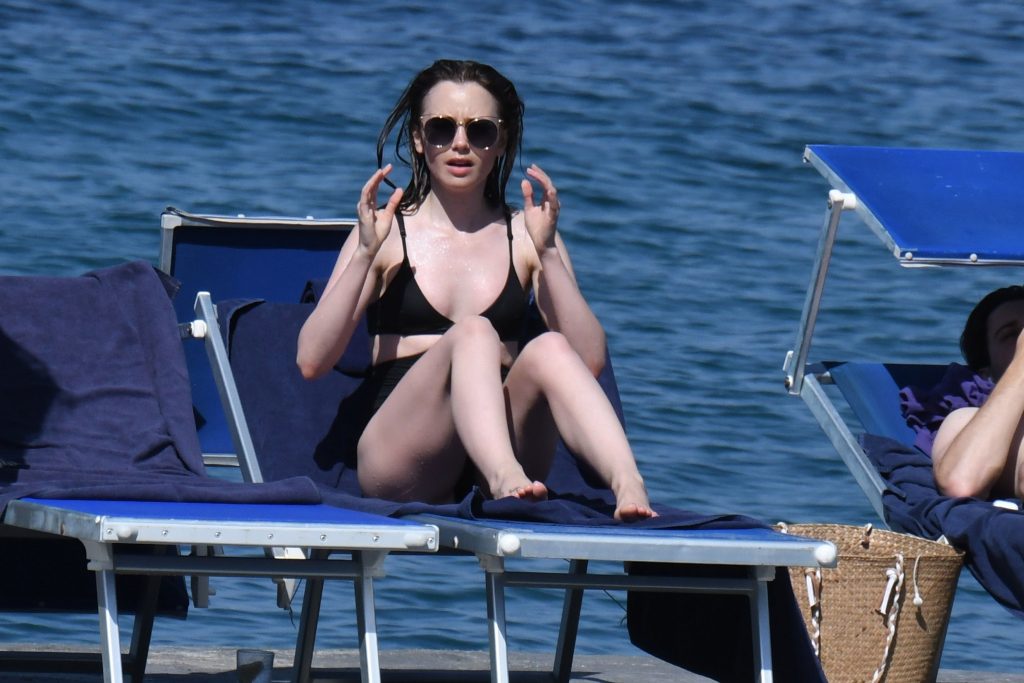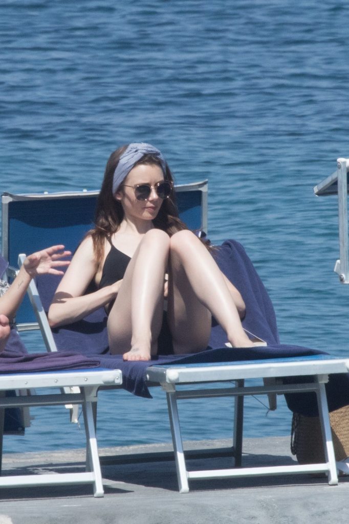 Lily Collins was spotted relaxing at the Hotel Regina Isabella in Ischia Porto, Italy, 07/15/2018. The 29-year-old actress was seen wearing a black one-piece bathing suit.