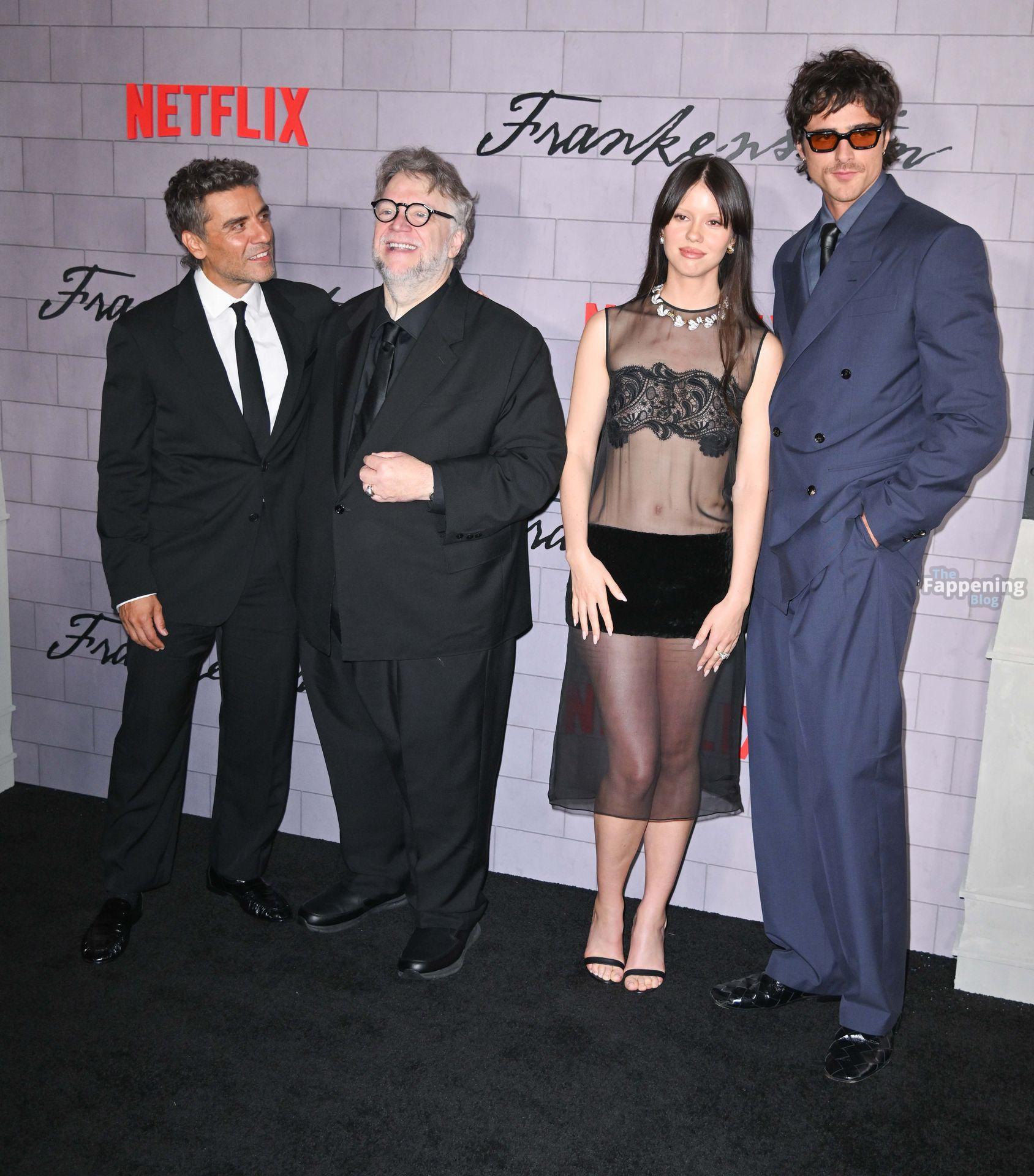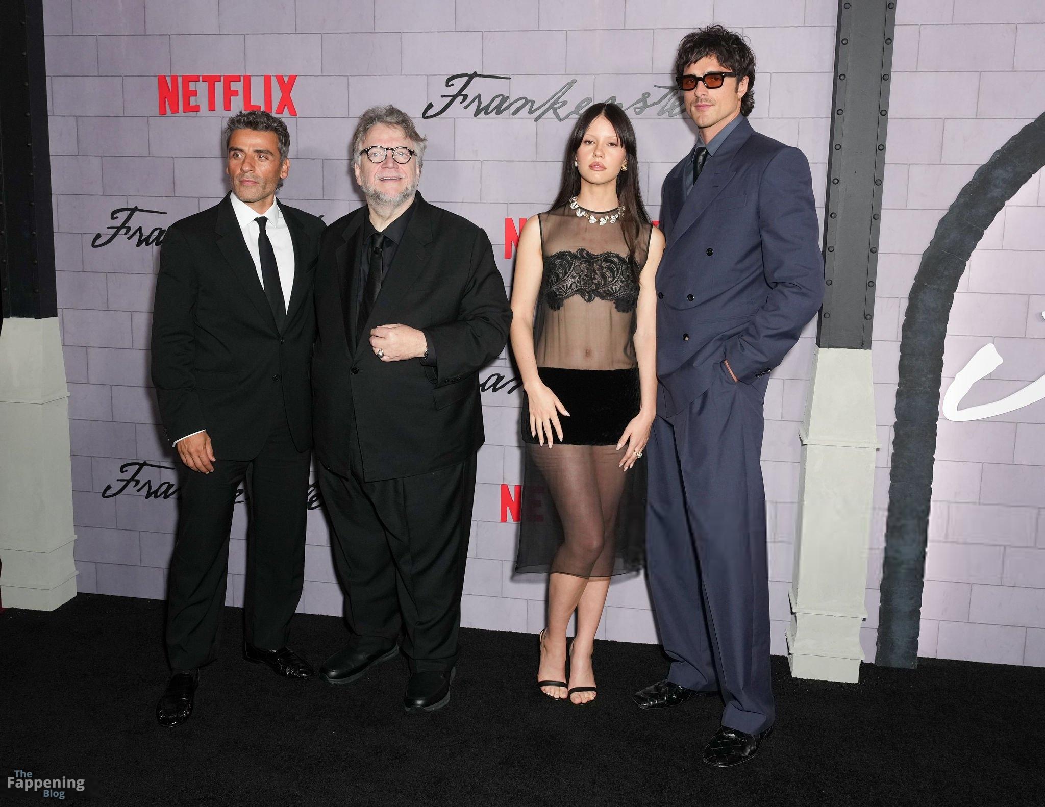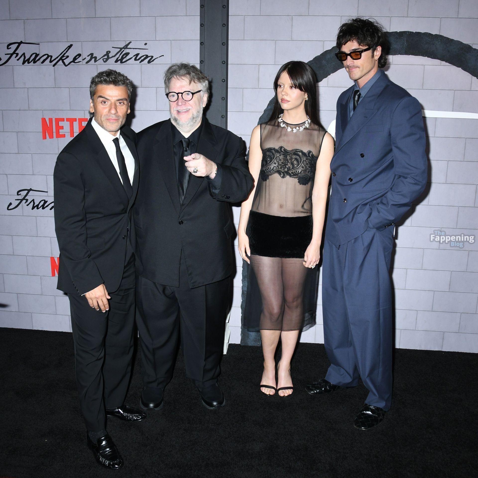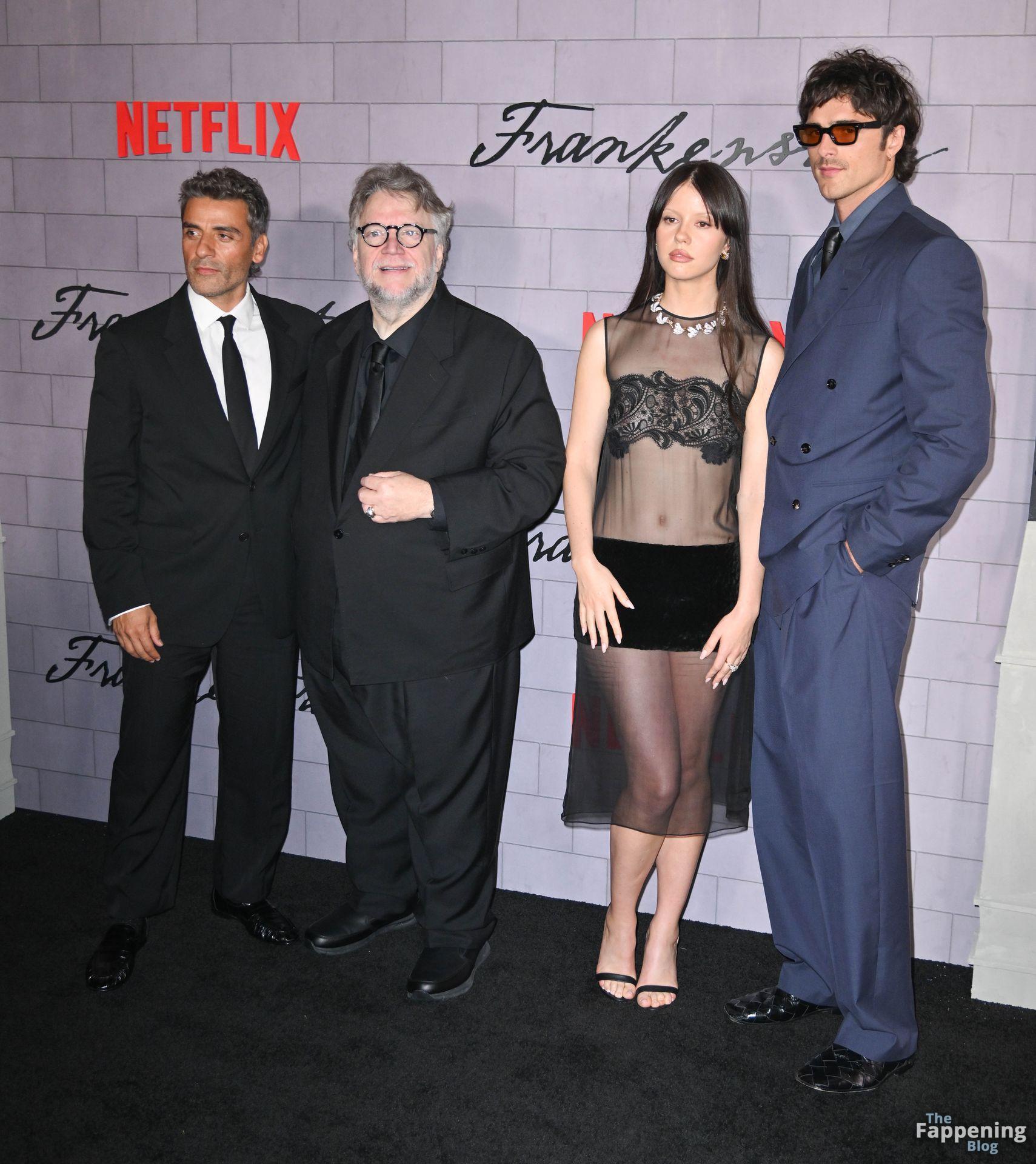 Actress Mia Goth was pictured at the Netflix special screening of “Frankenstein” at The Plaza Hotel in New York, NY, rockin’ a see-through dress by Ferragamo.