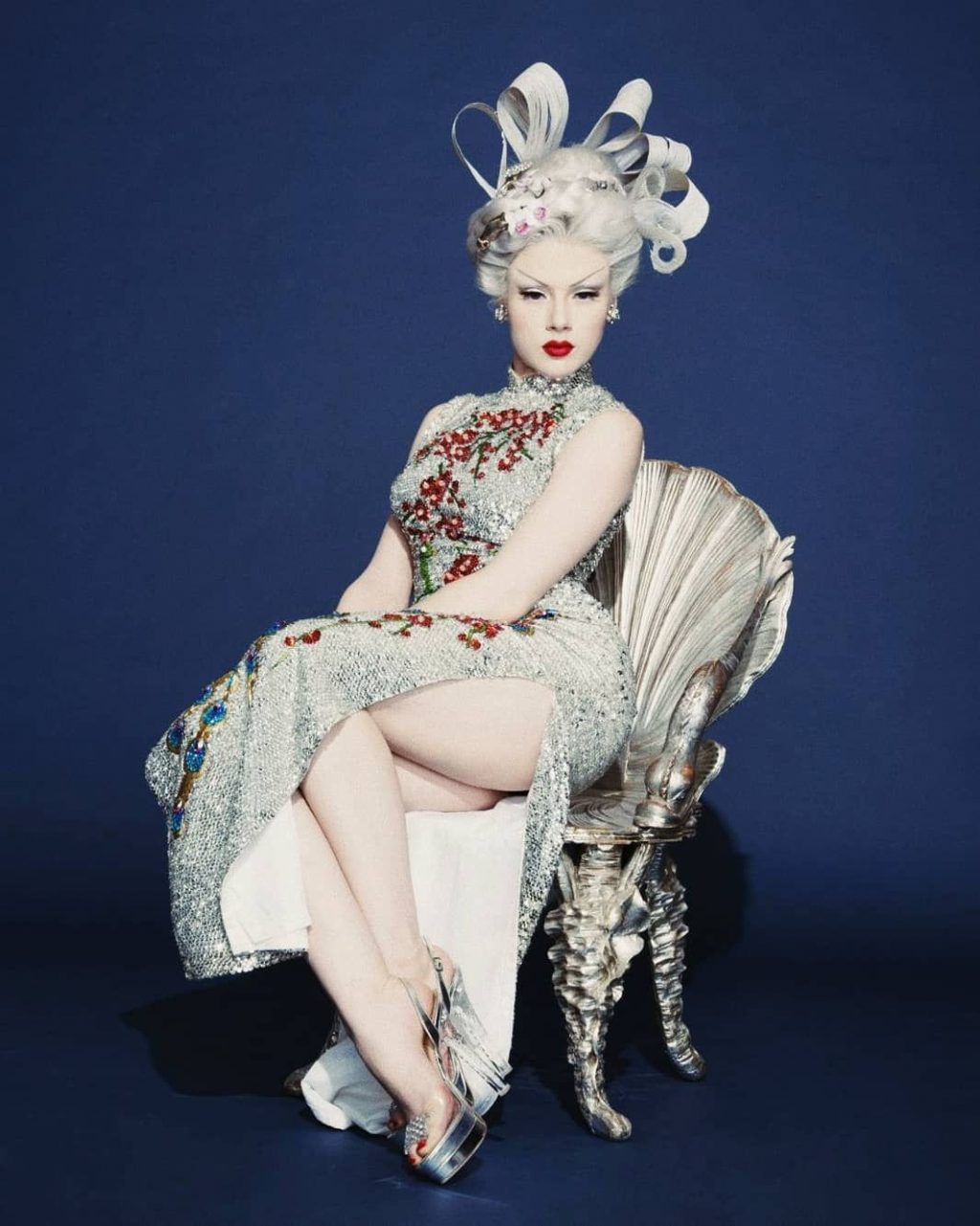 Her blonde hair with retro styling, brilliant make-up, and flawless determine are an integral portion of the image.