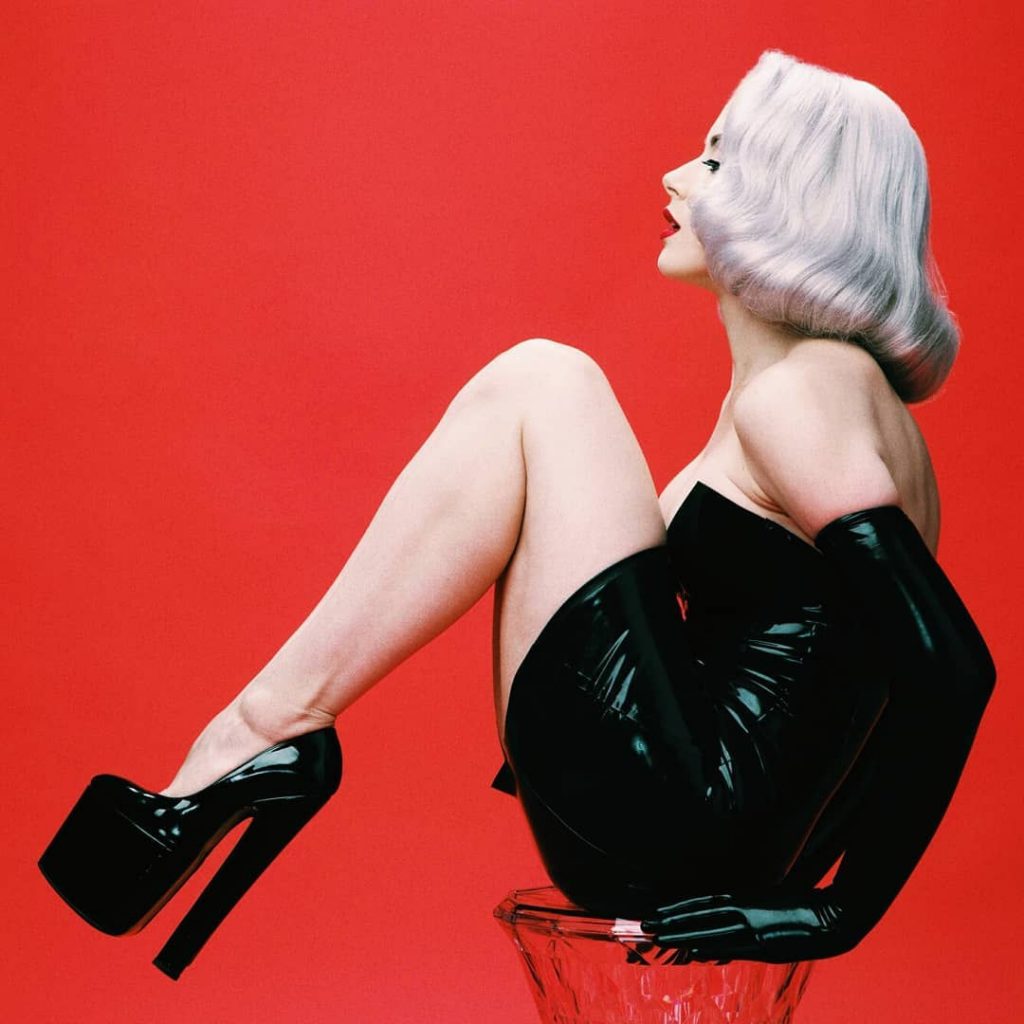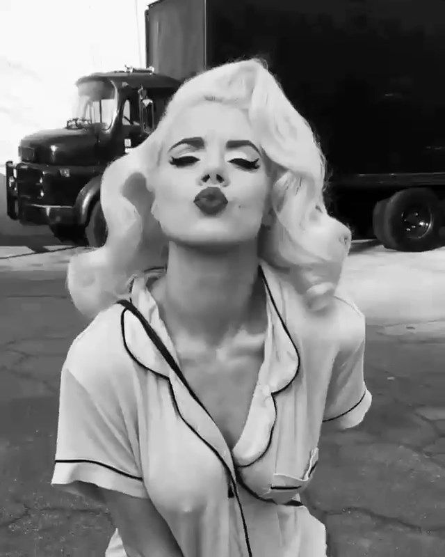 Her blonde hair with retro styling, shiny make-up, and flawless figure are an integral section of the image.