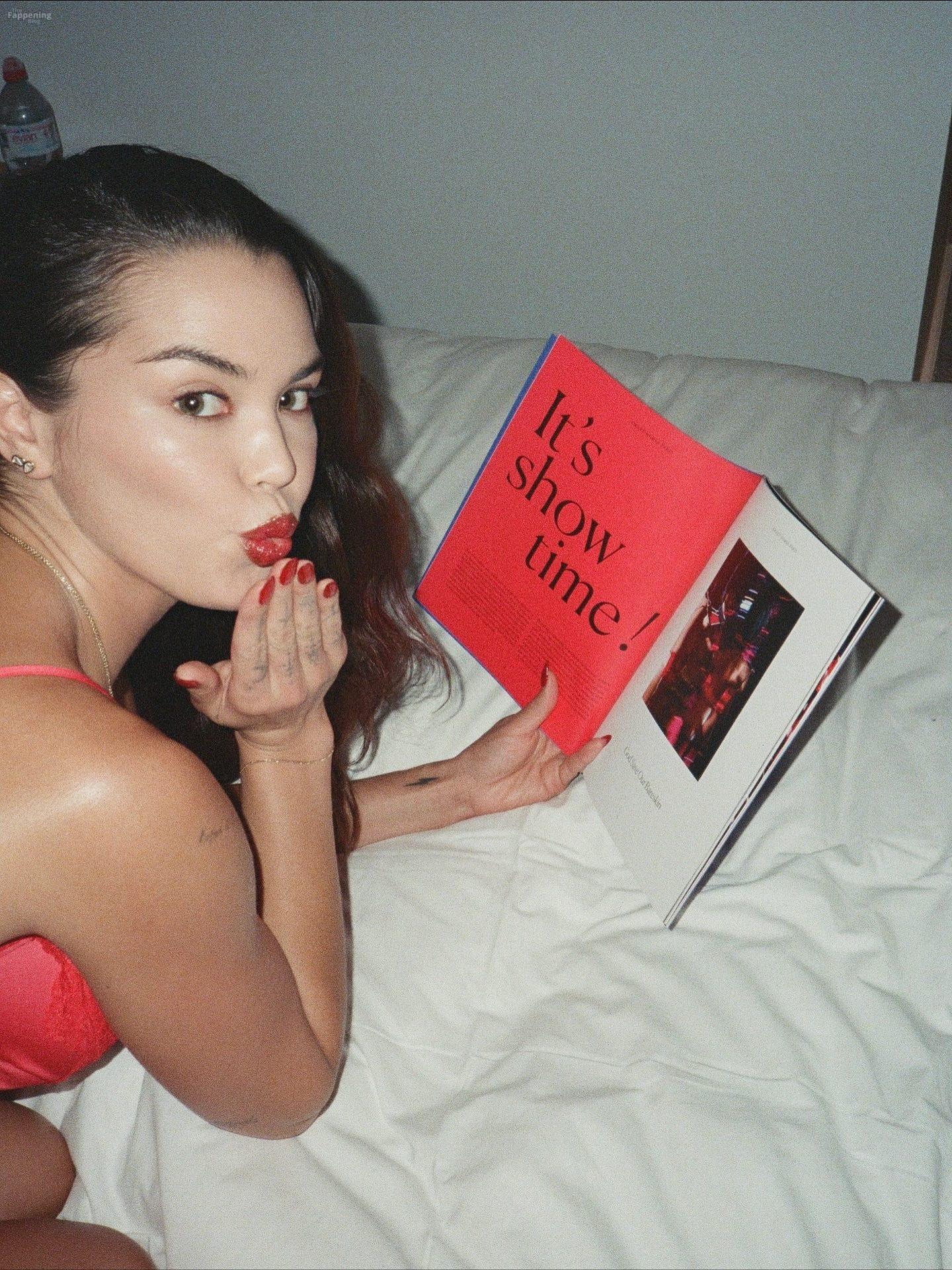 Model and actress Paris Berelc poses in a red lingerie set, showcasin’ her sexy figure in this bedroom shoot.
