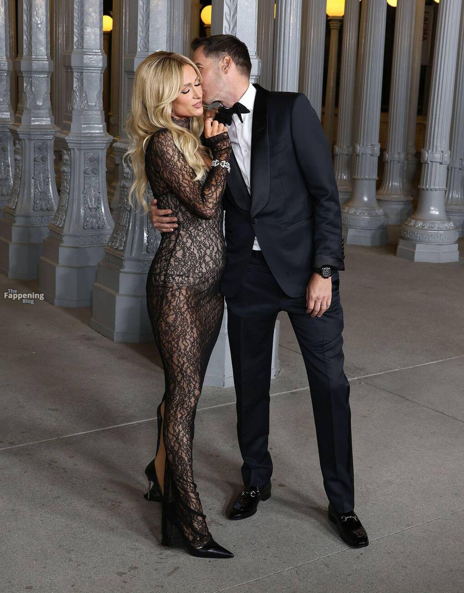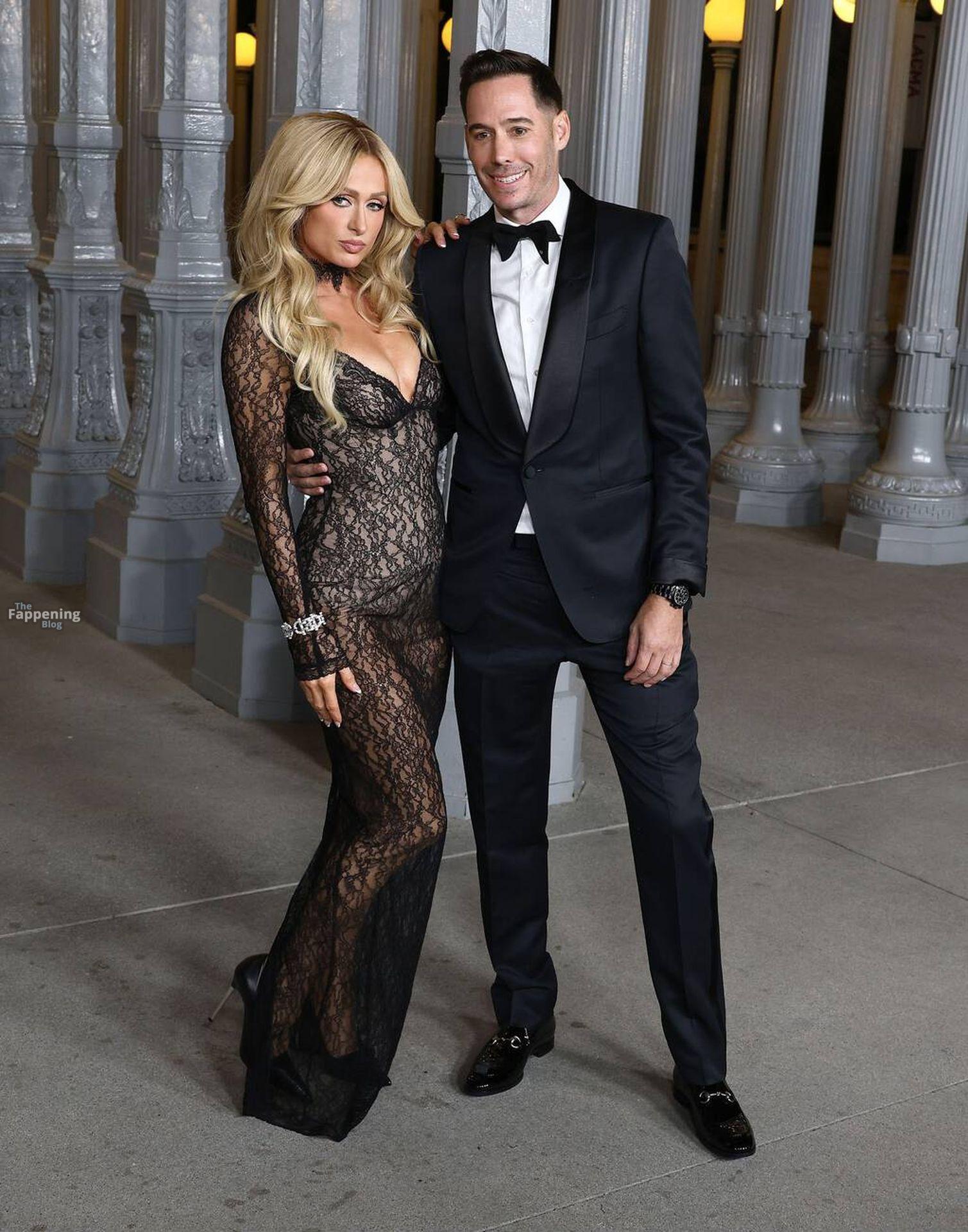 Paris Hilton showed up at the 2025 LACMA Art+Film Gala in Los Angeles, California. She posed for photos with her husband, Carter Reum, in a sheer lace gown with a plunging V-neckline over a nude bodysuit.