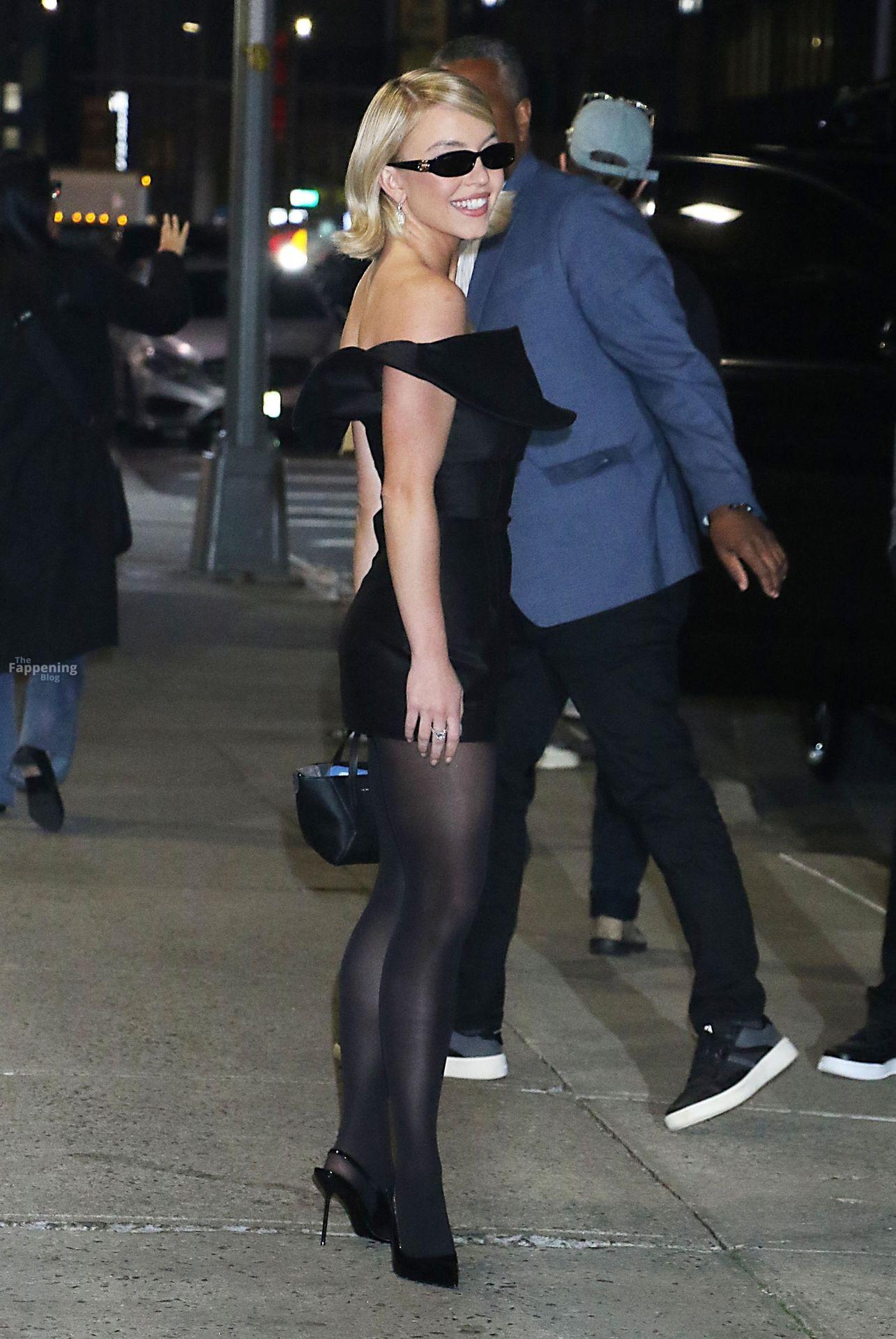 Sydney Sweeney lit up NYC after The Late Show with Stephen Colbert, wearin’ a black mini dress with sheer pantyhose that showed off her stunning legs.