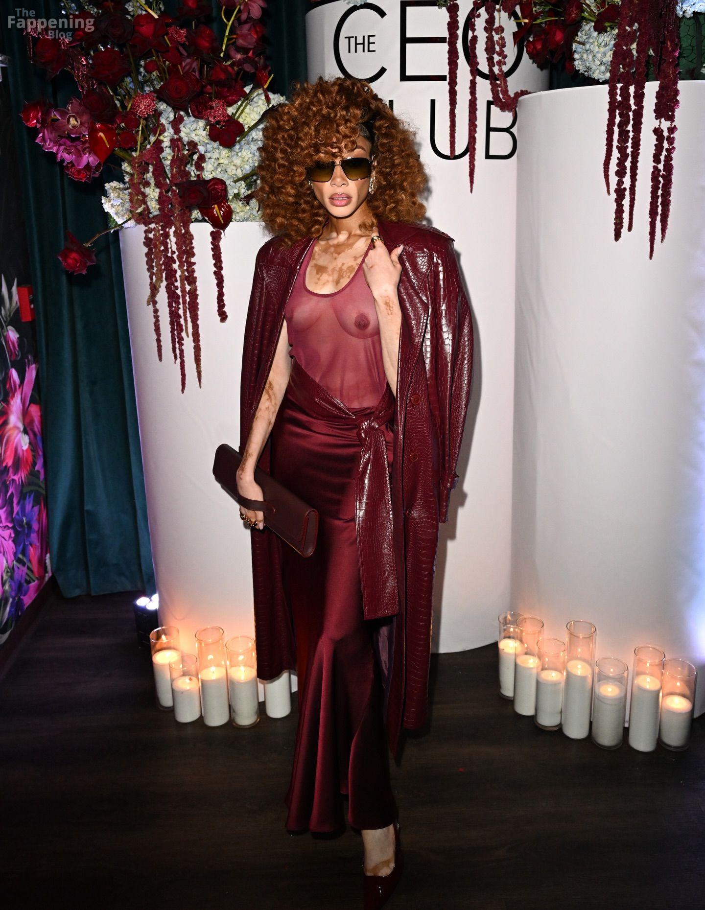 Model Winnie Harlow stuns without a bra, showing off her bare tits, while wearing a see-through top at the Miami CEO Club event.