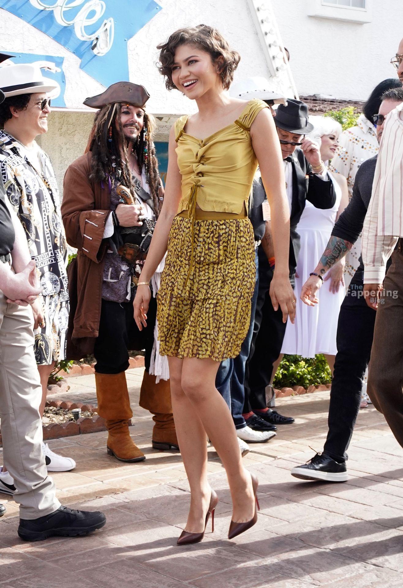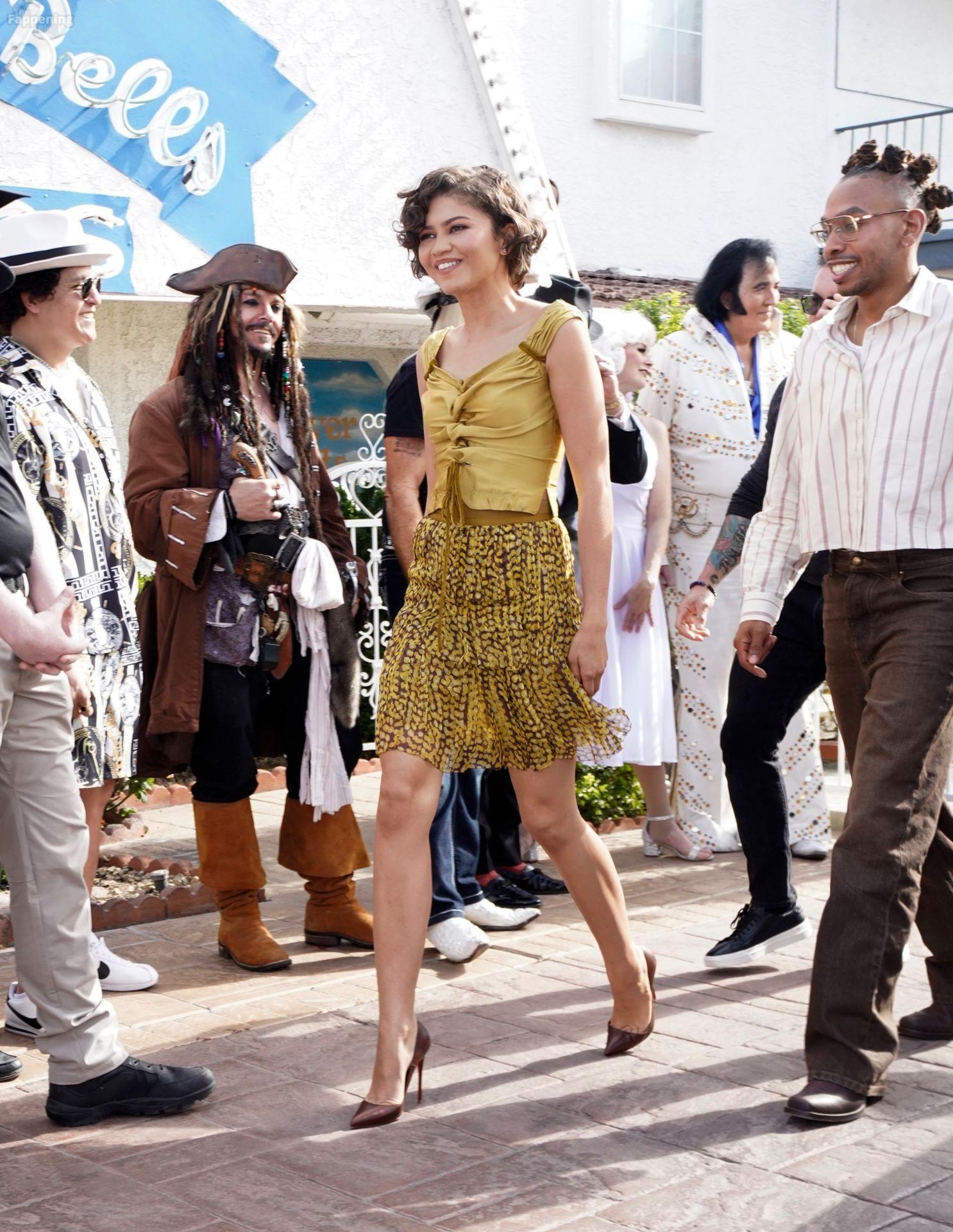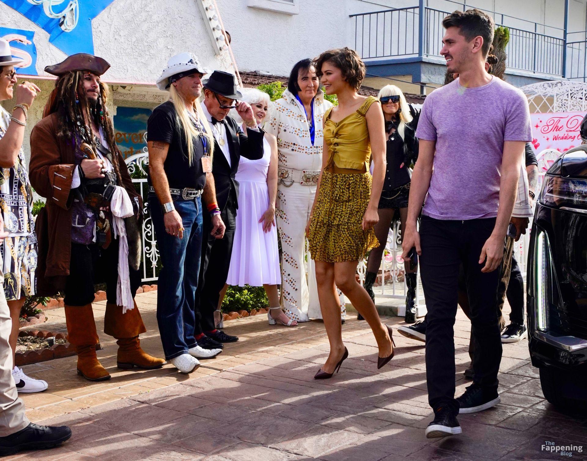Zendaya makes a surprise visit to a Las Vegas chapel promoting her upcoming film with Robert Pattinson. The actress meets up with musician Alana Haim, and the pair share a laugh while checking out the promotional displays, with Alana playfully noticing the ring on Zendaya’s wedding finger.