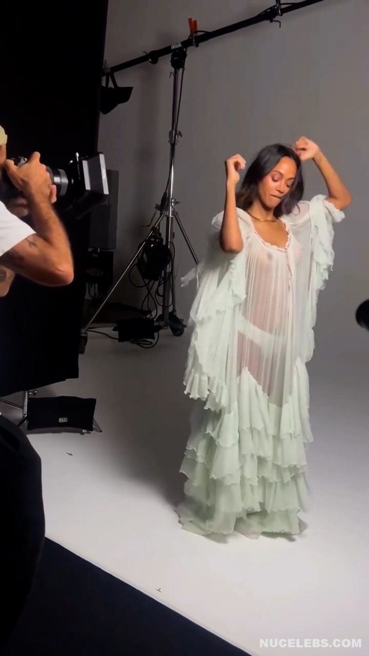 You definitely can’t miss this! Zoe Saldana shows her nude breasts for Vogue. At a recent photo shoot, the actress wore only white panties and a transparent dress. It’s a good thing she wasn’t wearing a bra underneath. Zoe Saldana nude tits look simply divine. It’s worth noting that this beauty is 47 years old, everyone definitely envies her!